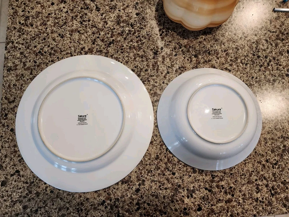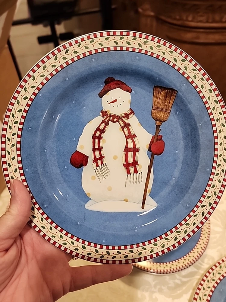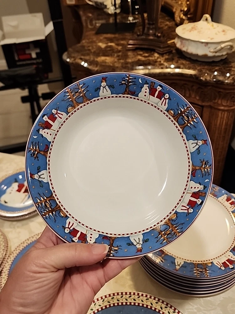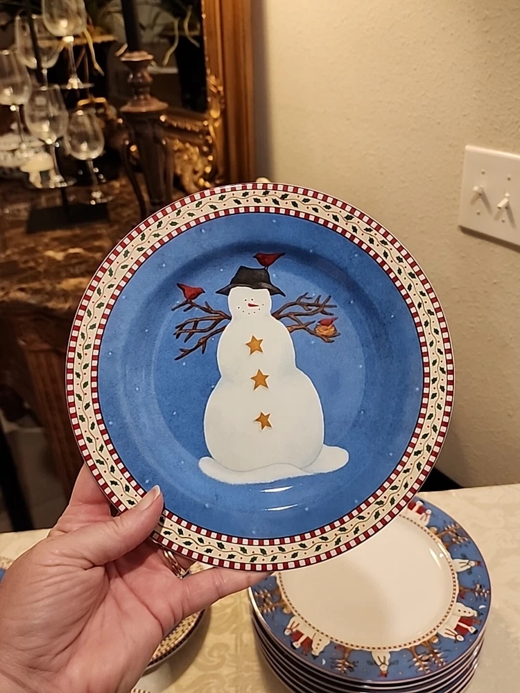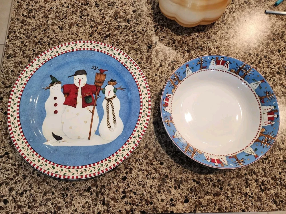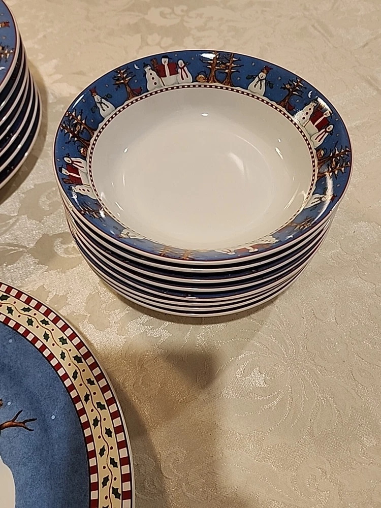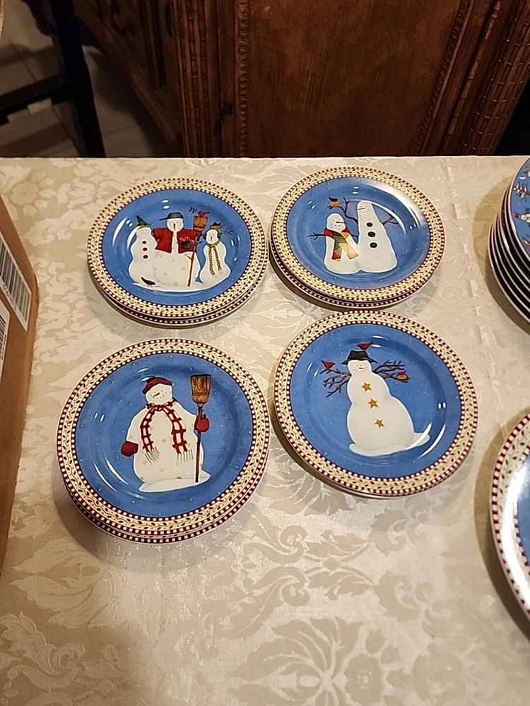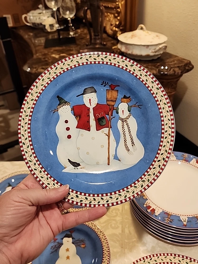Add a festive touch to your dining table this Christmas season with this VINTAGE 27-piece dinnerware set by Sakura, featuring the Snowman designs by Debbie Mumm! (8) Dinner Plates (8) Salad/Dessert Plates (w/ 4 designs) (8) Soup Bowls (2) Serving Platter - 12.5" (1) Serving Bowl - 9 1/2" The pictures only show 7 dinner plates, as the pictor were taken before we found the missing plate. But indeed, there are 8 dinner plates! :) We also found an extra platter and serving bowl (featured in the last few pics), for a total of 2 serving platters and 1 serving bowl.