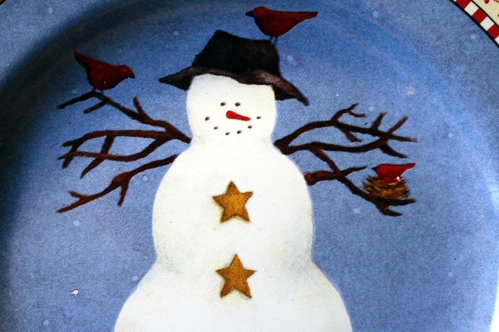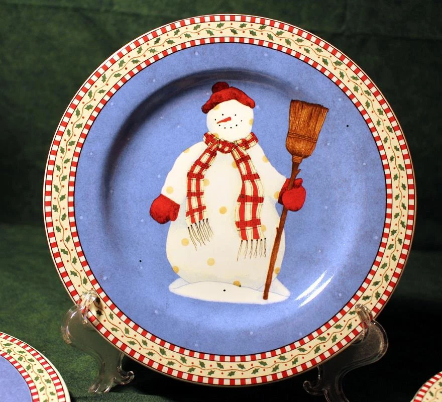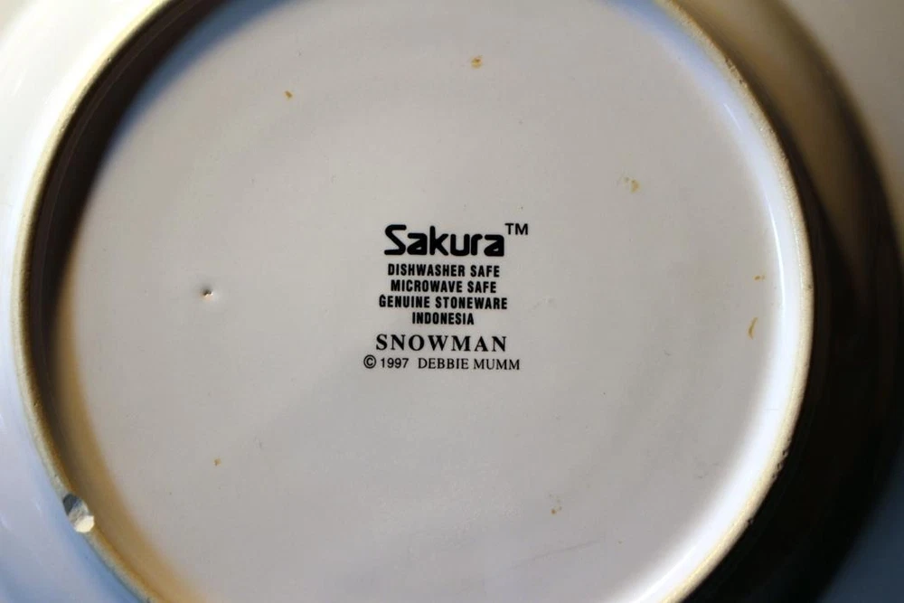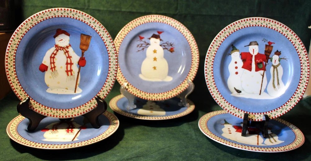 Set of 6 Sakura Debbie Mumm Snowmen salad plates. Two have the snowman with stick arms, two are the trio of snowmen and two are the single snowman with a broom. Oneida SNOWMAN Salad Plates Set of 6 Debbie Mumm S akura Snowmen Tree Snow Set of 6 Sakura Debbie Mumm Snowmen salad plates. Two have the snowman with stick arms, two are the trio of snowmen and two are the single snowman with a broom. Excellent USED with no cracks or crazing. One snowman with stick arms has scuff on his hat. One plate has chip on the foot on the back. The plates are is 8 1/4 in diameter. Get images that make Supersized seem small. THE simple solution for eBay sellers.
