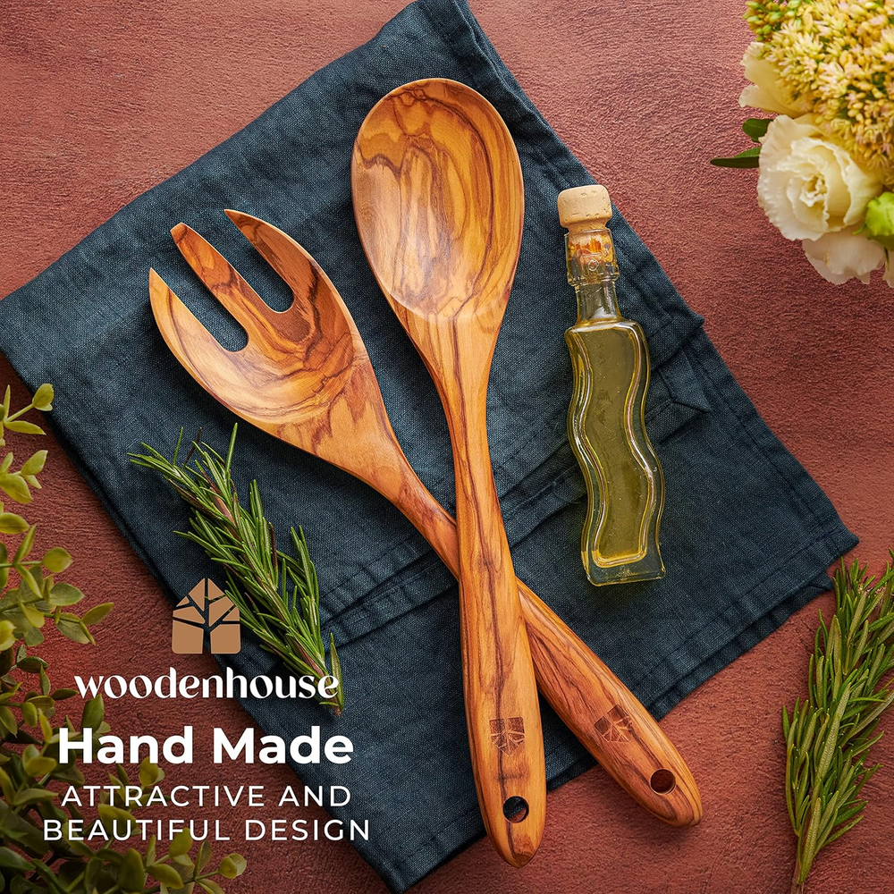 HomeSalad Tongs for Serving, Spoon Salad Utensils Set from Olive Wood, 12 Inches Woo