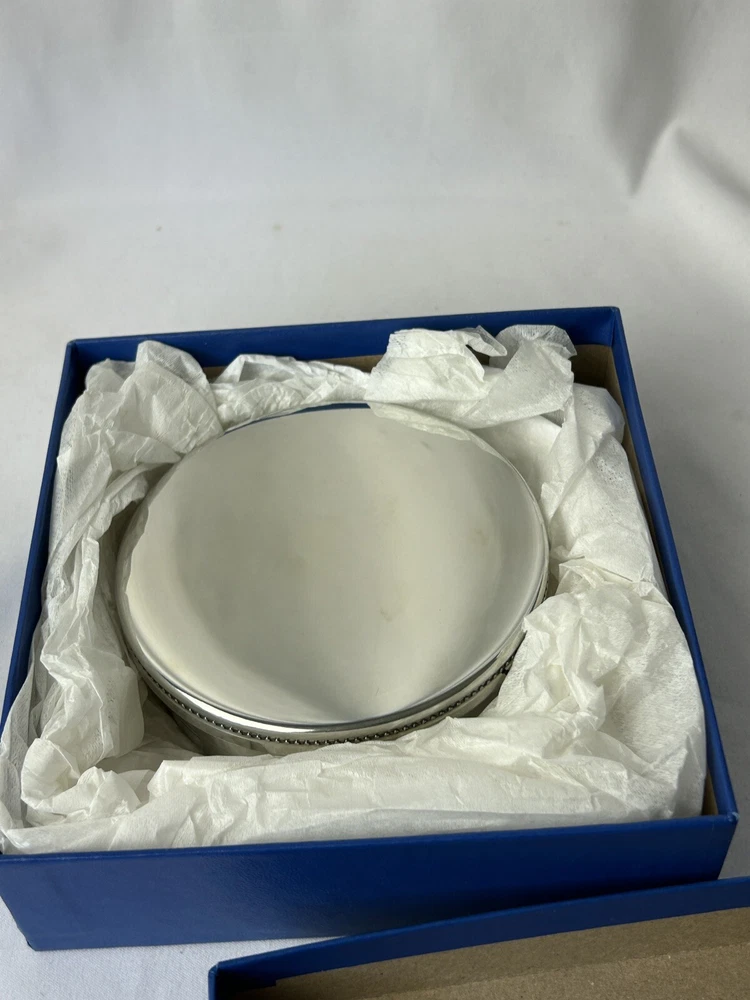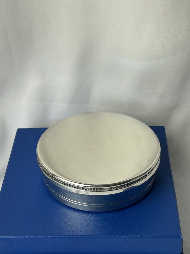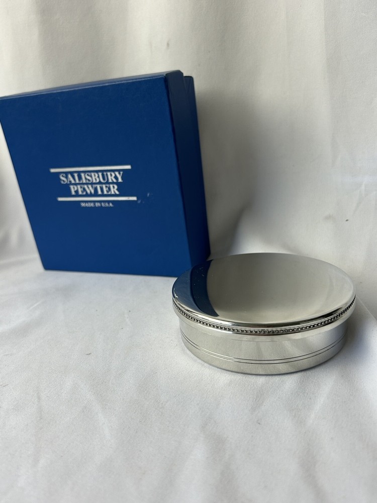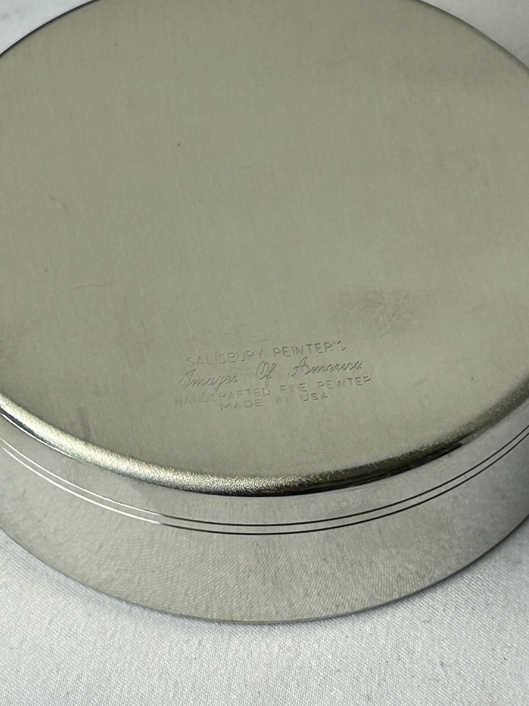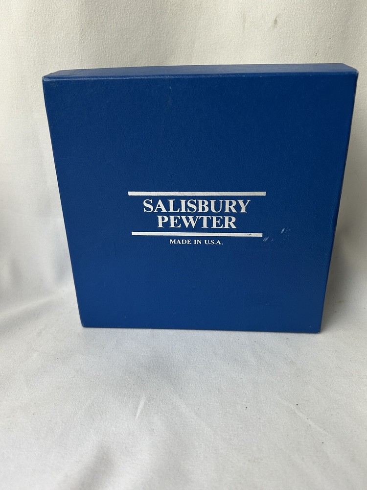 Salisbury Pewter Trinket Box Keepsake Jewelry Box Lid and Box BLUE Velvet Lined Classic Detailed Lid Marked on Bottom - Images of America. Handcrafted in Fine Pewter. Made in USA. 3.75" x 1.25" Tall Excellent Condition. Vintage. Comes in Original Box. Great item to be engraved or for any beloved keepsake or presentation box.