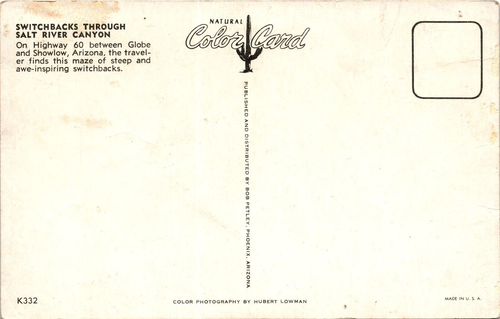 MAKE AN OFFER. THE MORE YOU BUY THE BETTER DEAL I WILL ACCEPT The postcard showcases the switchbacks through Salt River Canyon on Highway 60 between Globe and Showlow, Arizona. The switchbacks are described as steep and awe-inspiring, forming a maze-like path for travelers. The postcard features a color photograph taken by Hubert Lowman and is published and distributed by Bob Petley in Phoenix, Arizona.