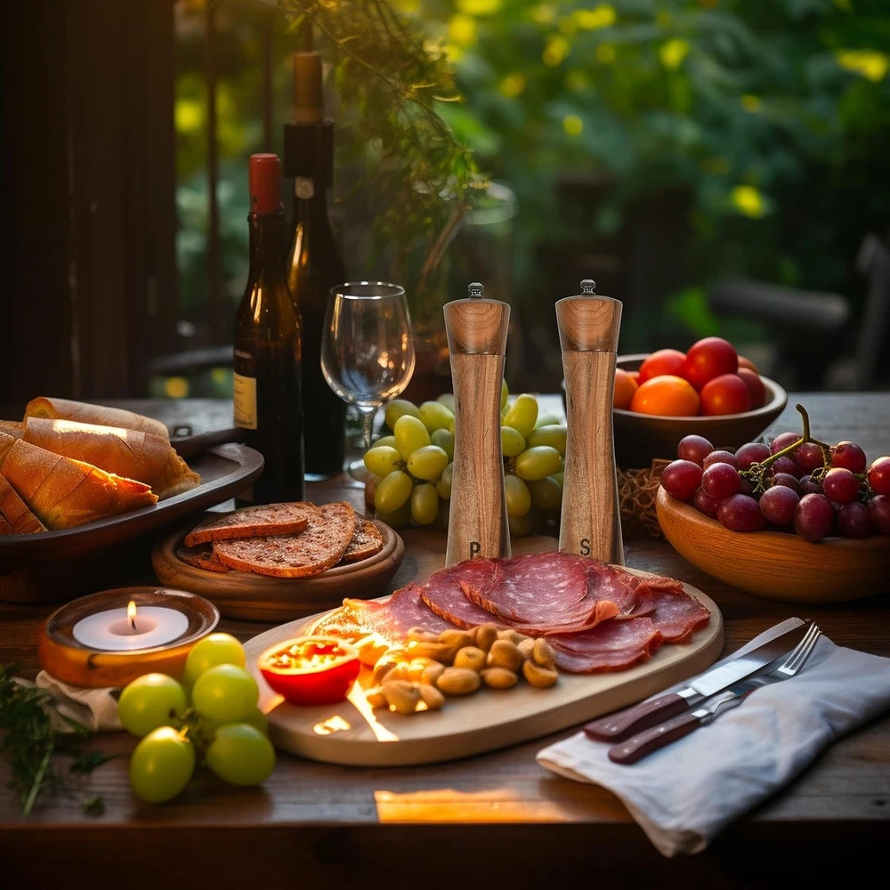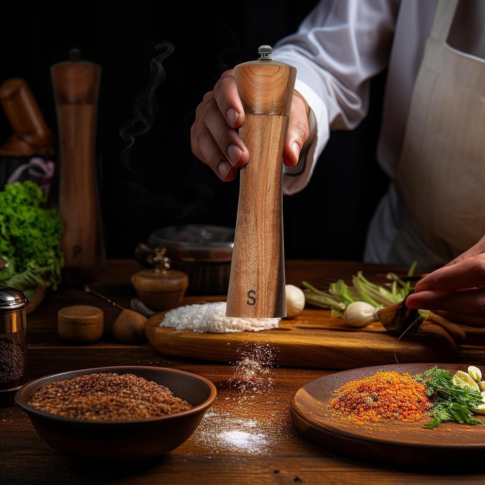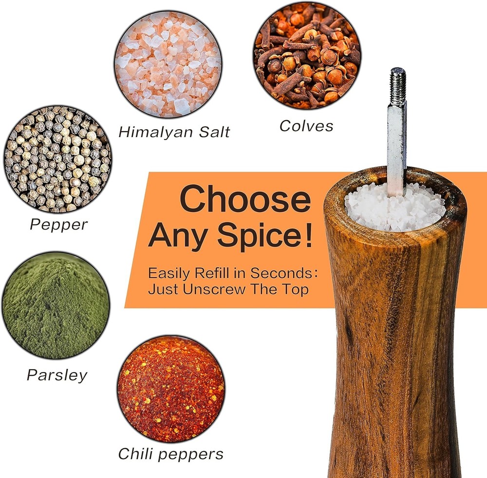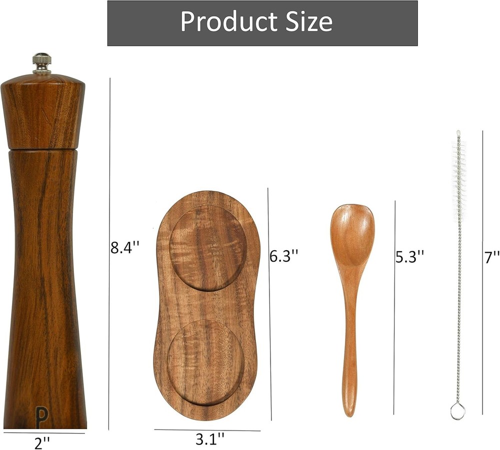 Salt and Pepper Grinder Set Acacia Wood Adjustable Pepper Mill Wooden Stand Product Description: GOOD MATERIAL - The salt and pepper grinder is made of solid wood and high quality stainless steel, no plastic parts, no paint smell, which makes it clean and durable in daily use BIG STORAGE VOLUME - The pepper mill is 8.5 inches height, which will not take up too much space in your cabinet. The capacity is 3 ounces, which can avoid repeated filling, keep the pepper and salt fresh and dry. E SMART DESIGN - The bottle body is printed with S and P symbols. Two different characters can help you distinguish different spices HIGH VALUE COMBINATION - A wooden stand is specially designed for this particular pepper mill, beautiful and convenient. It prevent your counter top from getting messy and makes it easier for you to move the grinders around. OUR SERVICE - We are confident of our product, feel free to email us if you have any questions, we promise to solve your problems within 24 hours.
