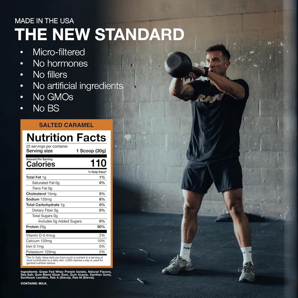 RAW Whey Isolate Protein Powder, Salted Caramel - 25 Servings (Pack of 1) Description Features: Salted Caramel Grass-Fed Whey Protein Powder: RAW Nutrition brings you our grass-fed micro-filtered isolate protein, complete with naturally occurring Branch Chain Amino Acids (BCAA). Each scoop packs 25 grams of protein with 0g of total fat and 1 gram of carbohydrates. 25 servings, 2.25 lbs. No Nonsense, All Flavor: We pride ourselves on creating products that perfectly balance the scales of quality and flavor. With our indulgent Salted Caramel flavor in your corner, building muscle has never tasted so good. Benefits of Protein: RAW Protein delivers the purest form of protein available, aiding digestion, supporting muscle growth and recovery, and providing a balanced source of amino acids and peptides. The New Standard: This hormone-free, micro-filtered protein powder with zero fillers has been crafted for supreme quality to help you meet your protein needs, recover fast and build lean muscle. Made in the USA. No artificial ingredients, no GMOs, no BS. Built From the Ground Up: RAW Nutrition was created to provide athletes with the best fuel for peak training and performance. Our mission is to make smart nutrition easy and convenient with expertly crafted supplements made with the purest ingredients available in the industry. Product Details: Product Dimensions : 5.5 x 5.5 x 10 inches; 2.03 Pounds Manufacturer : RAW Brand: RAW Flavor: Salted Caramel Protein Source: Whey Unit Count: 26.46 Ounce Number of Items: 1 Handling We will ship all orders within 1 business day of payment. Delivery We Do Not Ship Outside of the Continental US. Return Policy All items qualify for returns within 30 days of receipt. Buyer is responsible for return shipping on any item that is not damaged. Feedback We take our reputation seriously, we buy and sell online, so we understand the value of trust. If you are unsatisfied with your order, please contact us and we will work with you to resolve it to your satisfaction.