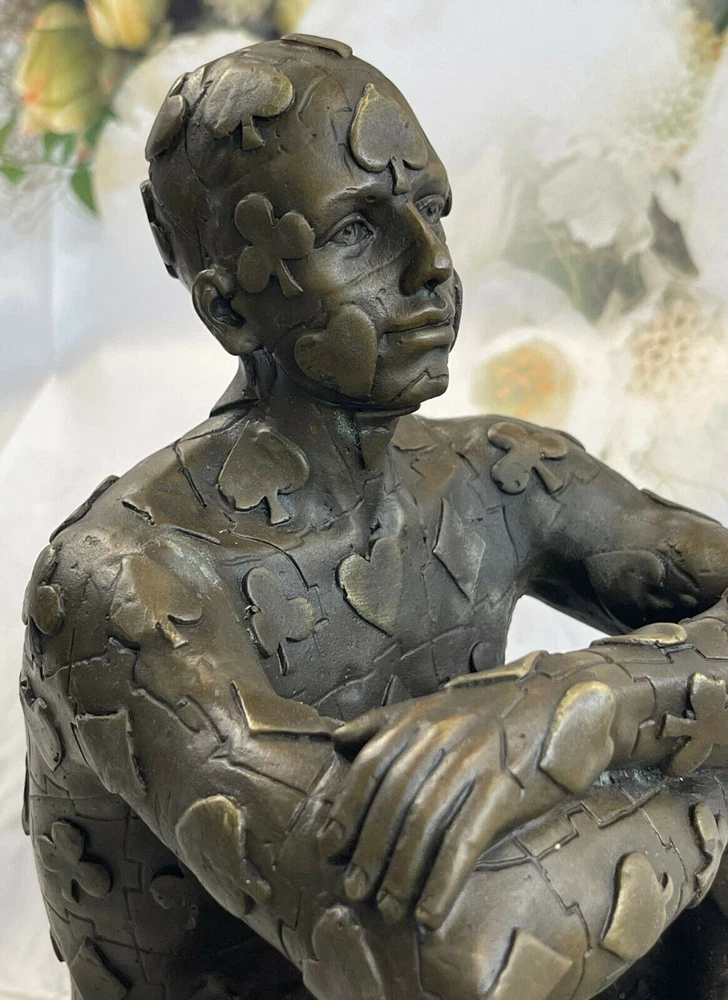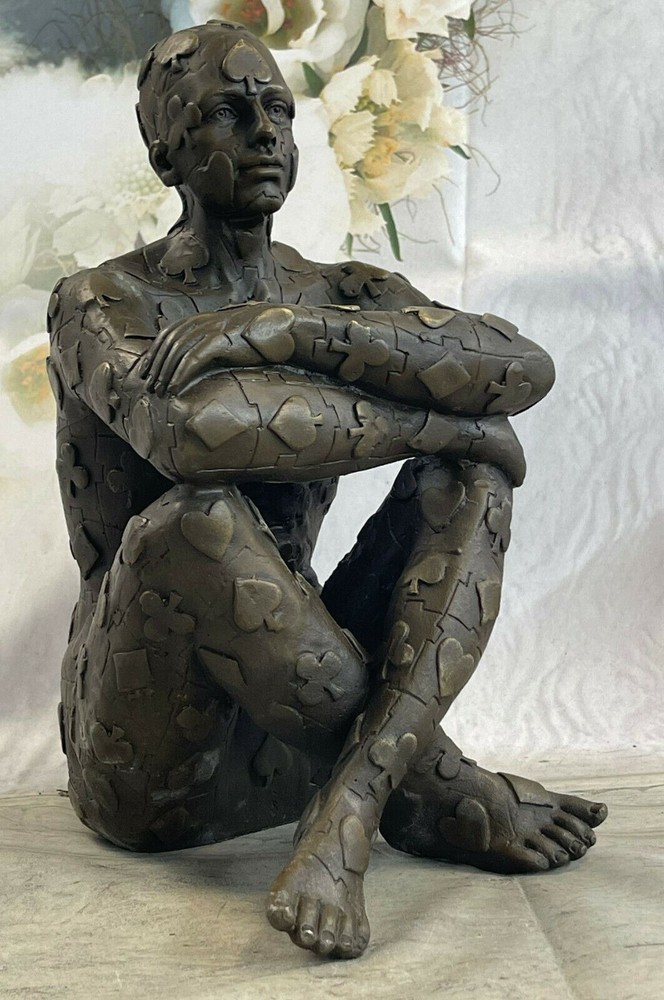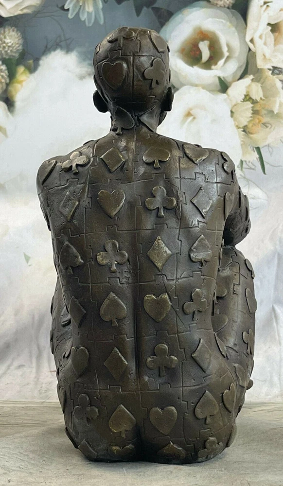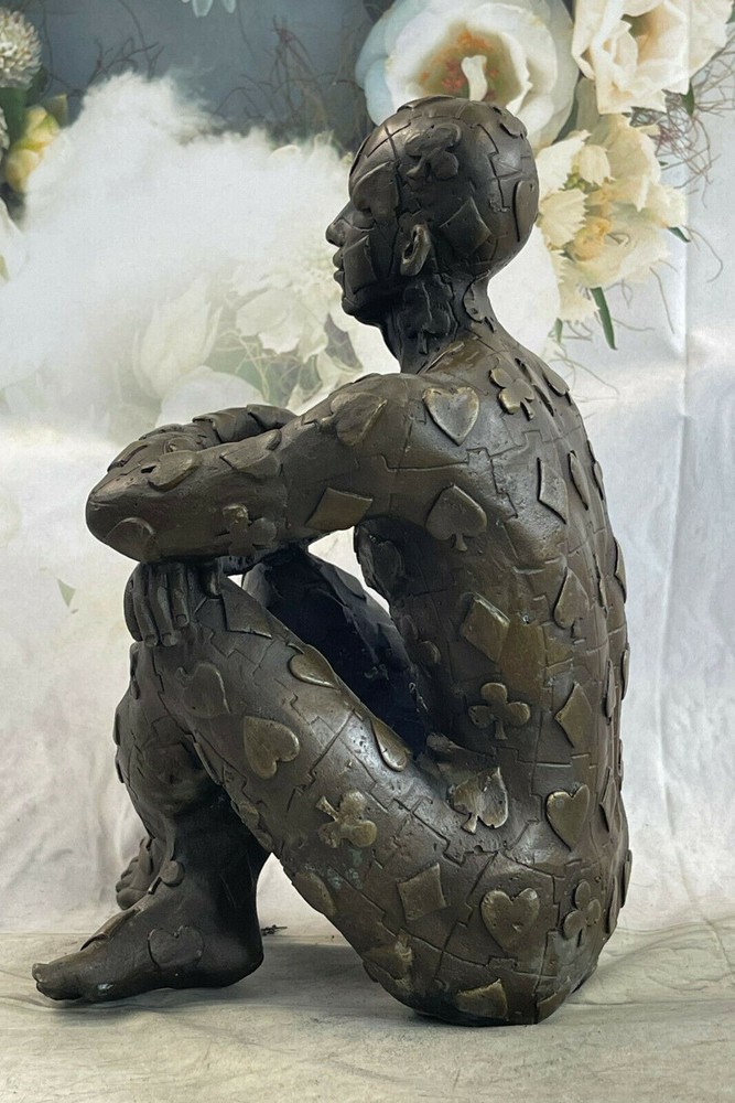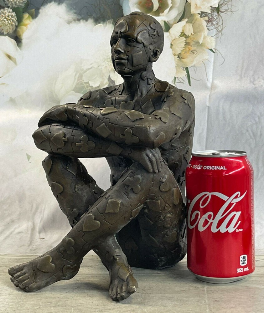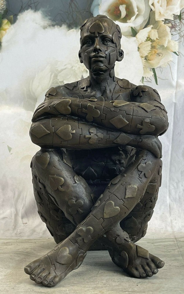 Condition : This sculpture is in perfect condition. Bronze Dimensions: Height nbsp;11" X Width 8" Weight:11 LBS Inventory:18YRD106281 Evoke intrigue and ignite conversations with this captivating abstract sculpture that defies convention and pushes artistic boundaries. At its core is a seated figure, dressed in a poker-themed attire, exuding an air of both confidence and mystery. The sculpture dares to venture beyond the ordinary, with the man's strong legs and physique taking center stage, while the rest of his form transforms into an intricate composition of geometric shapes. These shapes hint at the inner complexities of the human experience, inviting viewers to contemplate the interplay between the external and internal realms. Crafted through the venerable "Lost Wax Method," a technique renowned for its ability to yield intricate and finely detailed bronze sculptures, this piece stands as a testament to the melding of traditional craftsmanship and avant-garde artistic expression. The sculpture's brown patina finish enriches its texture and brings out its intricate features, creating an engaging interplay of light and shadows. A tribute to the surrealist genius Salvador Dali, this 100% handmade sculpture is a visual feast that challenges perceptions and offers a thought-provoking experience. Signed by the artist, it is more than a mere decorative piece – it's a conversation starter, an exploration of form and meaning, and a tribute to the ever-evolving realm of artistic innovation. Signed Original Tribute to Dali Man with Poker Outfit Bronze Sculpture Statue YRD-1062 Video will open in a new window Using the eBay App? Paste link into a browser window: [isdntekvideo]