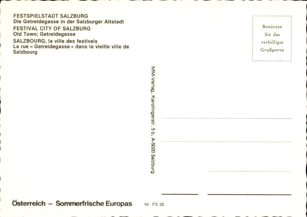 Explore the charming Old Town of Salzburg and its iconic street, Getreidegasse, captured in this 1929 postcard from HLC Foto Optik. Discover the vibrant festival atmosphere of Salzburg, known as the Festival City of Europe.