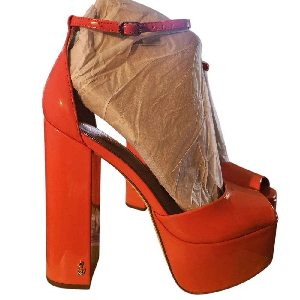 Sam Edelman Women's Orange Platform Heels in size 7.5, featuring an open toe design with a buckle closure. These ultra high heels have a 2-inch platform height and a block heel style. These solid orange heels are perfect for any occasion. Slight wear on bottom from trying on.