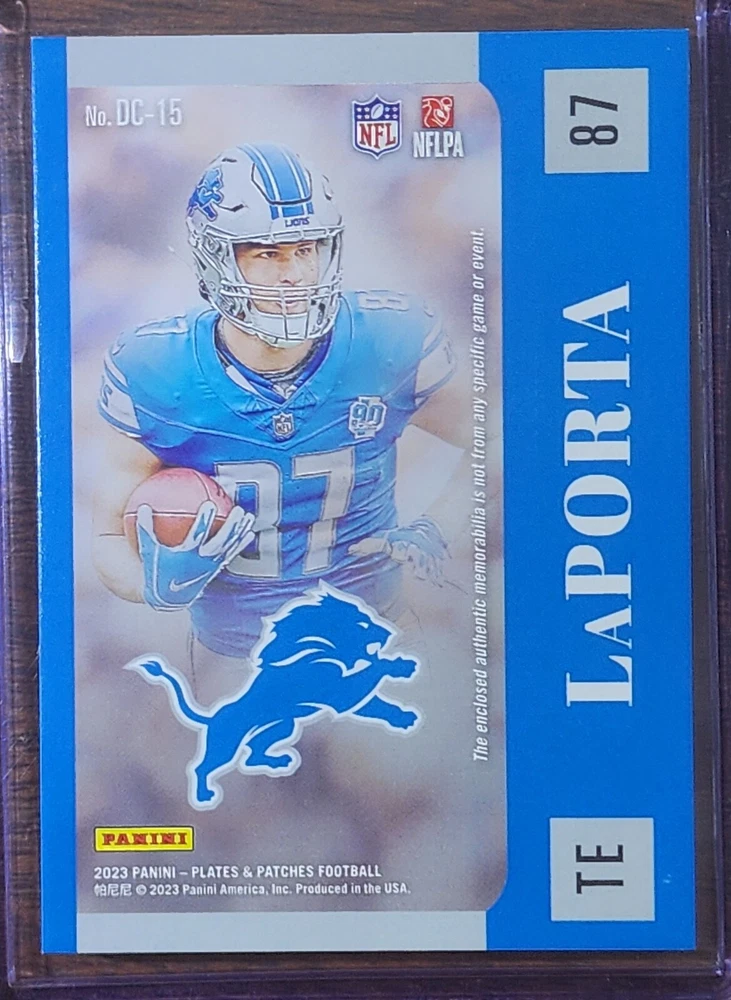 Season: 2023 Features: Memorabilia, Rookie, Serial Numbered, Short Print Set: 2023 Panini Plates & Patches Parallel/Variety: Laundry Tag Manufacturer: Panini Type: Sports Trading Card Player/Athlete: Sam LaPorta Team: Detroit Lions League: National Football League (NFL) Sport: Football