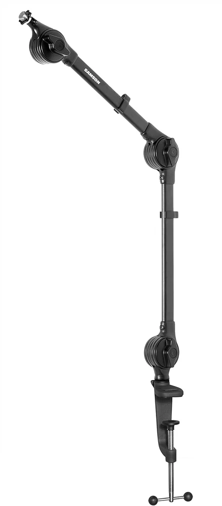 Highly adjustable microphone boom enables horizontal and vertical positioning for optimal microphone placement 26??? of maximum arm reach gives users max microphone placement versatility; ideal for podcasting, broadcasting, streaming and voice recording setups Boom arm offers 5/8???-27 mic clip threading for easy microphone integration Can be easily attached to a desk or tabletop with sturdy C-clamp mount Quick release friction hinges Sturdy aluminum construction supports microphones up to 5lb. (2. 3kg) The Samson MBA26 Microphone Boom Arm is the perfect microphone accessory for podcasters, streamers, content creators and radio broadcasters. The durable aluminum construction and articulating design of the MBA26 provides a total arm reach of 26" while accommodating any mic weighing up to five pounds. Quick release friction hinges hold the stand at the desired angle and allow for easy and silent positioning to achieve optimal mic placement. The MBA26 can be attached to a table or desk with the included C-clamp mount which can swivel 360, perfect for any setup.