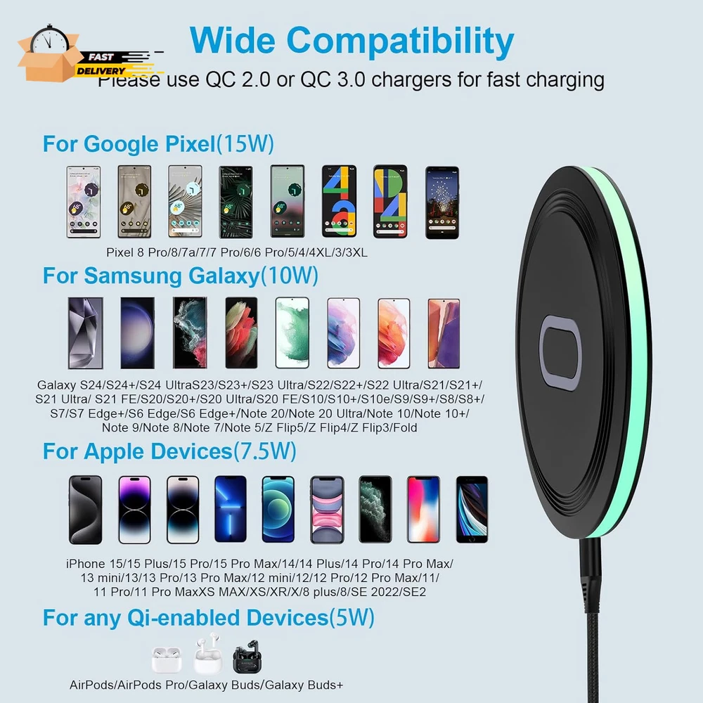 Store New Arrivals Add to Favorite View Feedback Contact Samsung Fast Wireless Charger Pad, 2 Pack 15W Wireless Charging Pad Fast Charging Station for Samsung Galaxy S24 S23 FE S23 S22 S21 Note 20,Iphone 16 15 14 13 Pro Max,Google Pixel 9 8A 8Pro 7A 7Pro 6 Description Total Usb Ports 1 Number of Items 66 Power Source Corded Electric Unit Count 2.0 Count Main Power Connector Type 3 Pin Material Silicone Connector Type Used on Cable USB Type A Input Voltage 12 Volts Package Type FFP (Flat Free Package) Energy Specifications Met Qi Additional Features Lightweight Design, Fast Charging, Wireless Charging Connector Type USB Type A Item Weight 0.18 Kilograms Connectivity Technology USB Power Plug Type A - 2 pin (North American) Special Feature Lightweight Design, Fast Charging, Wireless Charging Compatible Phone Models function(f) {var _np=(window.P._namespace("DetailPageProductOverviewTemplatesJava"));if(_np.guardFatal){_np.guardFatal(f)(_np);}else{f(_np);}}(function(P) { P.when('A').execute(function(A){ A.on('a:truncate:po-attribute-truncate-4:updated', function(data) { var isTruncated = !data.truncateInstance.getIfTextFits(); var seeMoreElement = document.getElementById('po-attribute-see-more-id-4'); if(seeMoreElement) { seeMoreElement.style.display = isTruncated ? '' : 'none'; } }) }); })); Samsung Galaxy S24 / S24+ / S24 Ultra / S23 FE / S23 / S23+ / S23 Ultra / S22 / S22+ / S22 Ultra / S21 / S21+ / S21 Ultra / S21 FE / S20 / S20+ / S20 Ultra / S20 FE / S10 / S10+ / S10e / S9 / S9+ / S8 / S8+ / S7 / S7 Edge+ / S6 Edge / S6 Edge+ / Note 20 / Note 20 Ultra / Note 10 / Note 10+ / Note 9 / Note 8 / Note 7 / Note 5 / Z Flip4 / Z Flip3, Google Pixel 9 Pro XL / 9 / 8a / 8 Pro / 8 / 7a / 7 / 7 Pro / 6 / 6 Pro / 5 / 4 / 4 XL / 3 / 3 XL, iPhone 16 / 16 Plus / 16 Pro / 16 Pro Max / 15 / 15 Plus / 15 Pro / 15 Pro Max /14 / 14 Plus / 14 Pro / 14 Pro Max / 13 mini / 13 / 13 Pro / 13 Pro Max / 12 mini / 12 / 12 Pro / 12 Pro Max / 11 / 11 Pro / 11 Pro Max / XS MAX /XS / XR / X / 8 plus / 8 / SE 2022 / SE2 See more Mount Type Tabletop Mount Amperage 1.25 Amps Portable No Mounting Type Tabletop Mount Color 2 Pack Wireless Charging Wattage 15 watts Compatible Devices Google Pixel,Samsung Galaxy,iPhone Output Voltage 5 Volts Built-In Media 2 Samsung Wireless Charging Pads Included Components 2 Samsung Wireless Charging Pads 【15W Fast Wireless Charger Pad is Superior Compatibility】15W Samsung wireless charger pad is compatible with iPhone 16 15 14 13 12 11 Pro/Mini/Pro Max, SE 2022, XS XR X 8 Plus; Google Pixel 9/9 Pro XL/8a/8 Pro/8/7a/7 Pro/7/6 Pro/6/5/4/4 XL/3/3 XL;Samsung Galaxy S24/S24+/S24 Ultra/S23 FE/S23/S23+/S23 Ultra/S22/S22+/S22 Ultra/S21/S21 FE/S21+/S21 Ultra/S20/S20 FE/S20+/S20 Ultra/S10e/S10/S10+/S9/S9+/S8/S8+/S7 Edge/Note 20/Note 10/Note9/Note8Z Fold5/Z Flip5; AirPods, AirPods Pro, Galaxy Buds.(Not Compatible with iPhone 6 6s 7 Plus;Samsung A Series likes A53;Google 6a) 【Wireless Charge Safe & Reliable Charging】JoHouer Samsung S24 S23 wireless charger pad fast charging station provides 15W fast wireless charging and every charger has been rigorously tested to ensure a secured and easy charging experience, preventing the wireless charger pad, and your phone from overcharging, over current, over voltage, over heating, and short circuit, giving your phone multiple protection. 【15W Max Output High Speed Charging】The 15W Max Output Pixel 8 Pro Fast Wireless Charger Pad up to 2X faster than standard wireless charger. Fast Wireless Charger provides 15W for Google Pixel 9,9 Pro XL,8a,8 Pro,8,7a,7 Pro,7,6 Pro,6; 10W for Samsung Galaxy S24,S23 FE,S23,S22,S21; 7.5W output compatible with iPhone 16 15 14 13 12 11 Series; and 5W for other smartphones or wireless earbuds like AirPods & Galaxy Buds. Note: QC 2.0/3.0 adapter will be highly recommended (Adapter not included). 【Easy Charging Samsung Wireless Charging Station】This samsung fast wirless charger will let you free from plugging and unplugging the charging cables, just put your devices on the center of the wireless charger to start charging. The Pixel Wireless charger pad can work with plastic/rubber/TPU cases up to 5mm thickness. Cases made of metal, cases with attachments such as magnets, metal ring, pop socket, cards, grips will interfere charging. 【What You Get】2* 15W Samsung Wireless Charging Pad, (Note: AC adapter NOT included),worry-free 24-month warranty, and friendly customer service. JoHouer 2 PACK 15W Samsung S24 Wireless Charging Pad Fast Charging Station for Google Pixel 8a 8 Pro 8 7a 7 Pro 6 Pro 6 5 1.Please choose a 5V-2A charging adapter or 9V-2A fast charging adapter. 2. The silicone material on the top and bottom of this Wireless Charger station makes the charging more stable and your phone would not slide easily. 2. JoHouer Samsung S24 wireless charger pad stand can charge directly through phone protective cases ≤5mm, no need to disassemble the shell (Metal casing and foreign objects interfere with charging.) 3. The LED indicator lets you know the charging status. 4. This fast samsung wireless charging pad adapter NOT included. 15W Wireless Charging Pad Input: 5V-2A / 9V-2A / 12V-1.5A Output: 5W / 7.5W / 10W /15W Wireless Charging Pad Compatibility With: 15W Fast Charging Mode:Using QC2.0/QC3.0 Adapter Google Pixel 9 Pro XL/9/9 Pro/9 Pro Fold Google Pixel 8a/8 Pro/8 Google Pixel 7a/7/7 Pro Google Pixel 6/6 Pro (not work with Google Pixel 6a) Google Pixel 5 Google Pixel 4/4 XL Google Pixel 3/3 XL 10W Fast Charging Mode:Using QC2.0/QC3.0 Adapter Samsung Galaxy S24/S24+/S24 Ultra Samsung Galaxy S23 FE/S23/S23+/S23 Ultra Samsung Galaxy S22/S22+/S22 Ultra Samsung Galaxy S21/S21+/S21 Ultra/S21 FE Samsung Galaxy S20/S20+/S20 Ultra/S20 FE Samsung Galaxy S10/S10+/S10e Samsung Galaxy S9/S9+ Samsung Galaxy S8/S8+ Samsung Galaxy S7/S7 Edge+ Samsung Galaxy S6 Edge/S6 Edge+ Samsung Galaxy Note 20/Note 20 Ultra Samsung Galaxy Note 10/Note 10+ Samsung Galaxy Note 9 Samsung Galaxy Note 8 Samsung Galaxy Note 7 Samsung Galaxy Note