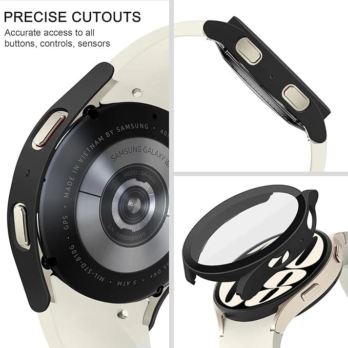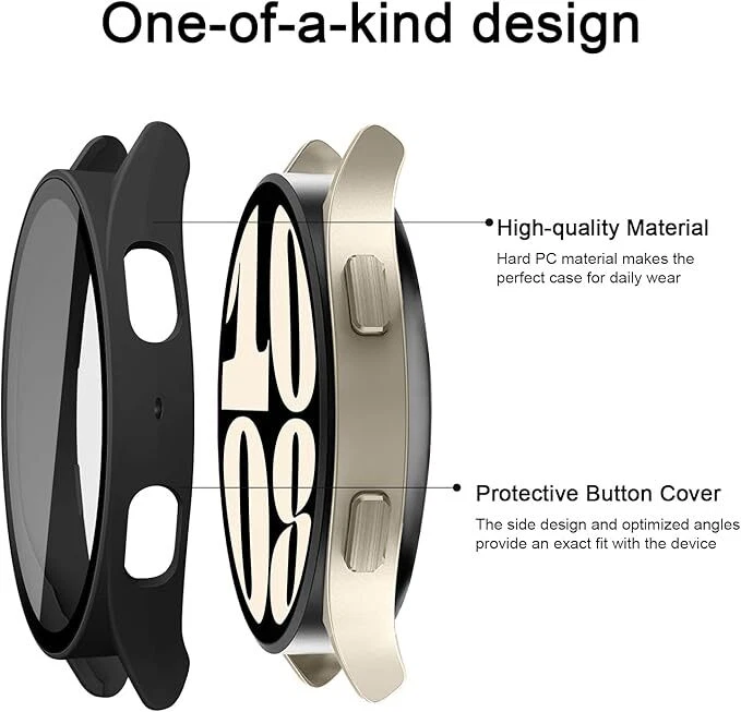 Features: √ High-quality PC case with built in screen protector, designed for Samsung Galaxy Watch 4 40mm/44mm.Samsung Galaxy Watch 5 40mm/44mm. Samsung Galaxy Watch 6 40mm/44mm. √ Ultra thin lightweight design not add any bulk and you will not lose any touch sensitivity. √ All-around protection design keeps the watch screen and four sides away from scratches and damages. √ Designed with precise cutouts for functional buttons and ports. Easy access to all controls, buttons, sensors and iwatch features. √ Quick and easy installation. you don’t need to remove band when installing the case. Product Included: 1 x Hard Full Screen Protector Case Cover( Cases Only, SmartWatch and Watch Band are not included! )