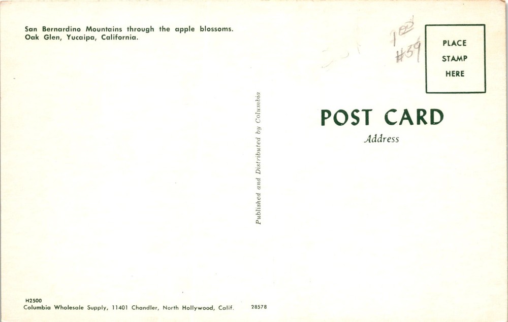 The postcard features a picturesque view of the San Bernardino Mountains framed by blooming apple blossoms in Oak Glen, Yucaipa, California. The postcard is part of a series published and distributed by Columbia Wholesale Supply in North Hollywood, California. The postcard has a reference number of H2500 and a publication number of 28578.