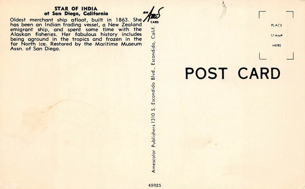 San Diego California Harbor Star of India Sailing Ship Vessel Vtg Postcard B24