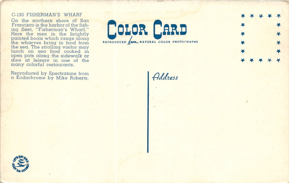 The front of the postcard depicts a C-130 aircraft flying over Fisherman's Wharf in San Francisco. Fisherman's Wharf is located on the northern shore of San Francisco and is a popular tourist destination known for its fishing fleet and seafood restaurants.