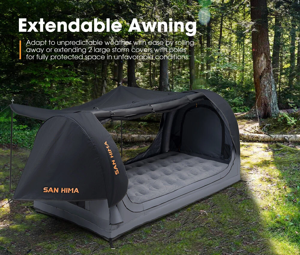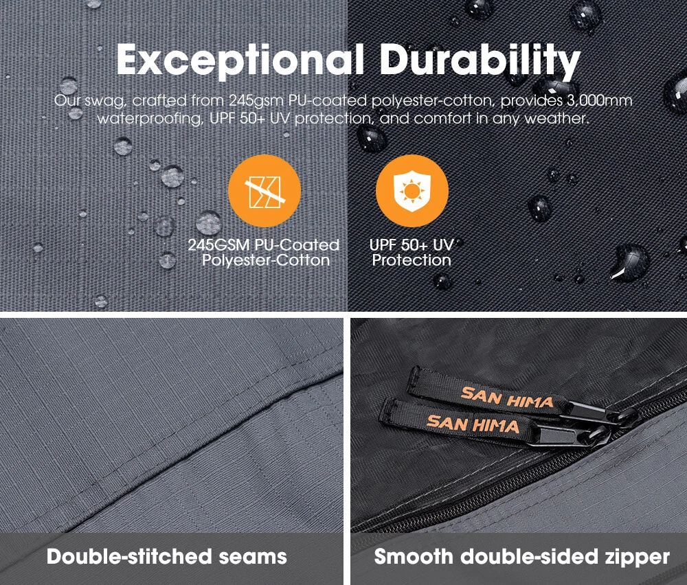 Discover the future of swag with the air pole swag by San Hima. Say goodbye to cumbersome pole assemblies and embrace the ease and speed of setup with our innovative air poles. Experience unparalleled comfort, durability, and a hassle-free camping adventure with our single swag. With our air swag, instant setup is a reality. Just connect the hurricane pump to the inflation point, and you're ready to go. Crafted from 245gsm PU-coated polyester-cotton and 600gsm PVC floor, our swag ensures strength and reliability. Plus. It's impressively larger in size compared to aluminum poles swags while being lighter at just 19.75 lbs. Stay shielded from the elements with its UPF 50+ UV protection and a 3,000mm waterproof rating, complete with rain covers and waterproof tape sealing to keep you dry in Free Shipping Most Items Visit Our Store menu mobile Automotive & 4x4 Truck & Trailer Parts Sports & Outdoors Home & Garden Help Key Features Easy Setup & Storage: Effortlessly set up and deflate our swag with included hurricane air pump using a single inflation point and the air valve, and neatly store it using included bags. Roomy yet Lightweight: Impressively larger in size to aluminum poles swag while lighter at 19.75 lbs for easy storage, and equipped with 4 inner storage pockets for your essentials. Deluxe Air Mattress: Inflated effortlessly with the included electric air pump, our mattress offers effortless storage, easily rolled up with your air swag. and extra comfort at 6.69 in thick. Exceptional Durability: Our swag, crafted from 245gsm PU-coated polyester-cotton, provides 3,000mm waterproofing, UPF 50+ UV protection, and comfort in any weather. Enhanced Waterproofing: Rain covers fitted over the air poles and waterproof tape sealing every seam of the swag provide extra protection, ensuring it stays dry during intense rain. Indestructible Air Poles: Made from TPU and covered with 420D Oxford fabric, our puncture-resistant air poles are virtually indestructible. Rugged PVC Floor: The 600gsm PVC floor of our single swag is waterproof and built to withstand harsh use. Ventilated & Bug-Free: Enjoy refreshing and bug-free environment with 2 full-length doors and 2 zip-down windows featuring 125gsm mesh. Two-way doors ensure easy access. Extendable Awning: Adapt to unpredictable weather with ease by rolling away or extending 2 large storm covers with poles for fully protected space in unfavorable conditions. Shoe Changing Area: Conveniently change your shoes in a dedicated area before entering the interior of our San Hima swag, ensuring cleanliness and comfort. Warranty 2 Years Warranty What's In Box 1 x San Hima Air Swag Single 2 Sets of Poles 8 x Pegs 4 x Guy Ropes 1 x Hurricane Pump 1 x Electric Pump 2 x Storage Bags 2 x Carry Bags 1 x Air Mattress (Includes a Mattress Repair Kit and a Valve Cap) 1 x User Manual Specifications Sleeping Capacity: 1 Person External Dimensions: 86.61L x 43.31W x 39.37H in Internal Dimensions: 82.68L x 39.37W x 35.43H in Mat Dimensions: 77.95L x 37.40W x 6.69H in Swag Material: 245gsm PU-coated polyester-cotton Mesh: 125gsm Insect Mesh Floor Material: 600gsm PVC Air Pole Material: TPU Covered With 420D Oxford Fabric Waterproof Rating: 3,000mm UV Rating: UPF 50+ Package Size: 23.82 in x 21.06 in x 12.60 in Package Weight: 37.04 lbs Delivery Returns Payment About Contact Delivery Please note that deliver to PO BOX address is not available for bulky items. Please make sure you have provided a correct physical address during checkout on products of excessive size. To aim in smooth and speed of delivery, ensure your address is correct during the checkout. Changes to address after payment made may not be considered. Please refer to Returns for more information Please allow 5 to 9 business days for product to arrive. We highly recommend to provide an answerable contact number and email address as we do make calls and send emails to follow up item delivery status. Returns We accept returns. Please contact our customer service immediately if you have changed your mind and wish to cancel the order. Simply contact us within 30 days to be guided through getting a refund. This change of mind return policy does not affect your rights in respect of faulty items. (Please refer to the product’s warranty terms). In case of change of mind, returned items must be in resalable condition and returned in their original packaging with all accessories. Please note that we may not be able to cancel an order if it is already in transit until it arrives. You will need to send the product back on your own cost and applicable freight charge and 10% restocking fee will be deducted from your refund to reimburse the initial postage and handling cost. Please do not return the product prior to getting instruction from our customer service to avoid the risk that your returned item is not identifiable. Payment SAN HIMA offers varies payment options. We accept Visa & MasterCard PayPal Security We do not store your credit card details anywhere on our system. We use third parties gateway such as PayPal with PCI DSS Compliant (Payment Card Industry Date Security Standard) for security payment. We have networking security software such as VPNs and firewall About Welcome to SAN HIMA online store. Headquartered in Australia, San Hima proudly offers an extensive range of overland solutions. Our diverse offerings include cargo systems, towing solutions, caravan and trailer parts as well as car camping equipment. Designed to accompany you on your journeys and enhance your performance when conquering the peaks, our products are crafted for those with a passion for exploration. Contact If you have any queries regarding shopping with San Hima , please contact us Categories 4x4 & Ourtdoors Truck & Trailer Parts Home & Garden Sports & Outdoors Other Customer Service About Us Contact Us © Copyright 2021-2024 VICOFFROAD INC.(EIN 87-2480979) All Rights Reserved.