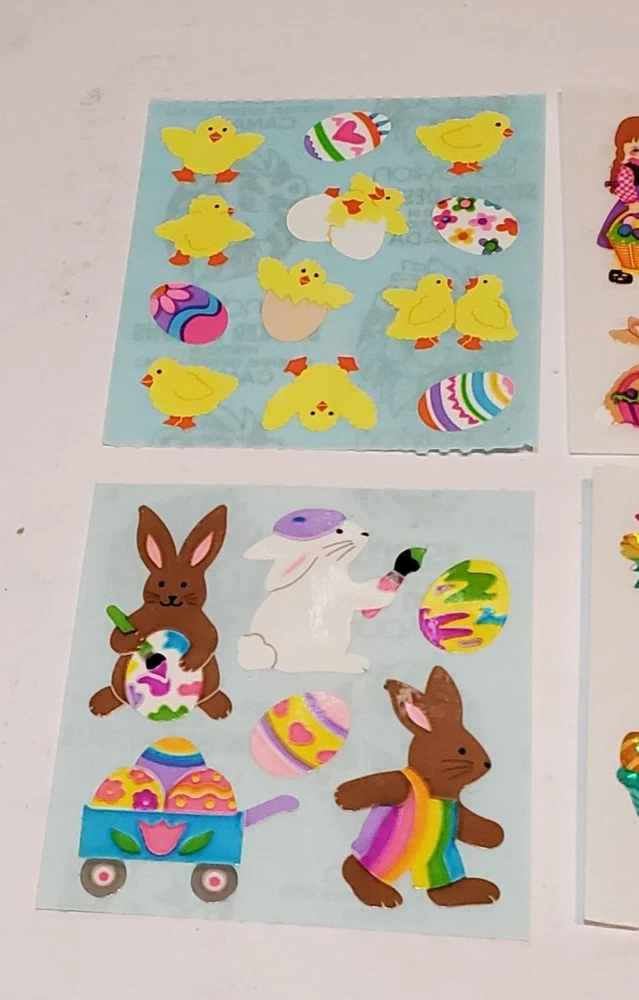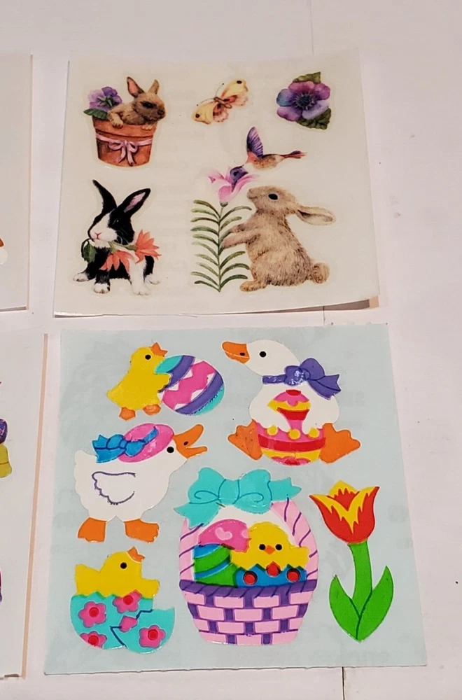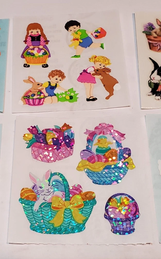 N.B. I have almost 400 Sandylion listings. If you are a serious collector and would like to stroll thru my store and pick and choose a few; I am willing to make a special listing at fair to you and me prices including a big reduction in shipping. This would involve my having to redo the photos for all the listings that you pick from. So, keep that in mind when you shop. Thanks for the interest and stay safe. 702 This is an offering of: Sandylion 6 sticker mod Easter Bunny Chicks Basket Children Mix of prisma kromekote We will combi ne shipping within four days if you let us know so we do not ship.