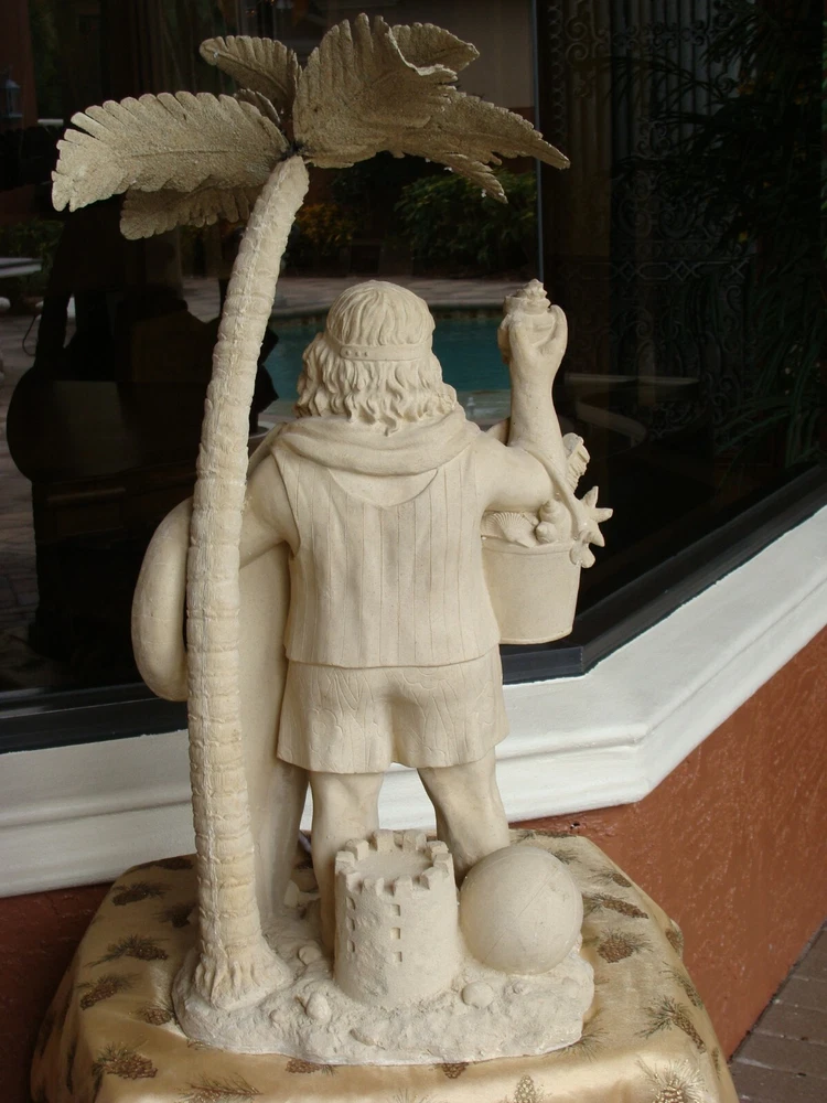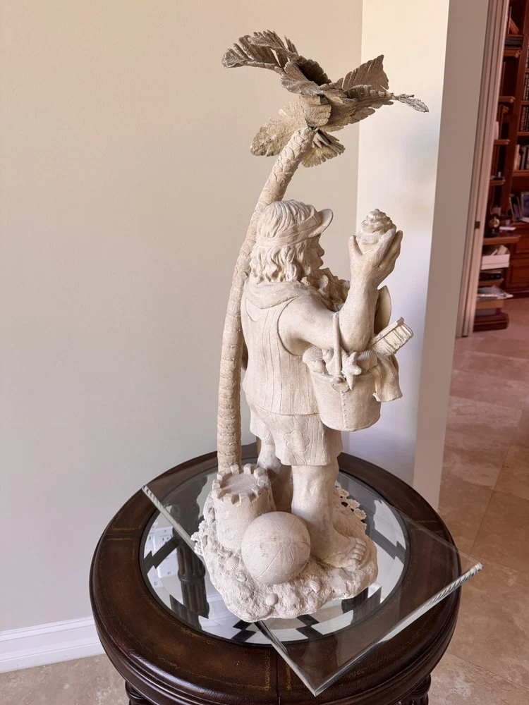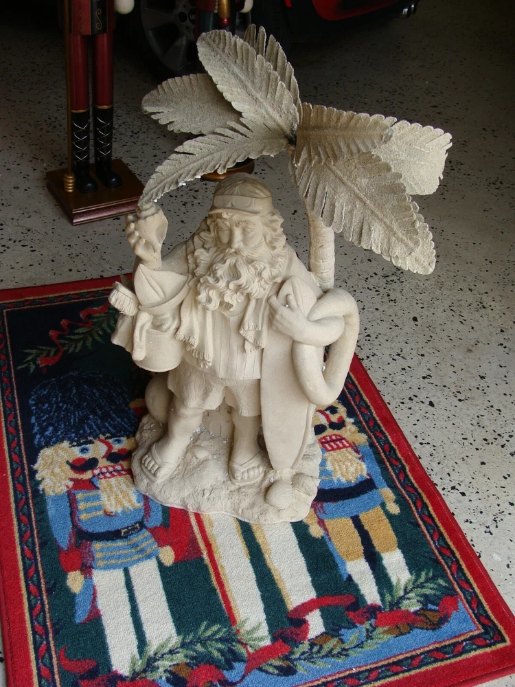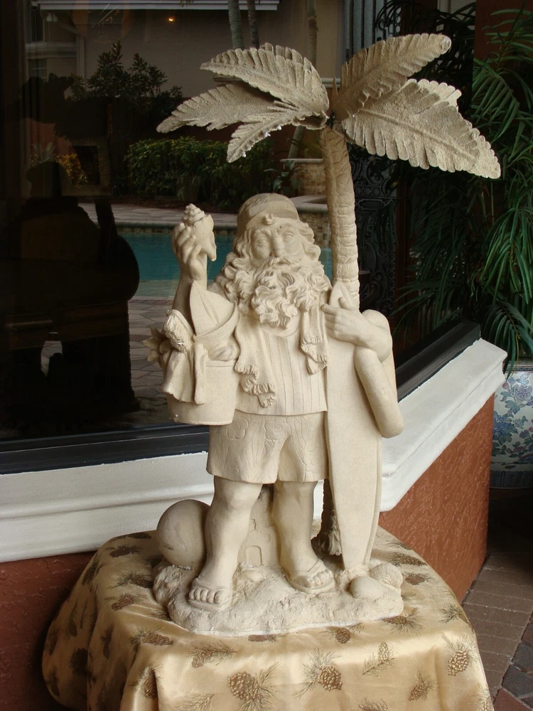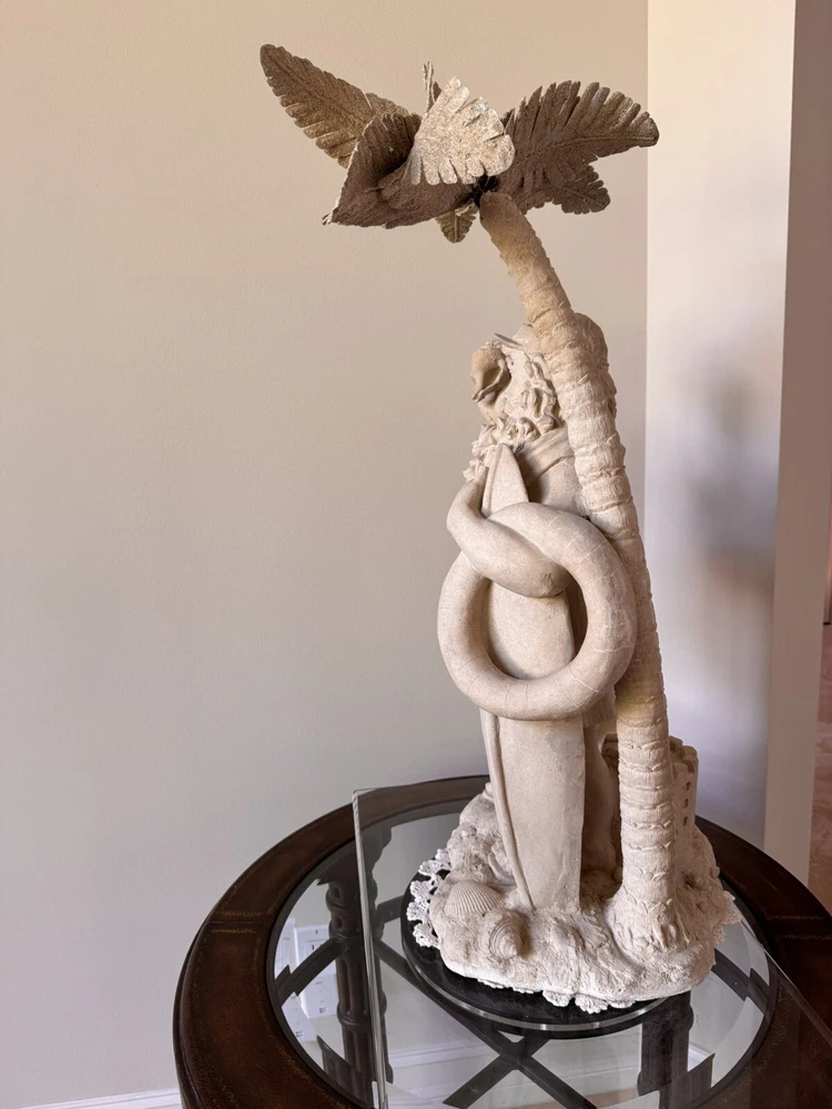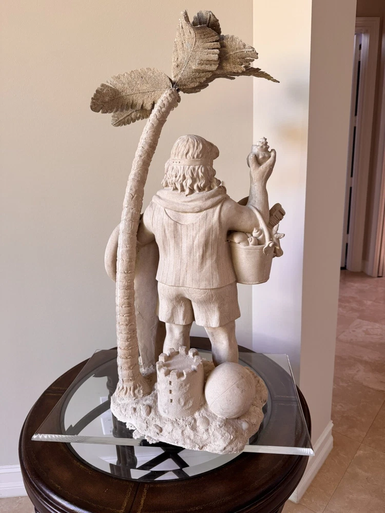 This Santa Claus figurine is a perfect addition to your holiday collection. With a nautical and coastal theme, it features a Santa shape under a palm tree with beach toys and a seashell design. The beige color and resin material make it a medium-sized statue with carvings that add to its charm. Measuring 32 inches in height and 18 inches in width, this handmade figurine is perfect for display on your mantel or shelf. It is a great gift for your loved ones who love Santa and the beach. Get ready to add a unique touch to your holiday decor with this Santa Claus figurine.