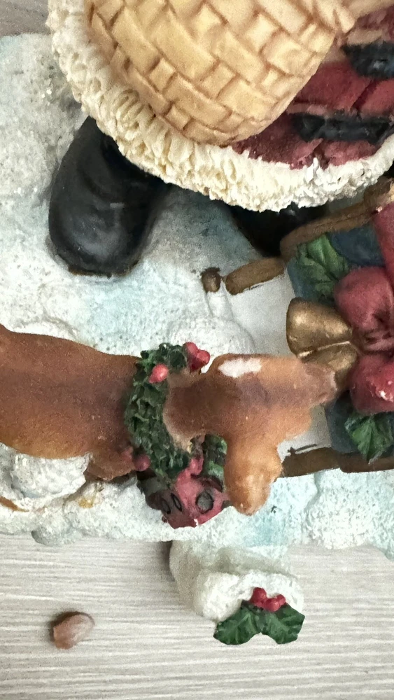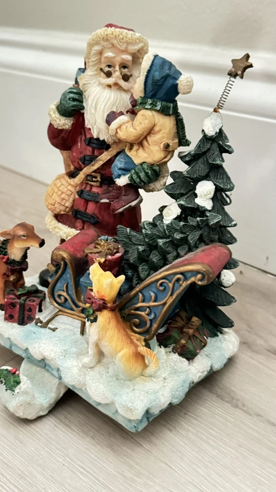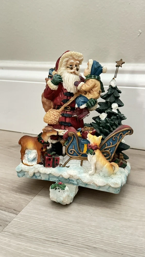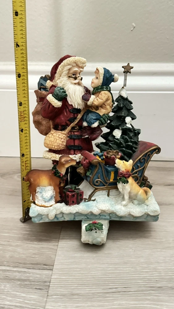 Add a touch of holiday magic to your home decor with this vintage East West Distributing Co Santa with child stocking hanger. The beautifully crafted resin material features vibrant multicolor details that will enhance any Christmas tree. Measuring 5 inches in length and 8½ inches in height, this medium-sized stocking hanger is the perfect addition to your holiday theme. Hang your favorite toys or other festive items with ease, thanks to the convenient hanger feature. The Santa with child theme is perfect for creating a warm and joyous atmosphere in any room of your home. Made in China and featuring only one item, this stocking hanger is a must-have for any holiday enthusiast. Need to glue deers ear Vtg East West Distributing Co 8½" Santa w/Child Stocking Hanger Tree,Toys,Sleigh