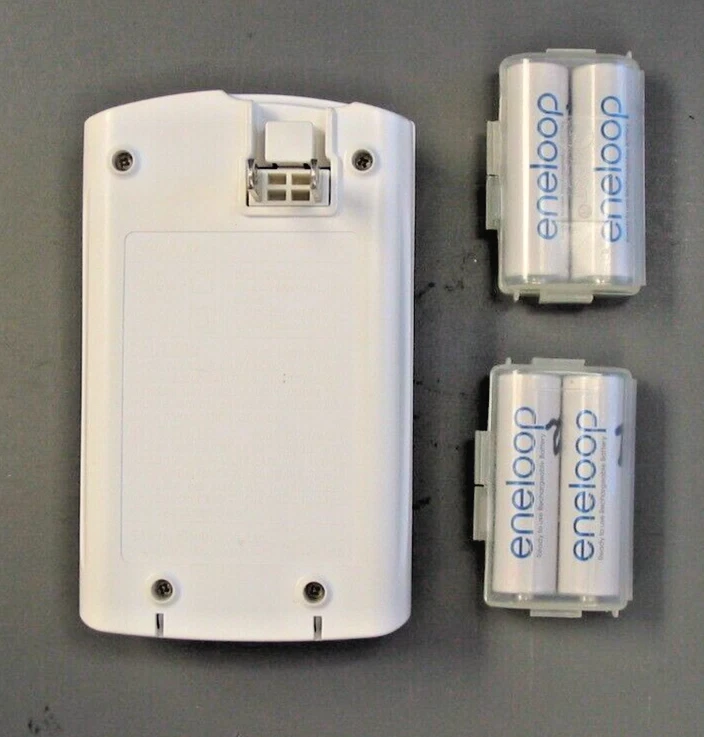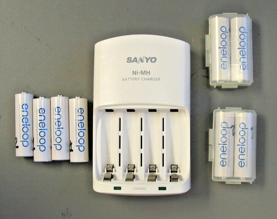 Sanyo Model NC-MQN06U Ni-MH Battery Charger for AA and AAA Batteries, PLUS 8 Eneloop HR-3UTGA (1900 mAh) AA Rechargable Batteries. Very slightly used, in excellent condition, see pictures. The Sanyo NC-MQN06U charger charges pairs of AA cells at 300 mA and pairs of AAA cells at 150 mA. Features of Eneloop batteries Eneloop technology: 6th generation high capacity NiMH batteries with superior charge retention makes Eneloop batteries ideal for virtually all situations where alkaline or lithium AA / AAA size batteries are currently used. Pre-charged and ready to use straight from the pack. Recharges up to 2100 times. You'll use hundreds of alkaline batteries just to match the overall life and performance of Eneloop batteries. Low self discharge means eneloop batteries are still ready for use even after long periods of storage - up to 65% after 5 years! Environmentally friendly - Eneloop batteries and packaging are completely recyclable. Rechargeable on most standard & fast chargers designed for NiMH batteries. Made in Panasonic Wuxi Plant.