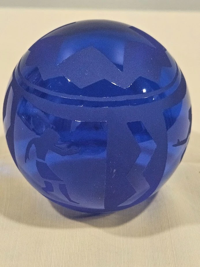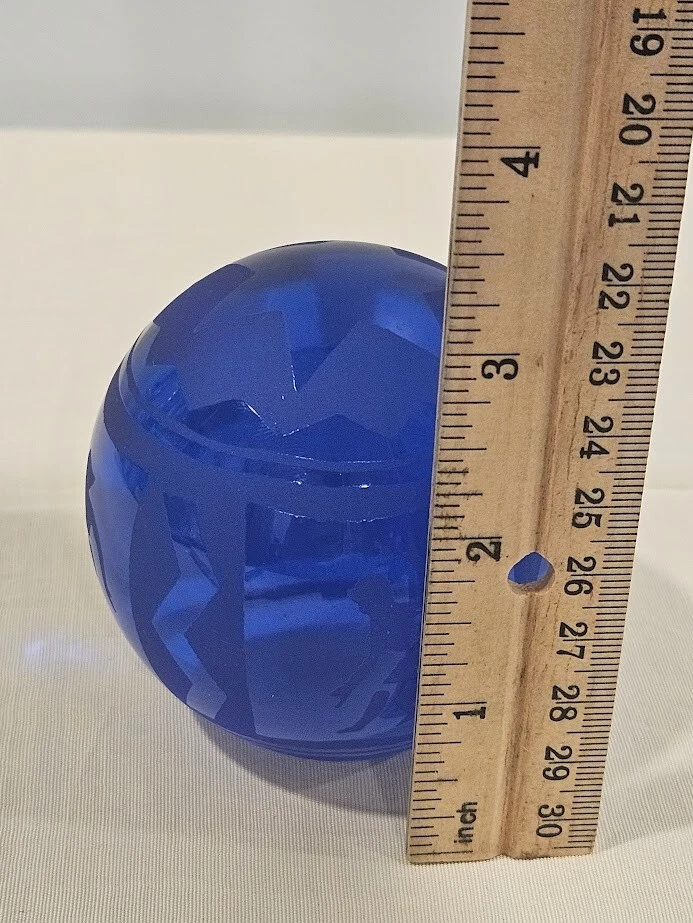 Saphire Blue Glass Ball Paperweight Acid Etched Star & Figures 3 in Vintage. Ships from a smoke free home! Please see all photos for exact item condition. Thank you for checking out my store! All items are shipped within 1 or 2 business days. Make a bundle to save on shipping cost.