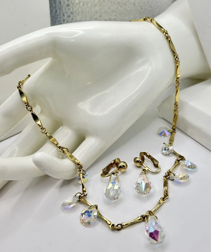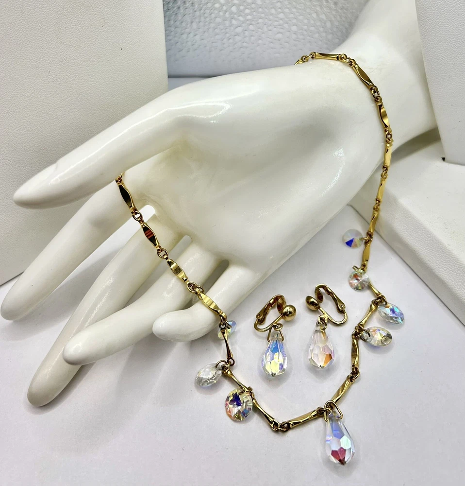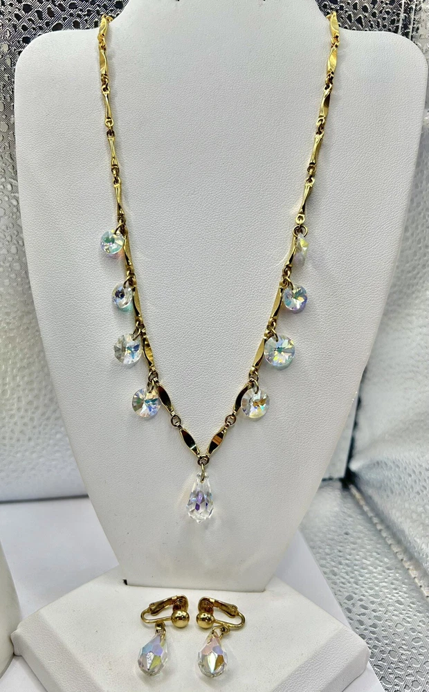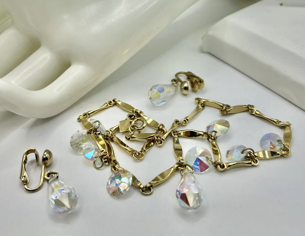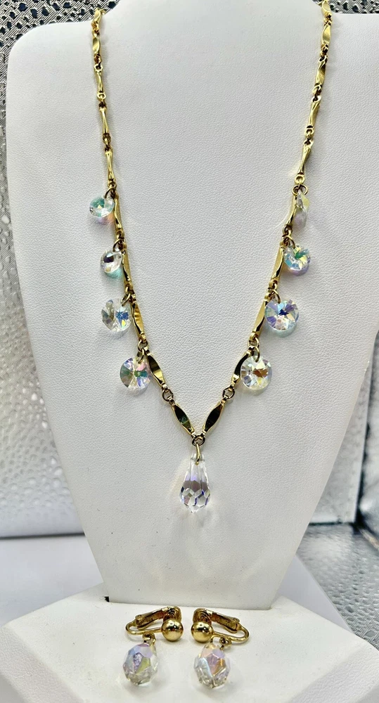 Sparkling Sarah Coventry Set ~ “Crystal Fire” ~ Golden Necklace With Radiant Rivoli Aurora Borealis Rhinestones & Center Teardrop Dangle ~ Matching Clip Earrings Each Feature A Single Sparkling Teardrop ~ Signed Pieces ~ See Photos ~ Displays Not Included ~ One Rivoli Stone On Necklace Is Chipped But Still Glows Brightly
