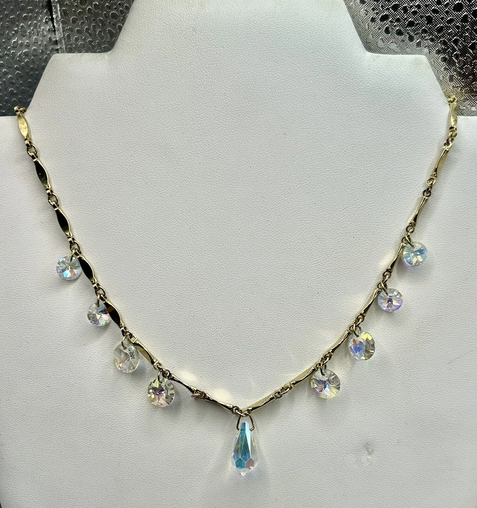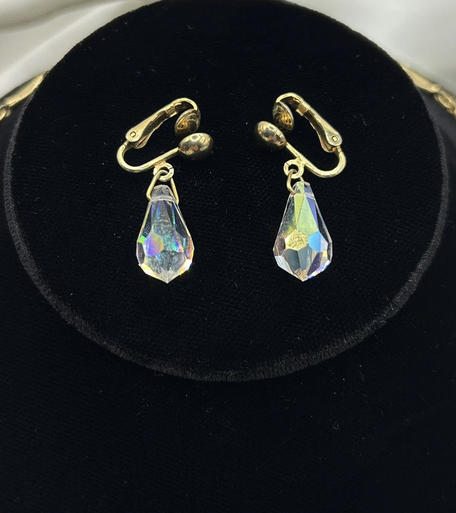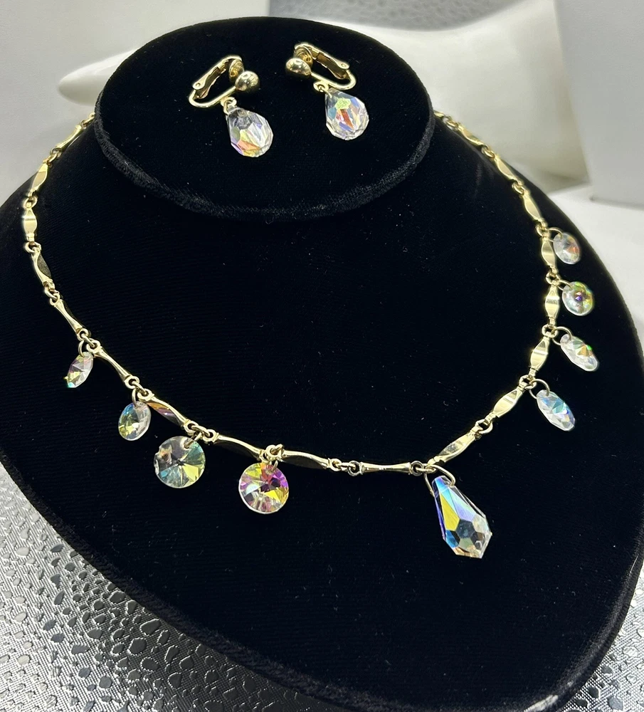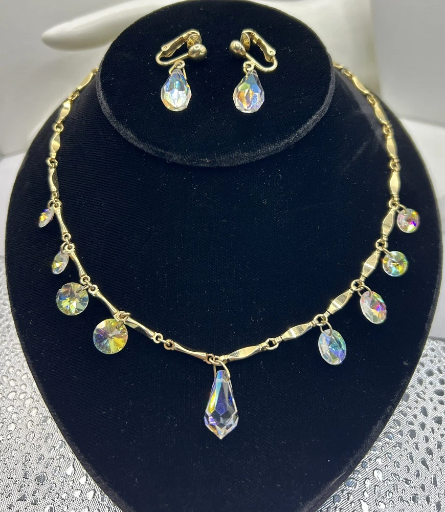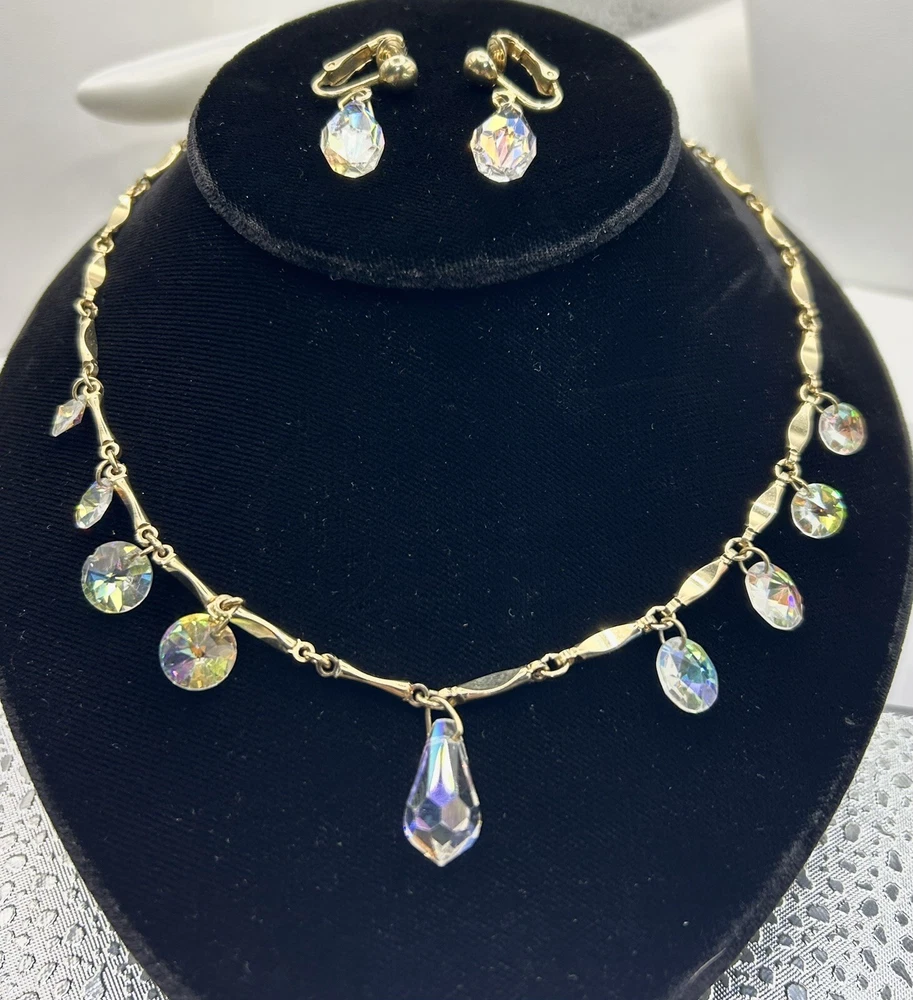 Sparkling Sarah Coventry Set ~ “Crystal Fire” ~ Golden Necklace With Radiant Rivoli Aurora Borealis Rhinestones & Center Teardrop Dangle ~ Matching Clip Earrings Each Feature A Single Sparkling Teardrop ~ Signed Pieces ~ See Photos ~ Displays Not Included ~ One Rivoli Stone On Necklace Is Chipped But Still Glows Brightly