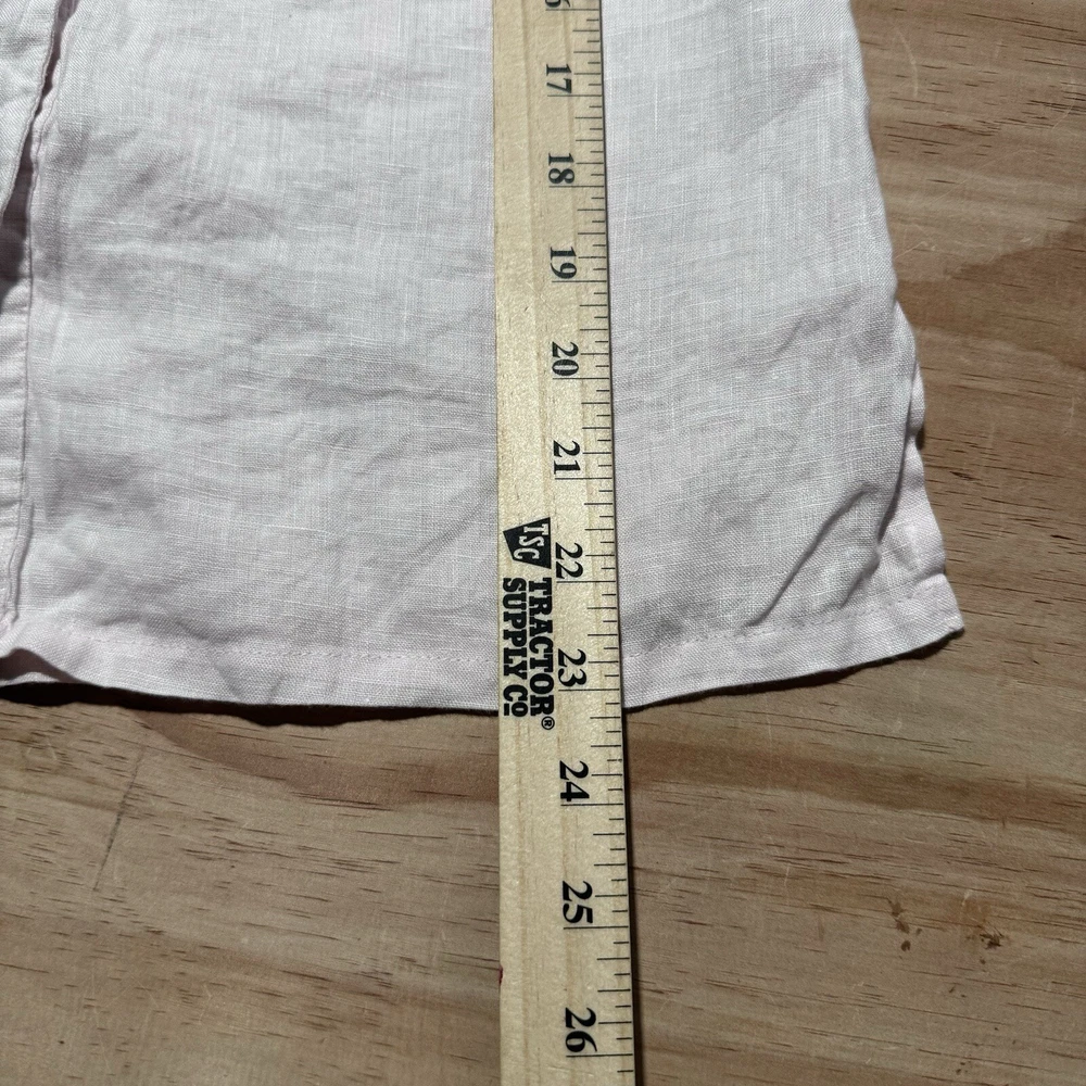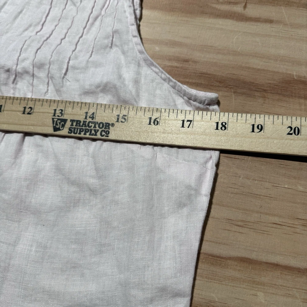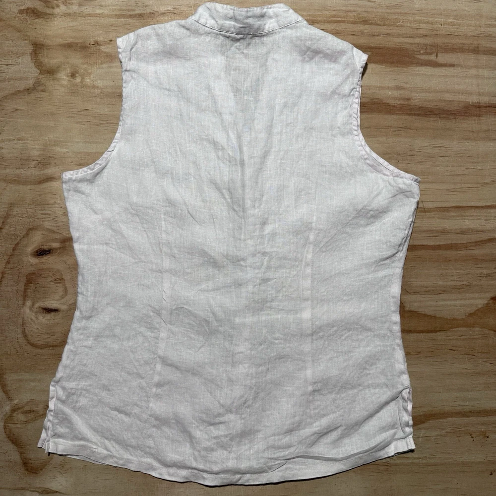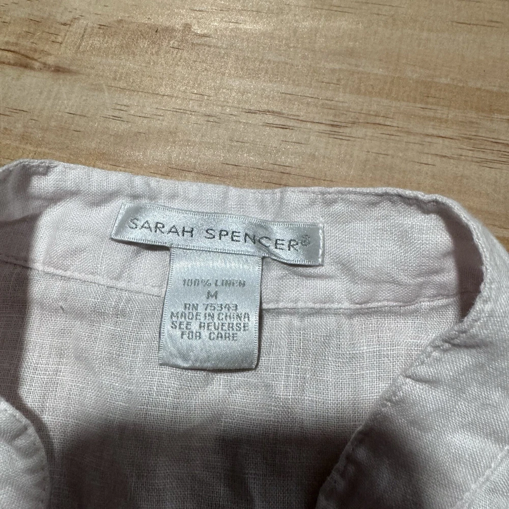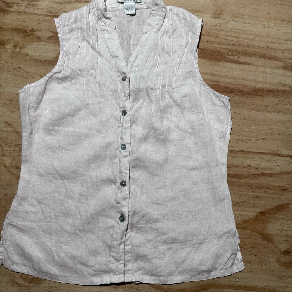 This is a Sarah Spencer sleeveless linen blouse in peach, featuring a V-neckline and button front closure. It is a size M, perfect for the summer and spring seasons. The blouse is suitable for various occasions such as travel, parties, casual, formal, or business events. Its style is basic and can be worn as a fairy vest top.