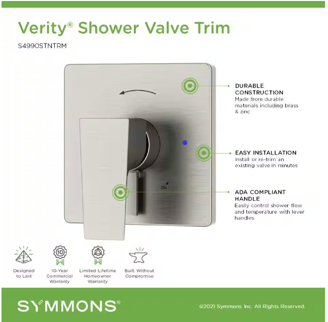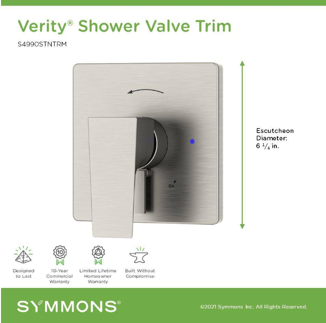 Verity Single Handle Shower Valve Trim Kit (Valve Not Included), Satin Nickel About this item Includes escutcheon and handle Verity shower valve trim ADA compliant metal lever handle ensures precise control over water temperature Compatible with 16 or 26 series Symmons Temptrol valves (valves not included) Crafted from brass, zinc, and plastic for durability