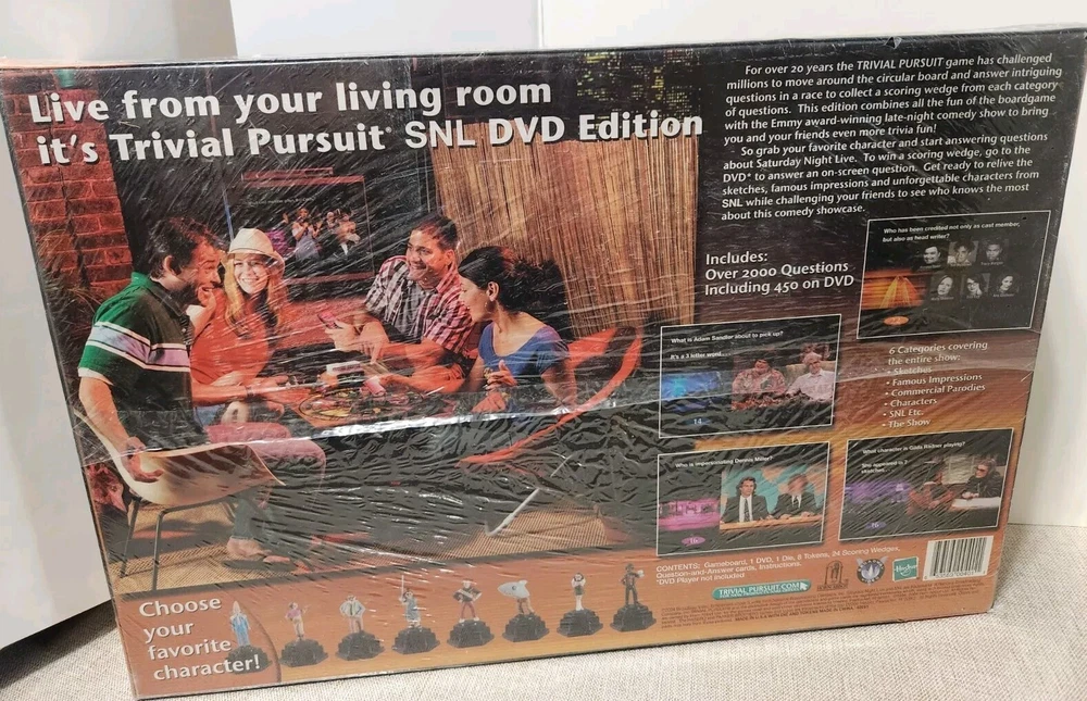Get ready to test your knowledge and have fun with the Saturday Night Live SNL Trivial Pursuit DVD Edition Board Game. This complete game by Hasbro is perfect for game night with friends and family. With questions from the popular TV show, Saturday Night Live, you'll be sure to laugh and learn. The game is from 2004 and comes sealed. It's a great addition to your board game collection. Get your hands on this Trivial Pursuit game today and put your knowledge to the test.