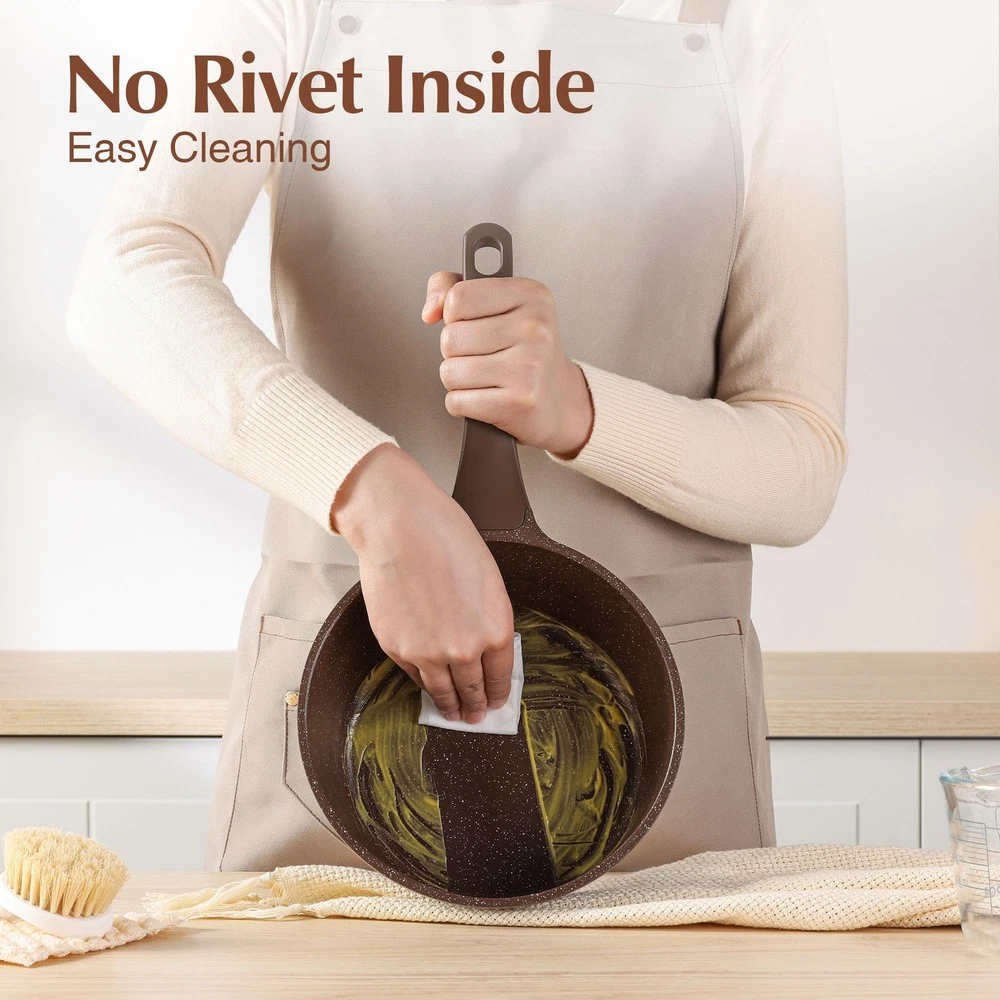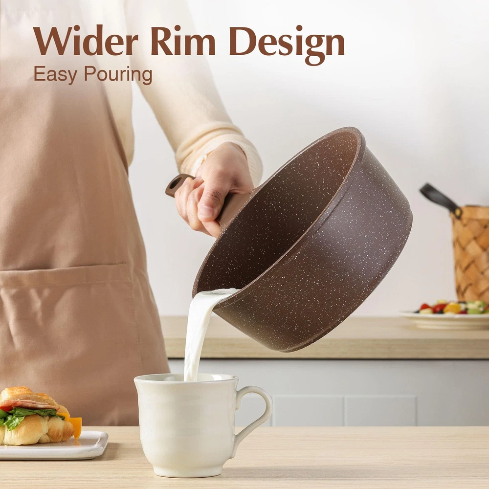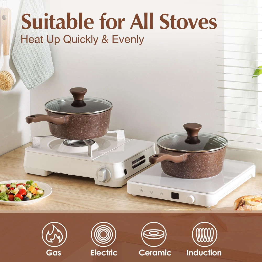 New Technology of Composite Coating - Improved harder granite,10X enhanced for long-lasting nonstick performance. PFOA free, smokeless, safe & healthy. Cooking with little oil for healthy diet. Suitable For All Stoves - High magnetic conductive stainless steel base allows the sauce pan to work on all cooktops, including induction. The core of small induction sauce pot is made of cast aluminum, which is sturdy and long-lasting. Heats up quickly and evenly. Versatile and Convenient - Size: 7.1" diameter, 3.4" deep, 2 Quart. This 2 qt sauce pot is convenient for small portions of soup, sauces, oatmeal, and grins. Ideal Size for 1-2 people meal and easy for storage. Unique lip rim design of the milk pan allows drip-free pouring. Glass Lid & Stay-cool Handle - Long-lasting tempered glass cover makes it convenient to see the cooking status and limits splashes on your stove. Woodgrain bakelite handle is comfortable to grip and stays cool while cooking. Oven safe to 302°F. Easy To Clean - Nonstick and no rivets, this induction saucepan with lid is super easy to clean. Simply wipe it over with a sponge and warm soapy water. Make your daily food intake easier to make.