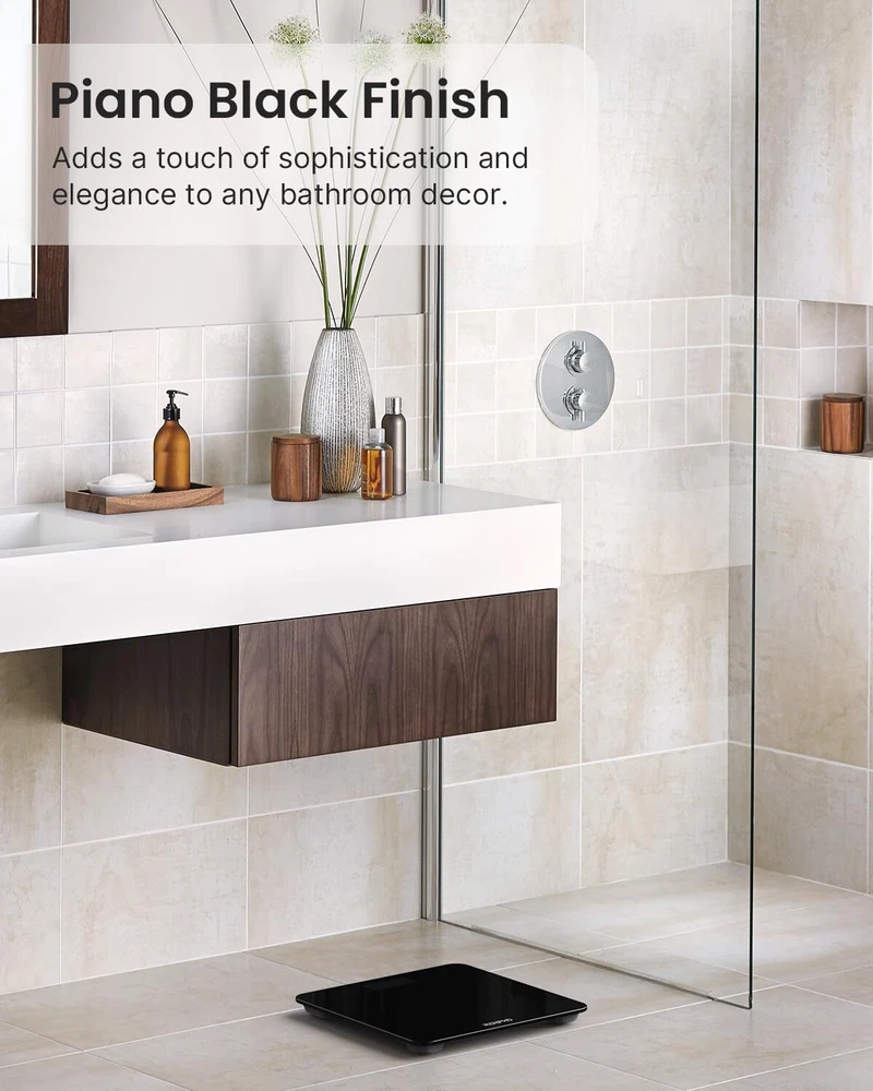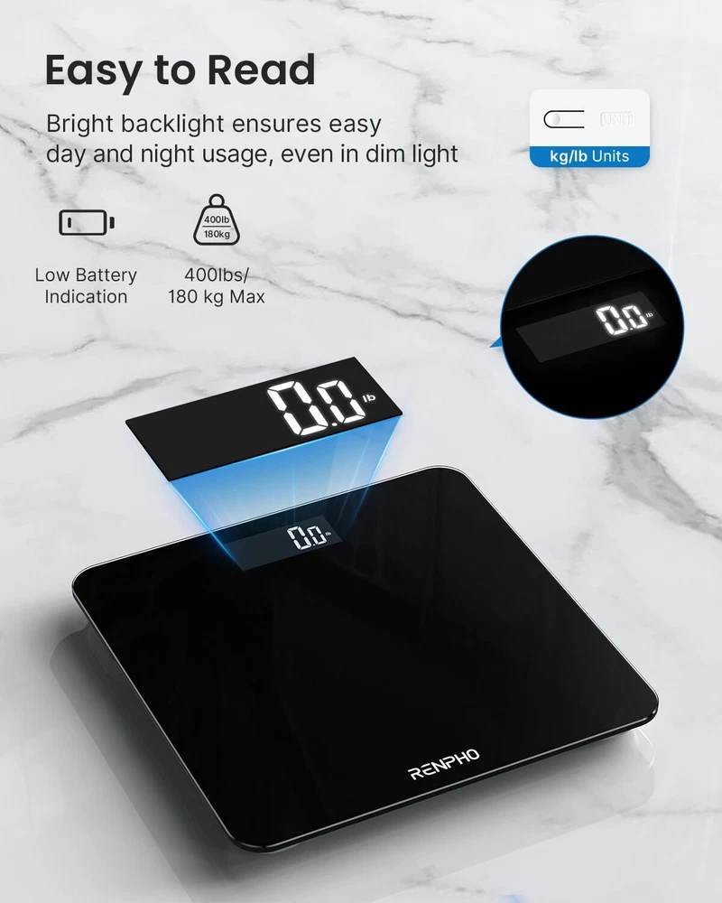 High Precision Digital Bathroom Scale,10.2"x10.2"x0.9", Black Easy to Use & Save Space digital bath scale is a good assistant to help you reach your fitness goal easily and quickly. It is simple to set up, easy to use and has an attractive smaller design that is ideal for any space. Minimal, simple and slim design saves the space and is sturdy enough to hold up to 400 pounds. It looks great and easily fits into almost anywhere in your bathroom, bedroom or office, tracks your progress with extra convenience. LED Screen Visible at Day & Night This scale calibrates itself, and thanks to the bright white LED display, just step on the scale and read your weight number immediately and clearly. Easy to change the weight units among lb, kg by touching the button on the back of the scale. Durable Tempered Glass & Safety Design Made by high-quality tempered glass, only 5mm thickness. Grinding the edge of glass won't hurt your skin. Super durable and safe. Rounded corners make the scale look sleek, and they'll also spare household members from sharp corners.4 anti-slip and scratch-resistant pads to keep the weighing platform stable while taking measurements, prevent slipping and protect your floor. Specifications: Weight Capacity Max: 400lbs/180kg Weight Capacity Min: 13lbs/6kg Graduation: 0.05kg/0.1lb Display: White LED display Units: kg/lb Platform: Tempered glass Multifunction: Low battery/Overload indication; Auto on/Off/Zero Package Information: 1 x digital bathroom scale 1 x User Manual 2 x AAA Batteries (included) Always Accurate: Equipped with 4 high-precision sensors, the digital bathroom scale instantly delivers precise weight readings with a capacity of 400lb (180kg) in 0.1lb (0.05kg) increments, enabling you to accurately track even small changes in your weight. Auto Calibration: Simply step onto the body weight scale with one foot to activate its auto-calibration function that resets the display to zero before each measurement. This ensures reliable and consistent accuracy with every weigh-in. Easy-to-Read LED Display: Clearly shows weight measurements in bold and well-defined numbers, allowing you to quickly and easily check your weight at a glance, even in low-light environments. Core Essentials: Get your body weight readings instantly the moment you step on this digital weighing machine. The round corners, 5mm tempered glass, and well-balanced build prioritizes safety—making it ideal for all people especially those who are elderly or pregnant. Its smooth surface allows for easy cleaning and maintenance. The auto-on/off feature enhances convenience. Low battery and overloaded indications offer added peace of mind during use. Space Efficient & Sleek: Measuring 10.2x10.2x0.8 in (26x26x2.1 cm) only, scale for body weight makes its placement a breeze, effortlessly slotting into any corner of your bathroom, bedroom, or office. The slim and minimalist design blends in nicely with your decor, adding a stylish touch to your space. About : has pioneered wellness innovation for over 8 years. With groundbreaking advancements, it has touched the lives of over 16 million users across 200 countries. Our commitment to quality and innovation makes us a trusted partner in your health journey. Join and unlock a healthier, happier future.
