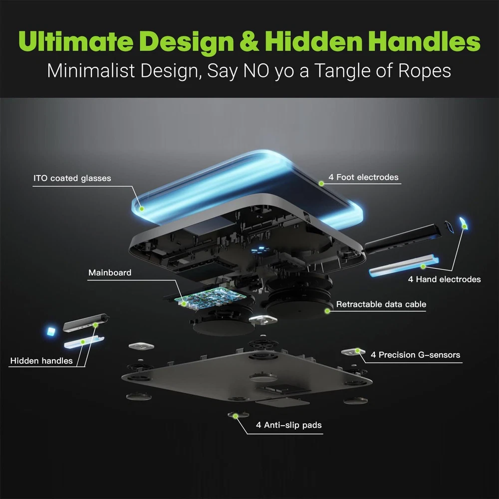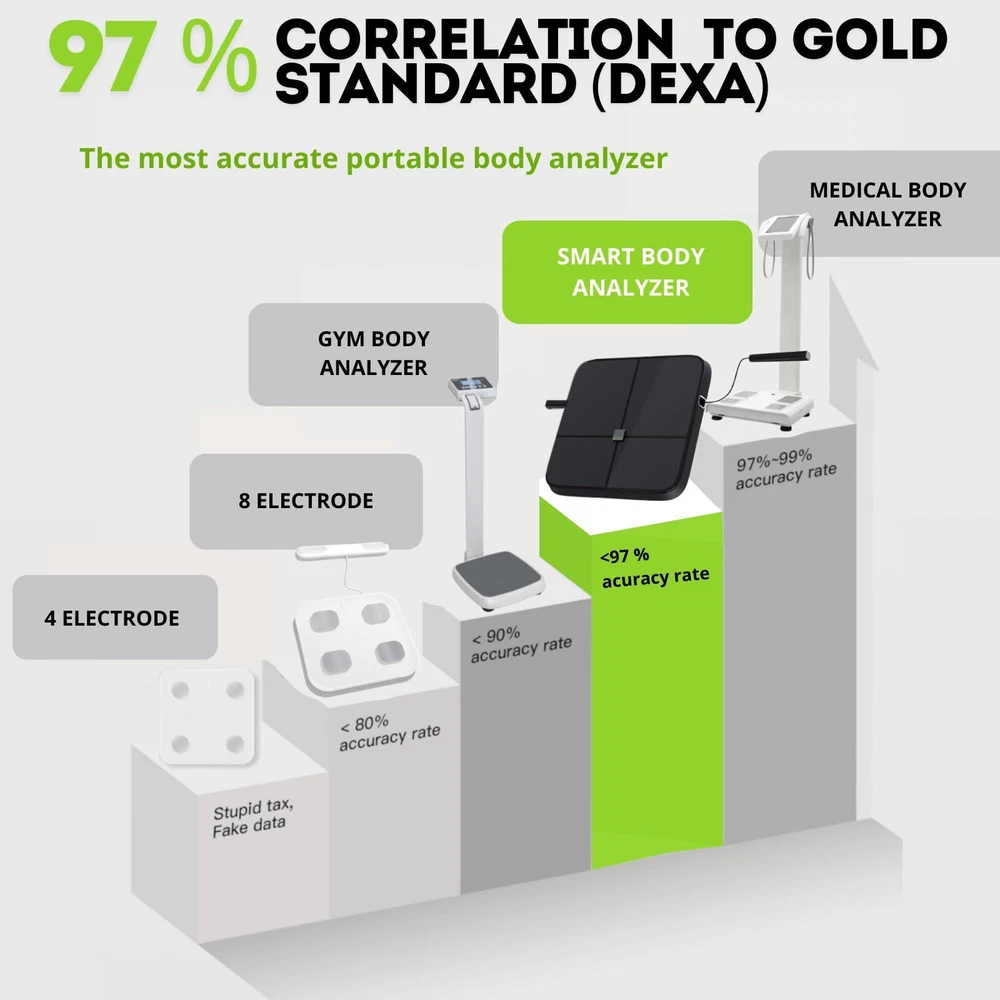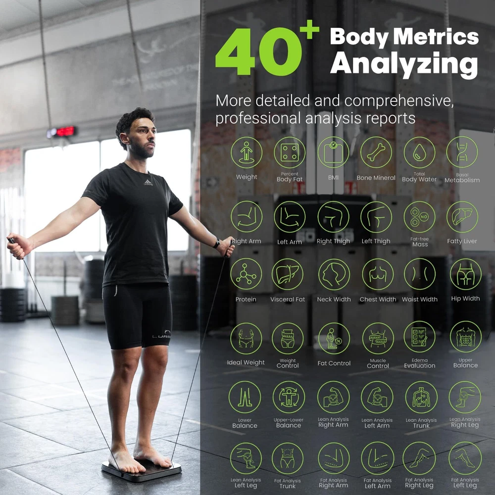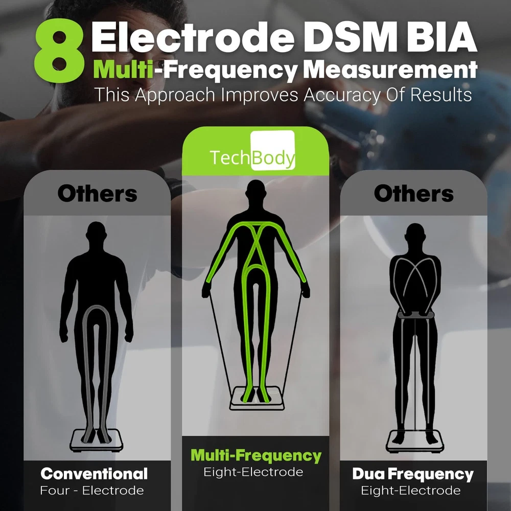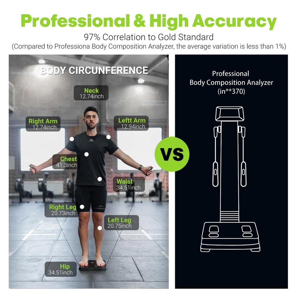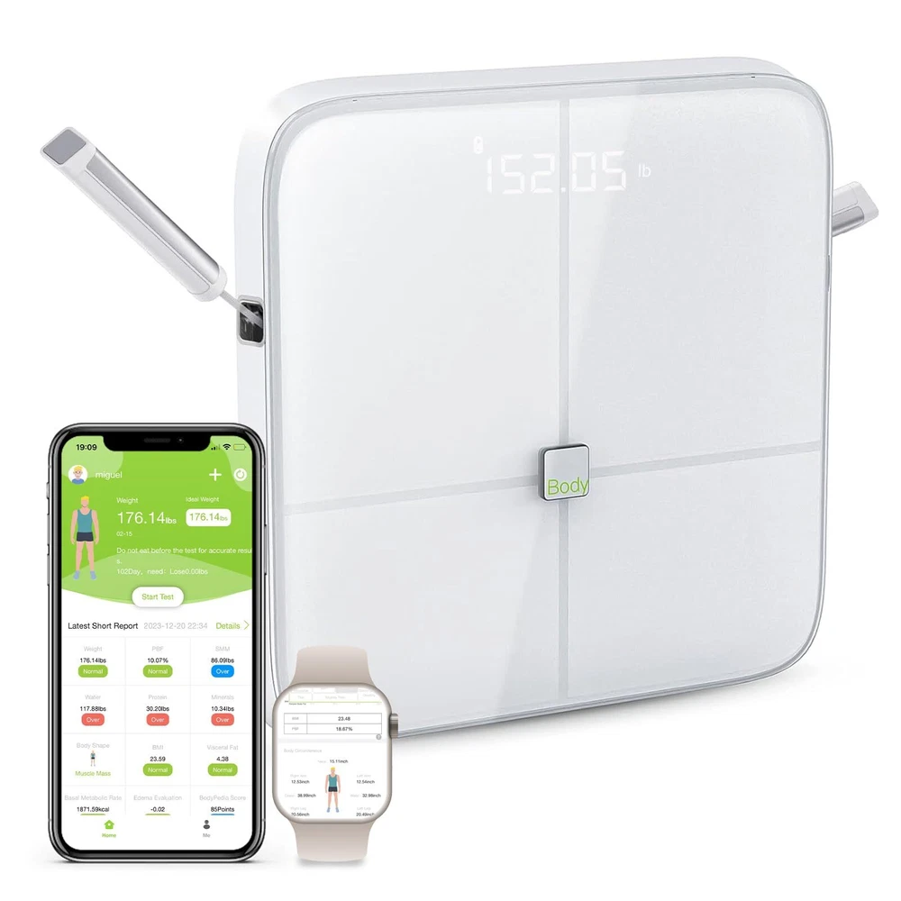 Bodypedia digital weight scale features 8 high sensitive electrodes and 8 high precision G-shape sensors that have passed 100,000 times sensor performance tests to enhance accuracy. The scale ensures measurement results accurate to 0.1lb/0.05kg. With 3D Body Modeling technology, BodyPedia provide your body measurements including chest, wasit, hip, arms, thighs and neck. Its DSM-BIA and SMFIM technology generates reports based on more than 40 different body measurement parameters-including water % and muscle mass, as well as visceral fat.All this from the comfort of your own home. -【Accurate to 0.1lb】This ultra-precision body fat scale features 8 high sensitive electrodes and 4 high precision G-shape sensors that have passed 100,000 times sensor performance tests to enhance accuracy. The scale ensures measurement results accurate to 0.1lb/0.05kg。In contrast to other weight scales with 4 electrodes that only measure half of the body, our digital scale uses 8-Point Tactile Electrode System to measure the body in five sections (limbs and torso) -【8-Point Tactile Electrode System】Instead of using 2 currents at low and medium frequencies to only measure the extracellular fluids like other 8 electrode scales with one handle, bodypedia composition scale breaks through the technical bottleneck, using the two handles design to measure the intracellular and extracellular fluids in multiple currents at low, medium and high 3 frequencies. -【43 Essential Body Composition Data】 Direct Segmental Multi-frequiency Bioelectrical Impedance Analysis DSM-BIA and SMFIM technology generates reports based on more than 40 different body measurement parameters-including BMI, body fat percentage, Body circumferences ,water weight, muscle mass, bone mass, subcutaneous fat, visceral fat, etc. In contrast to other weight scales with only 20 basic data analysis. -【Unlimited Users Management】smart scales unlimited users, the Scale is perfect to share with your family and friends. . It’s smart enough to know who steps on and automatically recognizes the result to their own profile if the weight difference is within 2kg /4.4 lb. perfect for families and fitness groups who want to monitor their body data in order to improve their overall health -【 Minimalist design】All in One Display, , hidden handles&tangle-free,SWITCHABLE WEIGHT, 26s test, quickest body composition analyzer, You can download BodyPedia app from App Store to monitor and track your body data over time periods anytime anywhere. The app also syncs easily with other fitness apps like Apple Health.
