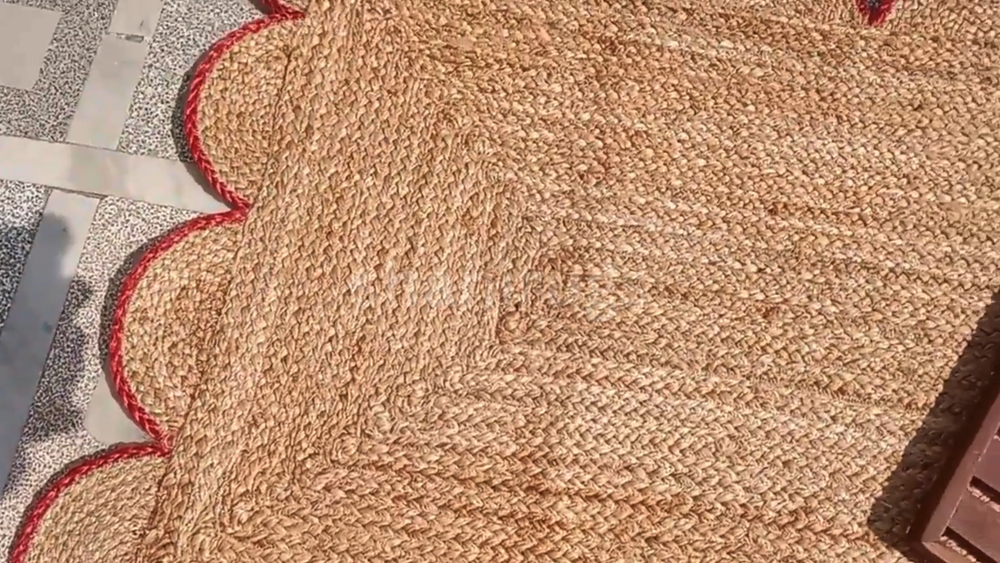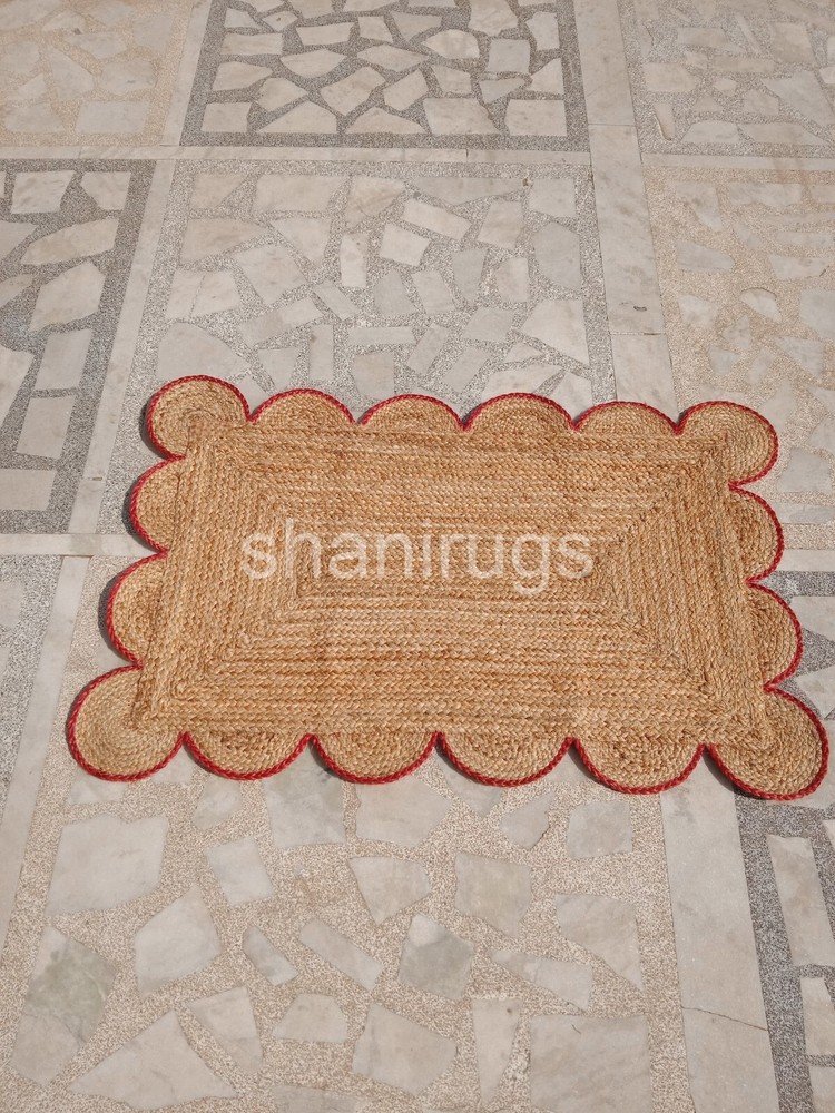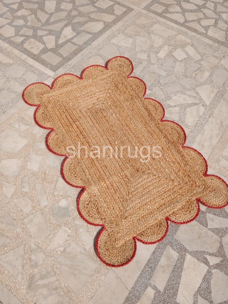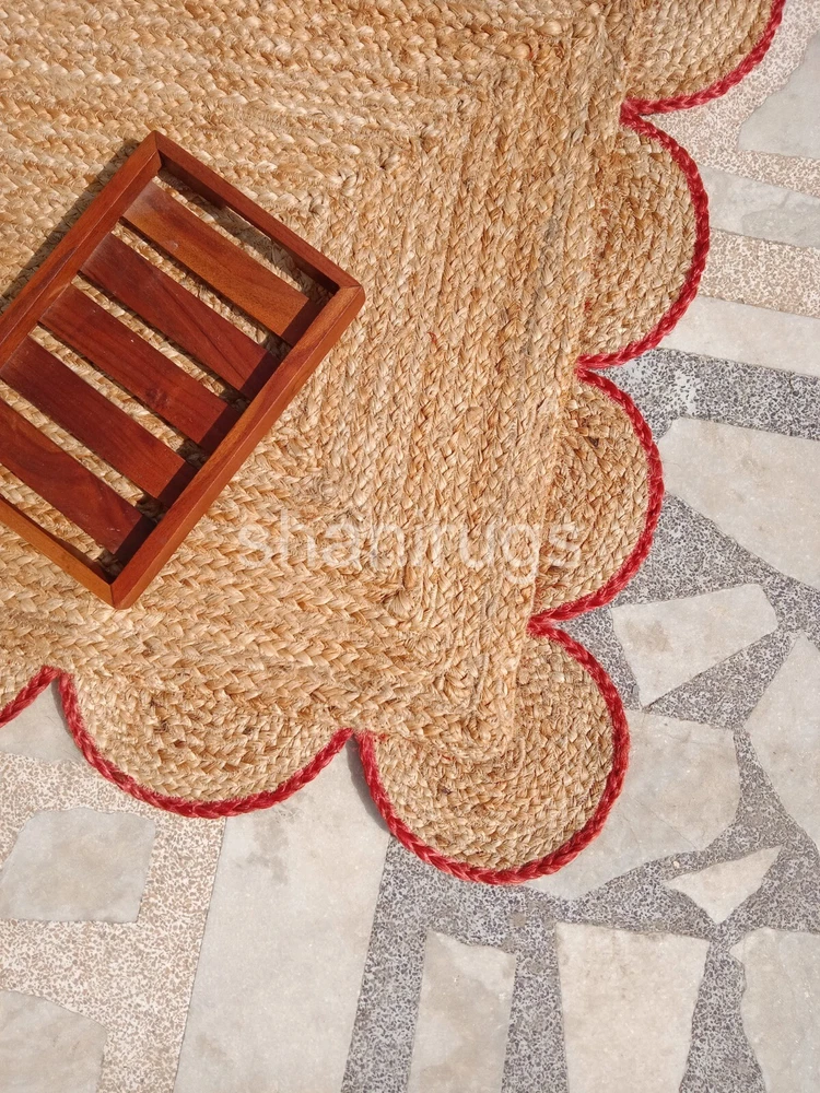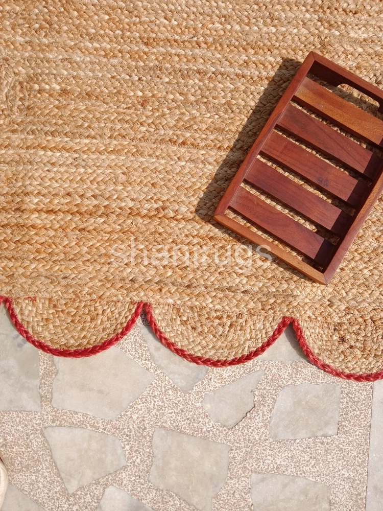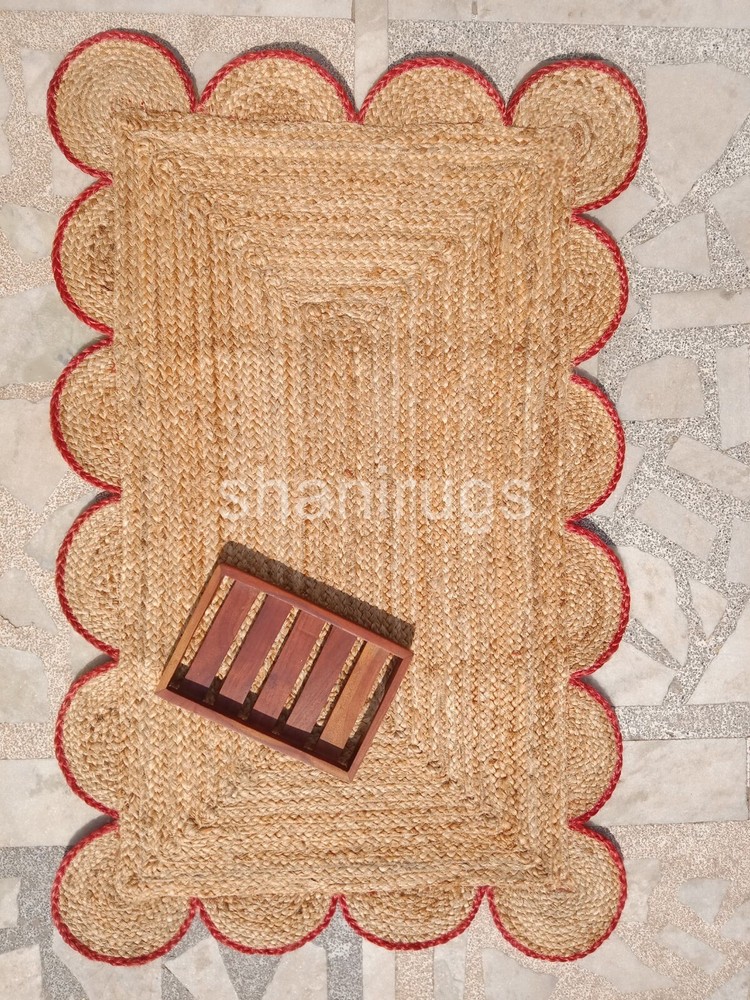 A scalloped jute rug features a natural, earthy design made from tightly braided or woven jute fibers, a plant-based material known for its durability and sustainability. The scalloped edges give the rug a decorative and elegant touch, softening its otherwise rustic appearance. Typically, these rugs come in neutral tones like beige, tan, or brown, which highlight the organic texture of the jute. The scalloped detailing adds a unique, artisanal look, making it an attractive accent for a range of interiors, from coastal and bohemian to farmhouse and contemporary spaces.
