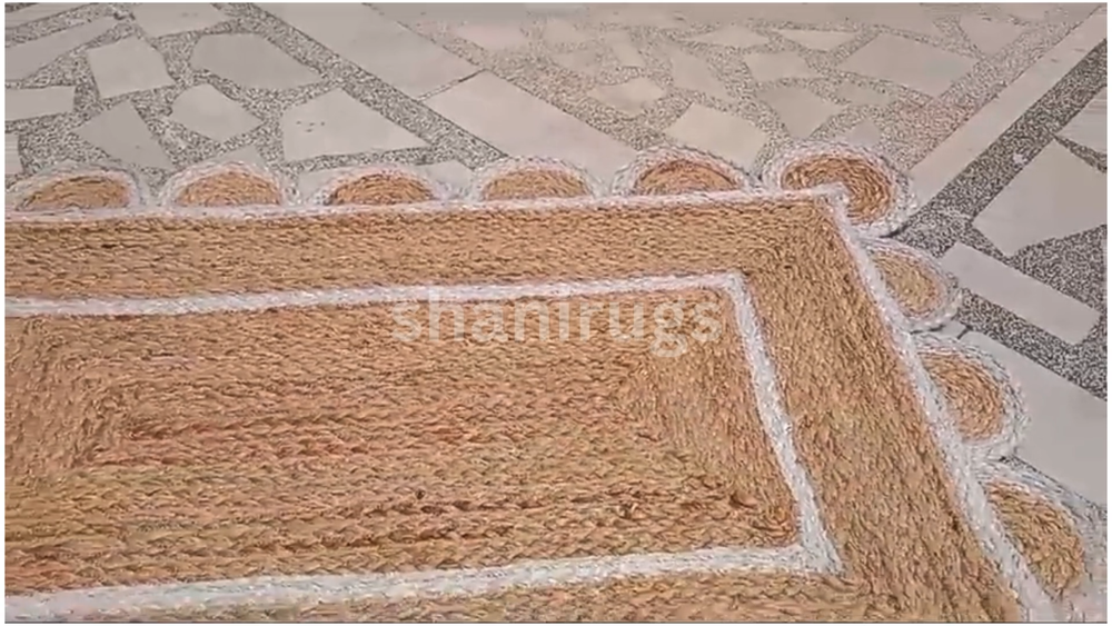A scalloped jute rug features a natural, earthy design made from tightly braided or woven jute fibers, a plant-based material known for its durability and sustainability. The scalloped edges give the rug a decorative and elegant touch, softening its otherwise rustic appearance. Typically, these rugs come in neutral tones like beige, tan, or brown, which highlight the organic texture of the jute. The scalloped detailing adds a unique, artisanal look, making it an attractive accent for a range of interiors, from coastal and bohemian to farmhouse and contemporary spaces.