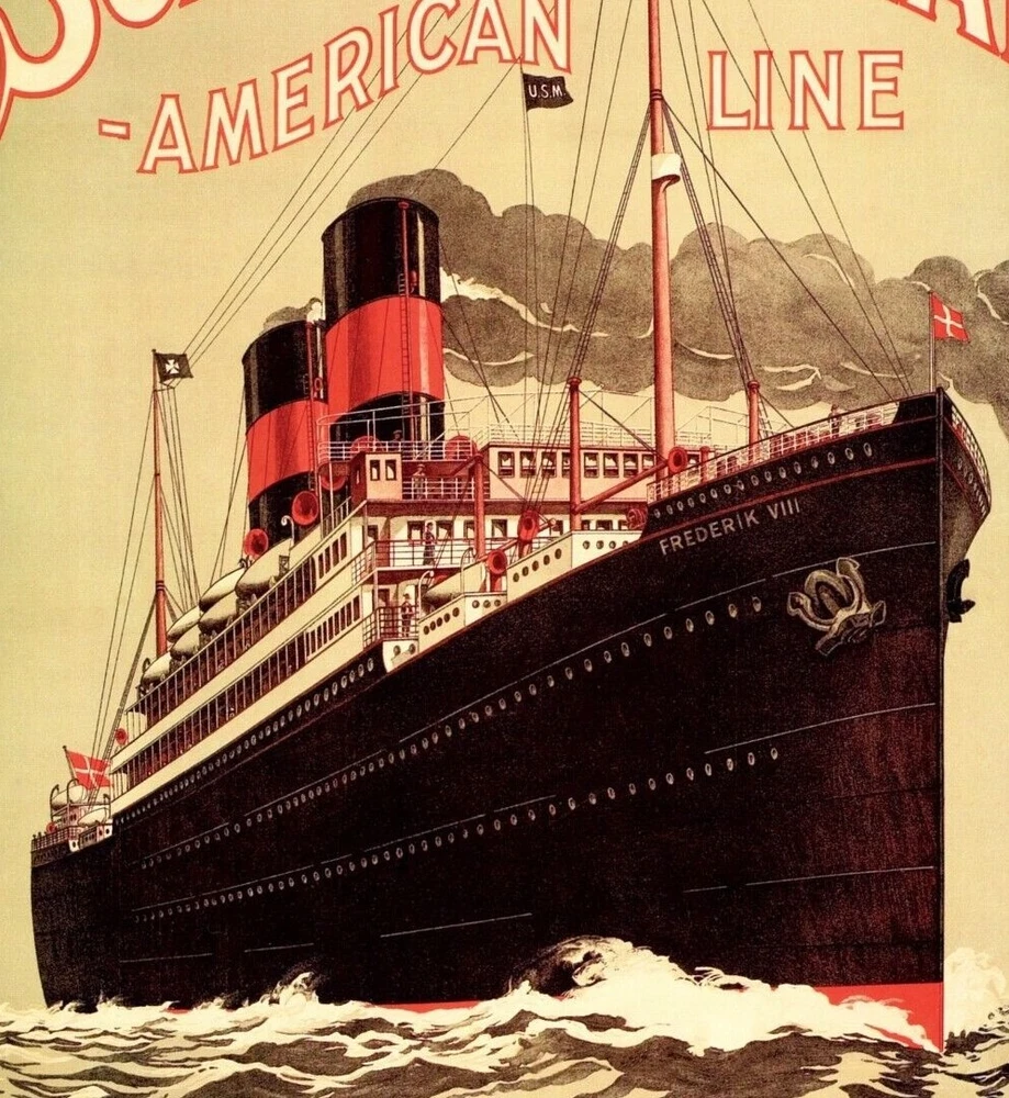 Scandinavian American Line 1914 New York To Scandinavia One of the ships in the Scandinavian American Line was the SS United States . This ship was constructed in 1903 by A. Stephen and Sons in Glasgow. She was 10,095 tons and 500.8 feet long. The passenger and freight service between Scandinavia and New York City was operated under the name Scandinavian America Line until 1935 Vintage Poster Print Retro Style Restored Art ***We offer Free US Postage or Reduced Postage for Canada & Worldwide. **No charges for additional prints worldwide. ***These are not framed or stretched or mounted NOTE:**Delivery dates shown are only "Suggested" Order Early To Avoid Post Delay Dramas **Read Please: The print looks best with a nice mat (passe - partout or passepartout ) and frame. These prints are the exact proportion as the original and will not be stretched to fit the paper or canvas...this would cause a distorted print The image will be the exact aspect ratio as per the original poster, so there might be more white on the top and bottom, or side to side. Options available..use the drop-down menu * Watermark will not be on your image. *Cloth Canvas an artist canvas used also in museums and art galleries *Photo Gloss Paper is a high-quality Professional Photo paper *Matte Photo Paper is a great solution if you do not want a Gloss, this paper is great with colors *Luster Photo Paper this photo paper is neither glossy or matt. Glossy paper has a smooth texture, luster paper is slightly textured. This option is a good choice for something in between Metallic, Photo Gloss and Matte *Metallic Pearlescent Photo Paper is a very high-quality paper with a Pearlescent sheen, a glossy finish, and unique metallic appearance, these prints have extra visual interest and depth. This paper uses a combination of film laminate layers that produce striking, dimensional, lasting images on an ultra-bright background. The effect is sometimes described as "chrome on paper." This is NOT a metal plaque, it is a photo paper This poster print will be shipped in a sturdy container. We will ship usually within 24 business hours of payment, except for weekends or US Holidays If there is a question, please do contact me All is done to send you the best quality poster image. Don't forget to check out the Sales. There is a great Buy 3 Get 1 Free Offer!! Shipped with no extra postage..Worldwide! There are a variety of reasons why the images on your monitors don't match each other. The simplest is that each monitor is different; even monitors with the same model won't have colors that match up perfectly We are located and ship only from the USA The art is not AI generated, these are restored prints from originals