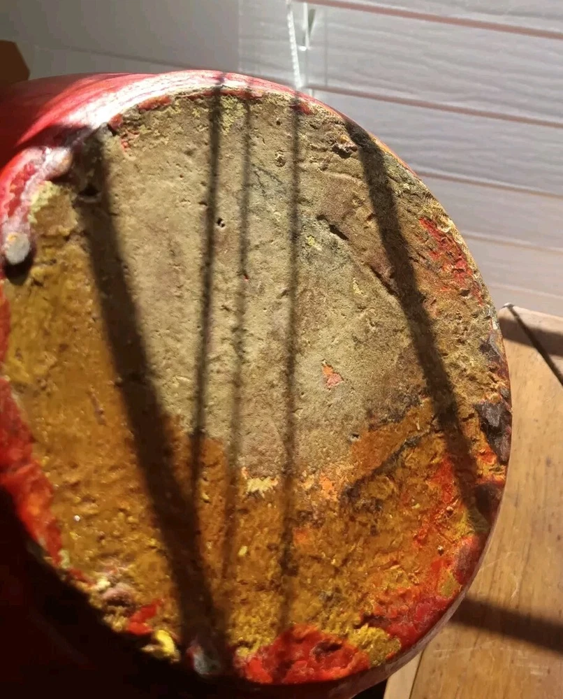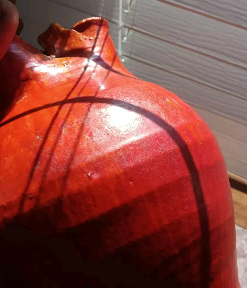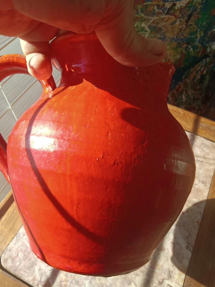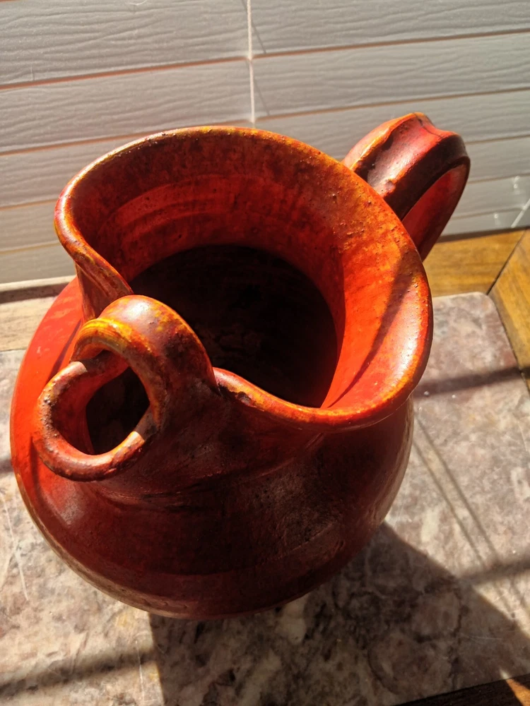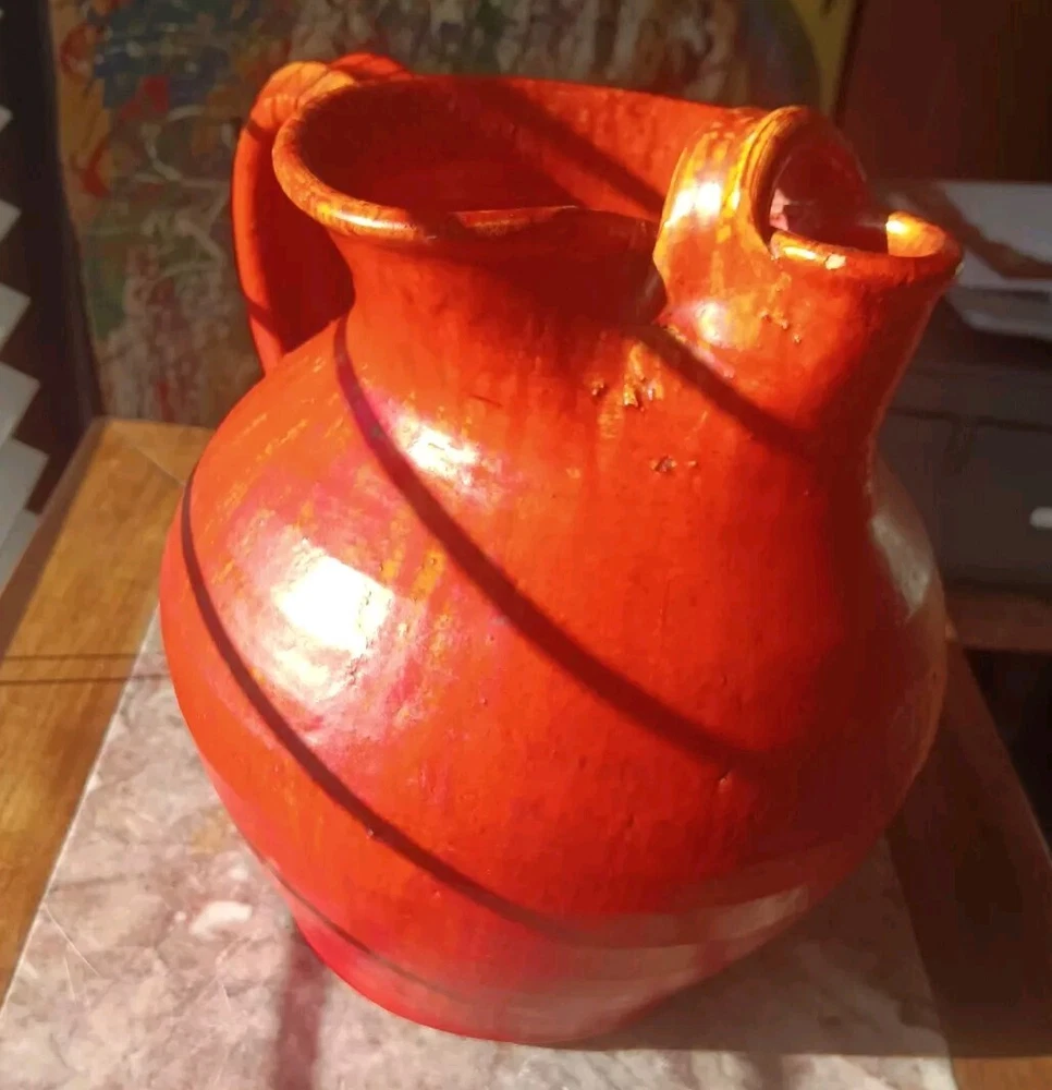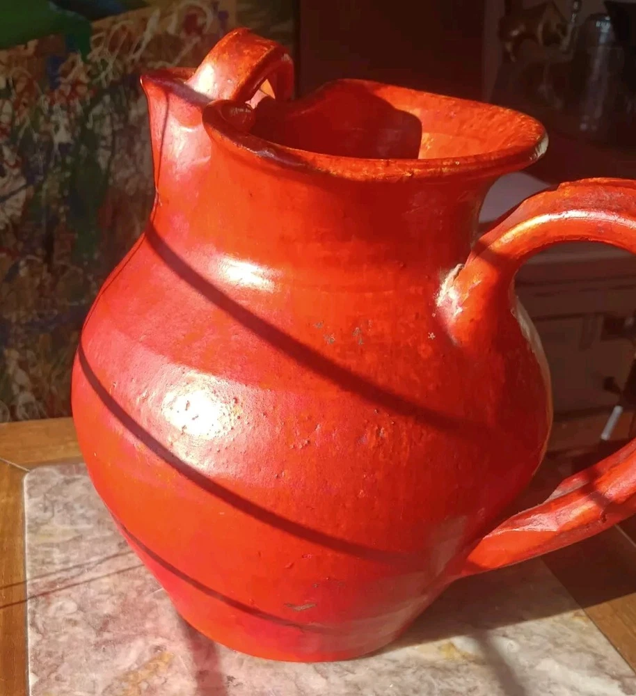 1920's or 30's chrome red water pitcher with a more scare ice catcher edition. It measures 8.5" tall by 9" wide and in overall excellent condition. There are probably a few flecks but no real chips,cracks or repairs.
