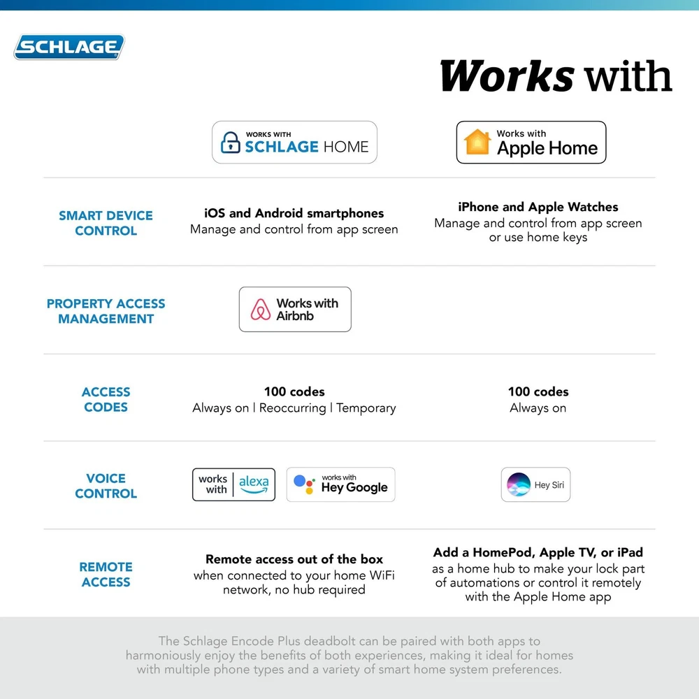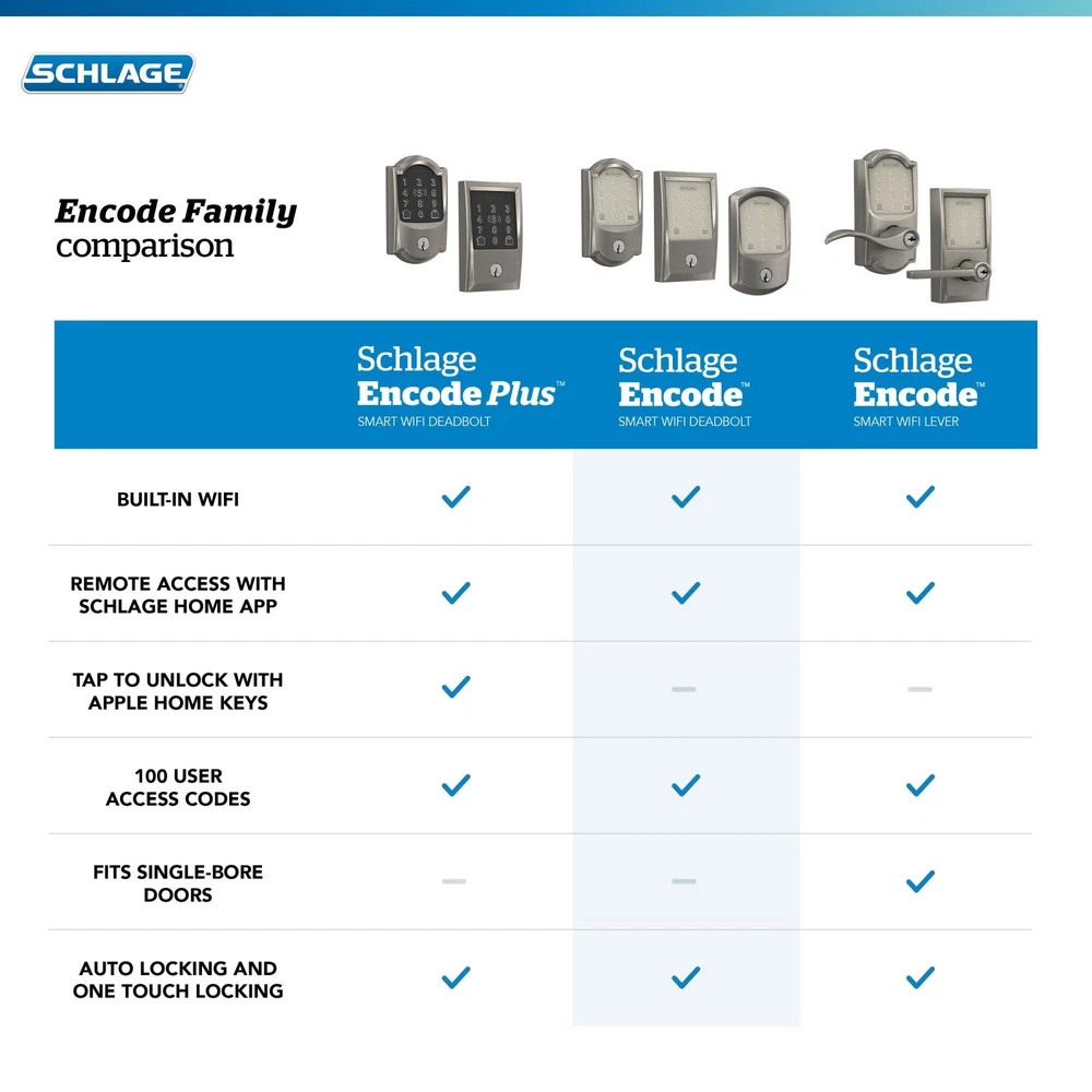 Powered by Frooition Top Products Kitchen Bathroom Lighting Fans Hardware Decor & Organization Schlage BE499WB-CAM Encode Plus Camelot Touchscreen Electronic Deadbolt with WiFi Overview Item Description Simple & Secure Access from Anywhere Get flexibility and peace of mind with the Schlage Encode Plus™ Smart WiFi Deadbolt. Built-in WiFi allows you to control and monitor your home from anywhere, no additional hub needed. This innovative smart lock provides simple, secure access when paired to the Schlage Home app and connected to your home’s WiFi network. Apple users can enjoy Apple HomeKit and Apple home keys compatibility as well. With home keys, you can simply tap to lock or unlock using your iPhone or Apple Watch for easy and secure access to your home. Discover smarter home access with the trusted convenience and security of Schlage. Features: Exceeds criteria for ANSI/BHMA Grade 1 certification Constructed of high quality materials for durability and dependability Complies with ADA standards Covered by Schlage's limited lifetime mechanical and 3 year electronics warranty Installs easily with just a screwdriver (no wiring necessary) Built in WiFi capability lets you access and monitor your lock from anywhere using the Schlage Home app Remotely view lock history and manage up to 100 access codes Auto lock with time delay options can be toggled on or off Compatible with Amazon Alexa and Google Assistant for voice activation Requires 4 AA batteries (included) Specifications: Backset: Adjustable 2-3/8" or 2-3/4" Cross Bore: 2-1/8" Edge Bore: 1" Door Thickness: 1-3/8" to 1-3/4" Handing: Reversible Left or Right Interior Height: 5-1/2" Interior Width: 3" Interior Projection: 2-3/8" Exterior Height: 5" Exterior Width: 3" Exterior Projection: 7/8" Latch Faceplate: Drive-In, Round Corner, Square Corner Cylinder: 5 Pin C Why Choose BuildInc? OUR PROMISE TO YOU About Us At Build, we promise to provide the best selection we can, most competitive pricing, and unmatched customer service. Our store has quality home improvement products from trusted manufacturers like Moen, American Standard, Delta, Kraus, Kichler, Progress Lighting, Schlage, Kwikset, Baldwin, Broan, NuTone, Air King, and Rev-A-Shelf. With over 200,000 home improvement products for you to choose from, we have just what you need to get your project done. Fast & Free Shipping We promise to make it our priority to get you your items as fast as we can. We ship from 440 warehouses around the country, ensuring that your product will get to you as soon as possible. We know you're eager to get your hands on your new purchase, we would be too. As a bonus, most items ship for free. Returns We are happy to accept returns of unused or defective items for a refund within 30 days from the date of delivery. For returns outside 30 days, please contact our Customer Service team to go over our options. For full details, please view the Shipping and Payments tab above. To initiate a return simply go to the eBay Returns Portal and submit a return request. We ask that all items be returned with all original components via a traceable method. Once your return is received and processed, we will quickly get your refund or replacement issued. If for any reason you are unsatisfied with your purchase or for product or warranty questions, please contact Customer Service team for assistance. More Items! View more great items PROFLO PF7611G Alvord Tub and Shower Trim Package - Black $81.14 Ebbe America EK-LC750 Ebbe KERB 75" Low Shower Curb - Chrome $109.80 Kwikset 488MNKRDT Maven Non-Turning One-Sided Dummy Door Knob - Chrome $19.48 Kwikset 819PVHLIP Prava Sectional Dummy Exterior Pack Handleset - Nickel $203.65 About Us | Shipping | Returns | Contact Us | FAQ | Collections | Special Offers! Powered by Frooition Frooition Frooition | No-js Template | eBay design, eBay store design, eBay shop design, eBay template design, eBay listing design (ver:froo_no_js) This listing is currently undergoing maintenance, we apologize for any inconvenience caused.