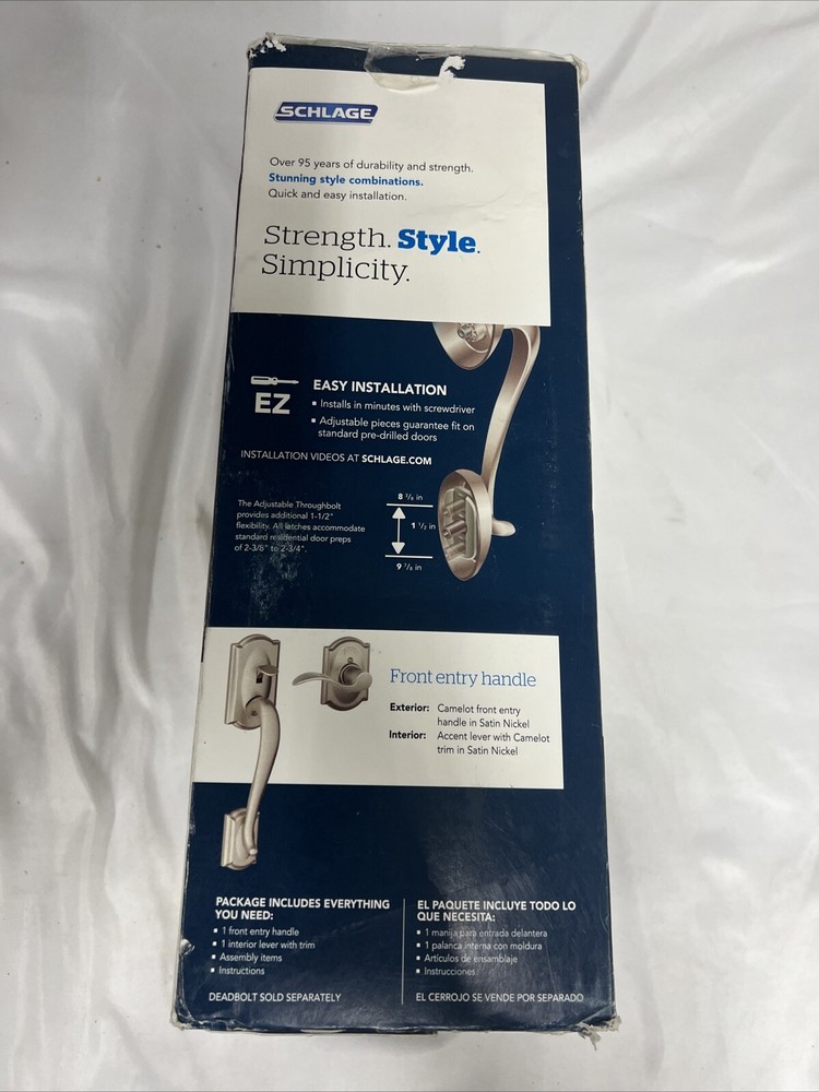 MPN: FE285CAM619FLALH Item Length: 3 in Finish: Satin Brand: Schlage Item Height: 12 in Style: Traditional Number in Pack: 1 Features: Keyless, Easy to Install, Adjustable Backset, Residential, Interior, Exterior Material: Stainless Steel, Brass, Nickel Fixings Supplied: Yes Suitable For: Front Entrance Door, Front Door Item Width: 3 in UPC: 0043156059355 Model: FE285CAM619FLALH Color: Silver Items Included: Drilling Template, Hardware, Instructions Type: Door Handleset gtin13: 0043156059355 Item Weight: 5 lb Door Handing: Left and Right-Hand/Outswing