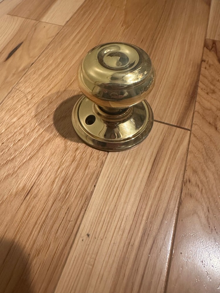 Light wear on these Georgian knobs by Schlage which are from the 1990s. Polished brass. Condition is quite good with minimal wear. Non-turning dummy knobs.