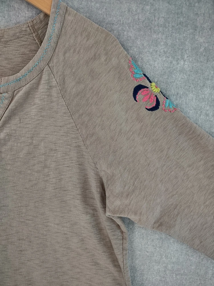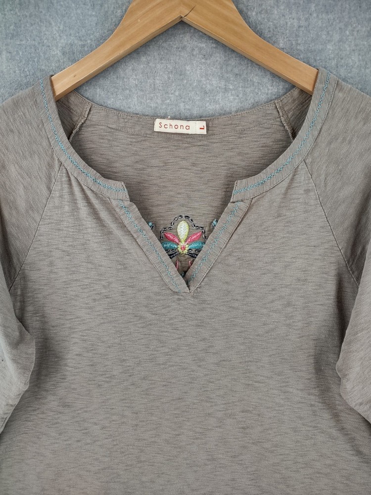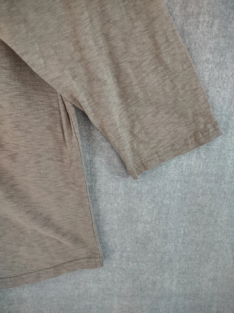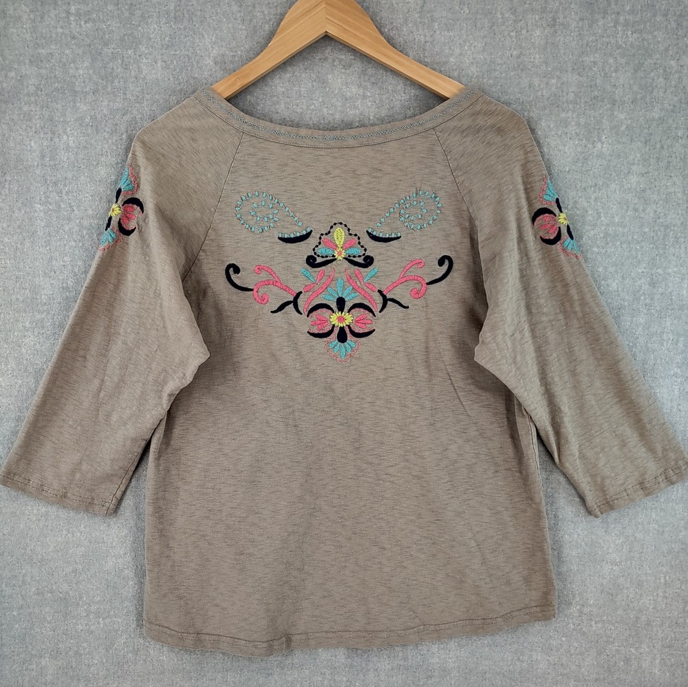 Welcome to Aspen Crossing, your destination for modern western bohemian style reflecting the rugged beauty of our American West. Schona Top Womens Large Bohemian Embroidered Woven Slub Cotton 3/4 Sleeve Split V-neck Taupe Beige 25.5" LENGTH: Measured from the top of the shoulder to the hem. 20.2" CHEST WIDTH: Underarm to underarm, measured flat from left to right. It is always best to compare the measurements above with a top that fits you comfortably. CONDITION - Good pre-owned condition. Pinhole on the sleeve, hole repair on front. All items are cleaned per EBAY standards. Not spot treated. See the photo gallery to view this items measurements and condition. SHIPPED - USPS First Class Mail unless item weight requires priority mail. RETURNS accepted, must be returned within 30 days in original condition to receive a full refund. SHIPPING AND HANDLING We ship all packages within five business days Monday through Friday except Holidays. Consolidated shipping is available for multiple purchases. Thank you for helping our planet and buying previously owned and loved items. I am grateful for your business. Enjoy! Check out our eBay store and follow us. There are new listings daily. CUSTOM SKU: Disclaimer: While we make every effort to capture the most accurate depiction of every item when photographing, colors may vary from screen display to in person therefore we cannot guarantee exact shade on any item. Message us if you have questions.