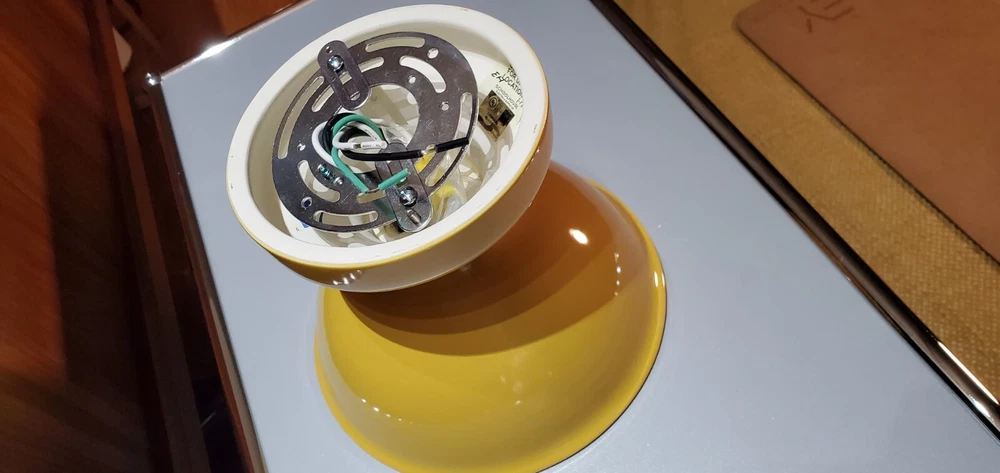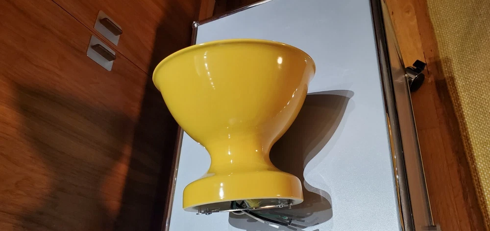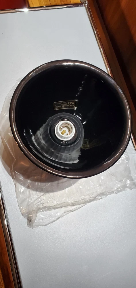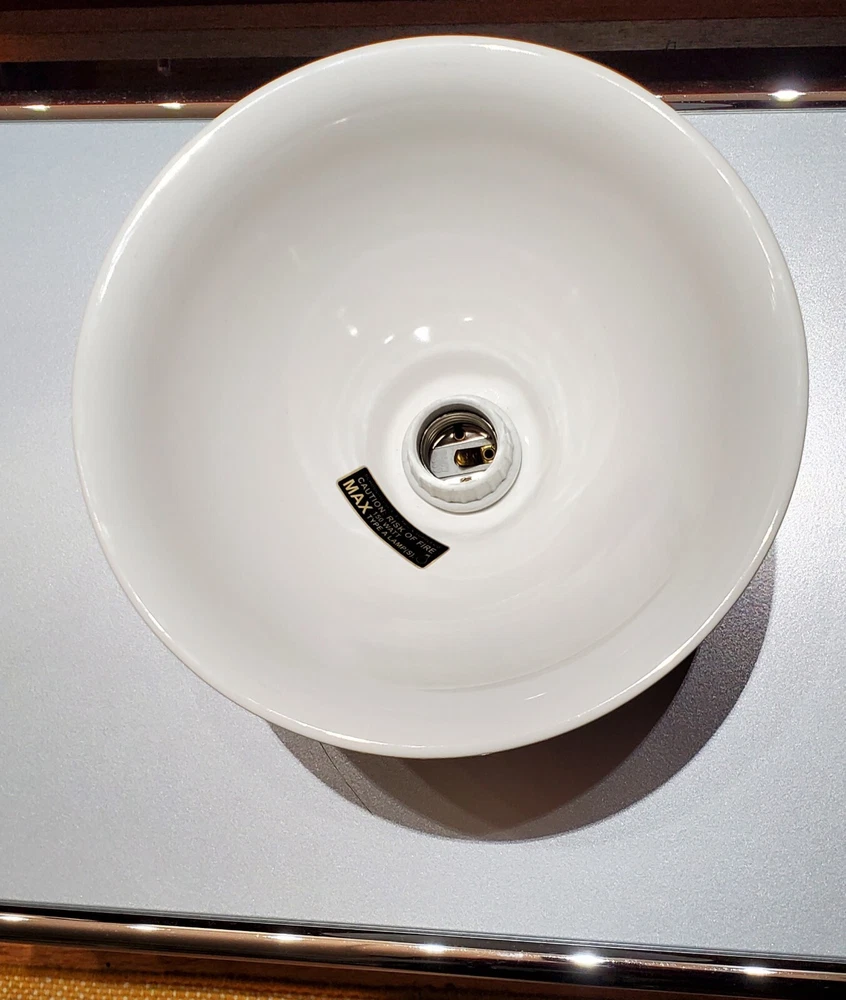 Schoolhouse Alabax Surface Mount Ceramic Light Fixtures Schoolhouse ceramic lighting fixtures available in three colors, white, black, and chamomile yellow. Expertly cast and glazed by hand. Inspired by fixtures found in General Electric industrial catalogs from the 1950s. This beautiful fixture goes well with Mid Century Modern, Industrial, Farmhouse, Ranch Style, Bauhaus, Contemporary Modern, Eames Style, and MCM. The quality is very similar to brands like flos artemide luceplan fontana arte hay menu muuto hem Stockholm lighting. These fixtures were ordered for NYC Industrial Loft project in Tribeca. The interior designer ordered too many. Brand new in box. Never mounted or installed. Complete with hardware and screws and ready to install. Max 150 watt type A lamp. Porcelain socket. Please use a licensed electrician to install. Since this is a handmade product, there will be slight range in color, glaze thickness, and overall opaqueness. Dimensions: Shade Width: 8.25" Total Height: 7" Ceiling Canopy: 5.75" Price is per lamp. Quantity 1. Please specify which color. White Quantity: 20 Fixtures Chamomile Yellow Quantity: 20 Fixtures Black Quantity: 20 Fixtures