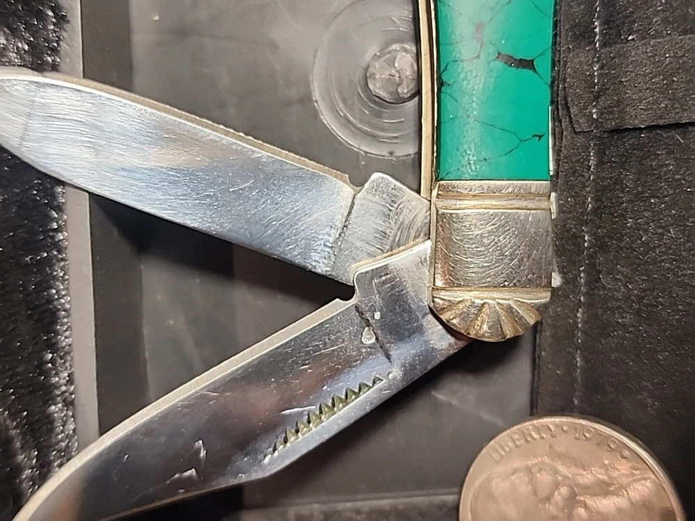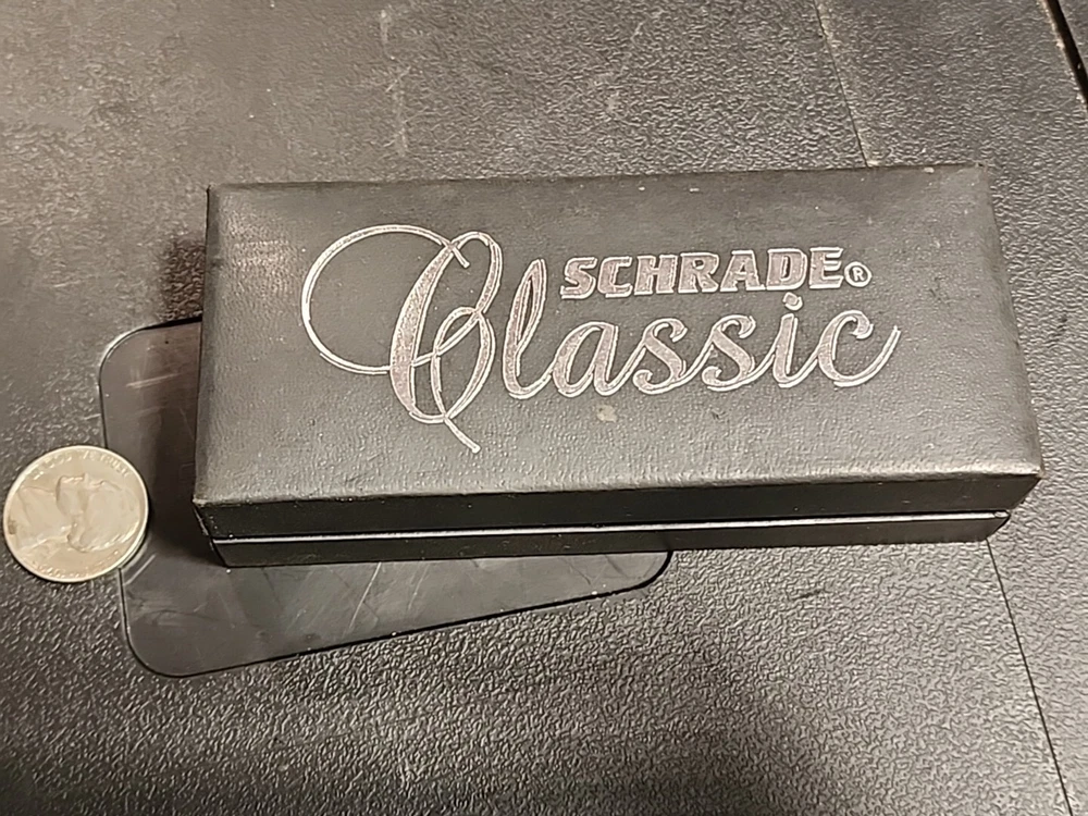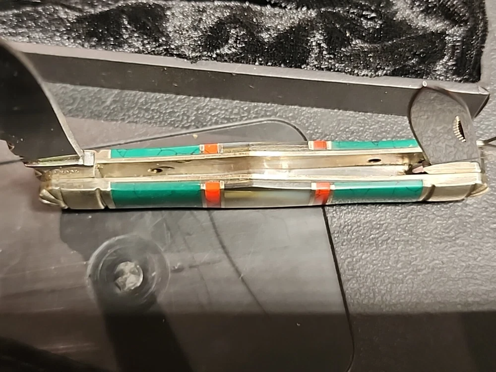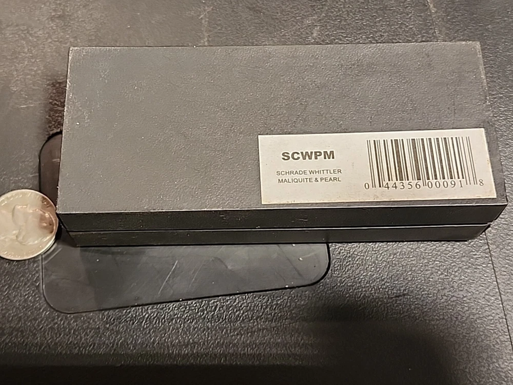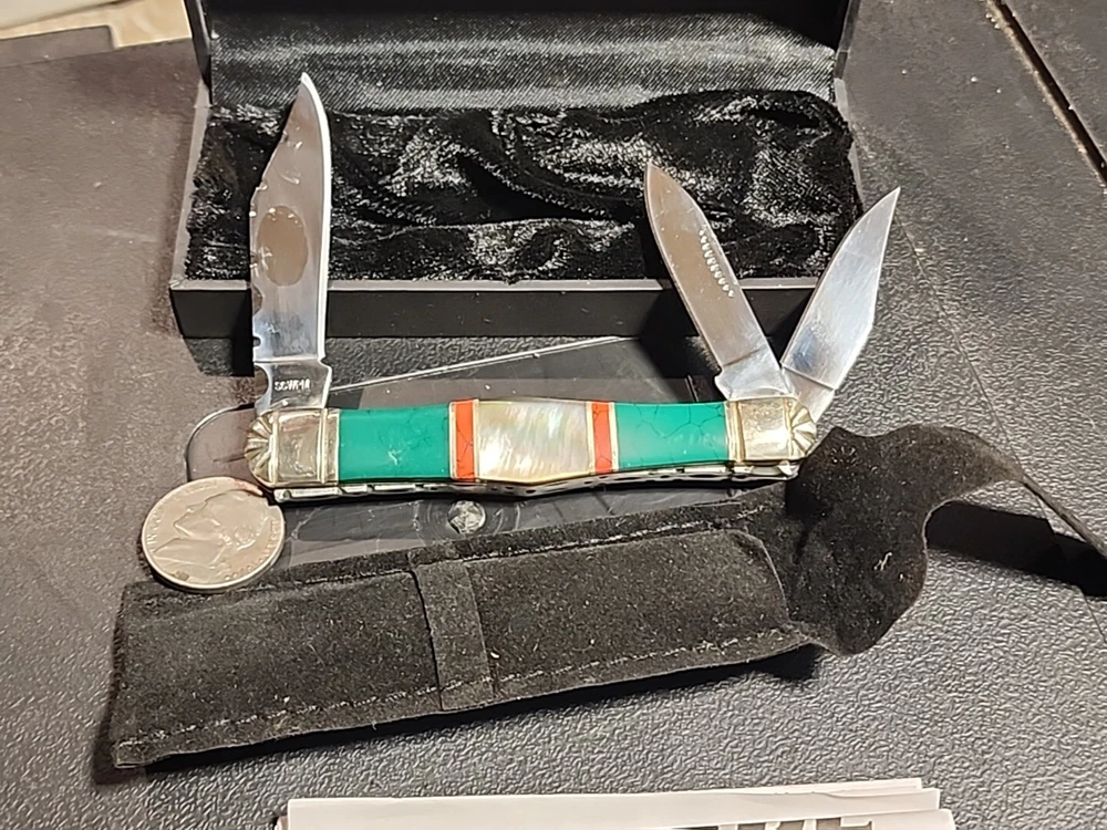 Schrade Classic Custom Whittler Maliquite & Pearl SCWPM Folding Pocket Knife New with paperwork 3 1/2" closed Stainless steel blades, large blade has fancy filework on top, green maliquite & pearl handles with red maliquite spacers, decorative bolsters, and fancy filework on backspring. Never Used, stored in temp and humidity controlled vault. Photos are of actual item please use them as part of my description.
