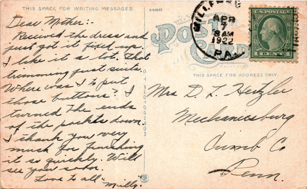 MAKE AN OFFER. THE MORE YOU BUY THE BETTER DEAL I WILL ACCEPT The postcard features a photograph of the Science Building at the State Normal School in Millersville, Pennsylvania. The sender mentions receiving a dress, fixing it up, and liking the trimming. They inquire about the placement of buttons and mention someone turning the ends of the packts down. The postcard is addressed to Mrs. D. J.