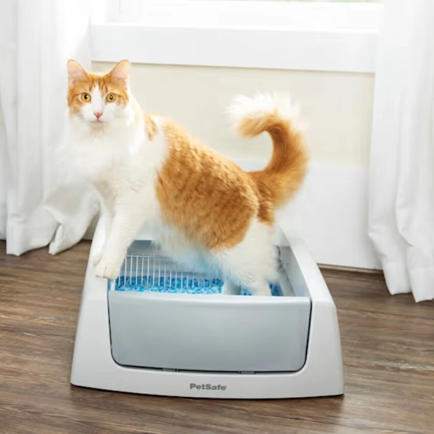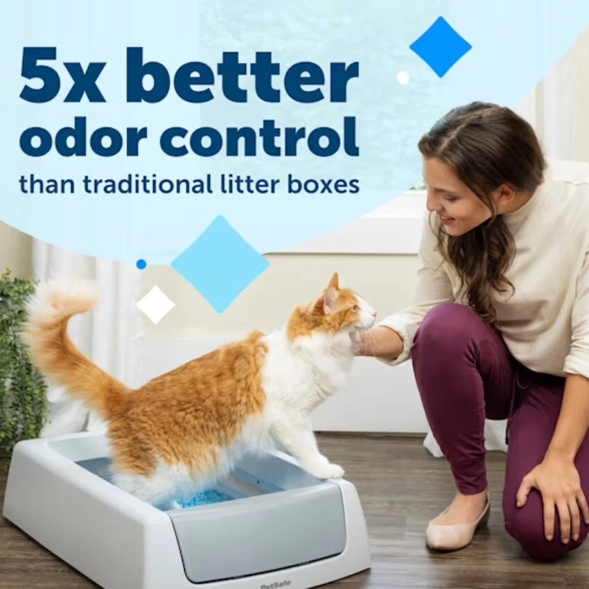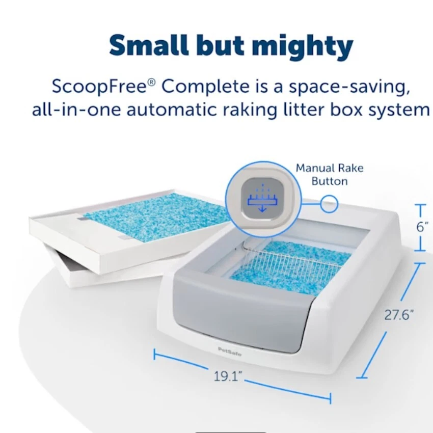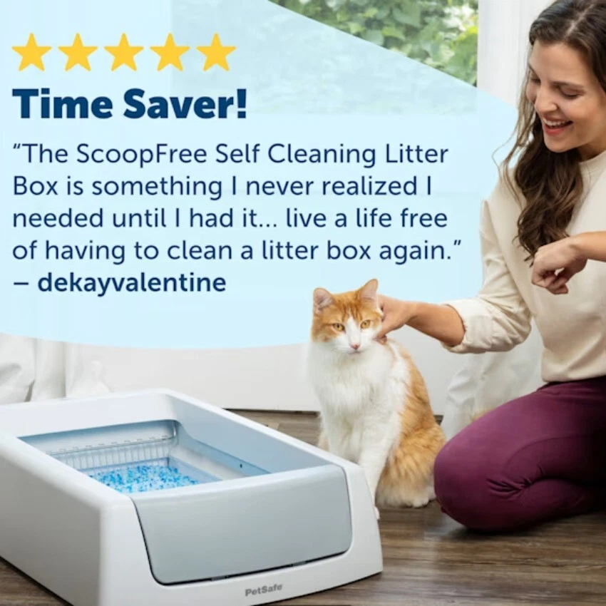 ScoopFree Crystal Classic Self-Cleaning Litter Box Overview: Say goodbye to the hassle of scooping litter! The ScoopFree Crystal Classic Self-Cleaning Litter Box allows you to forget about scooping, cleaning, or refilling your cat's litter box for weeks at a time. This innovative litter box utilizes crystal litter, which offers five times better odor control compared to traditional clumping litter. The crystal litter effectively absorbs urine and dehydrates solid waste, keeping your home smelling fresh. Key Features: Effortless Maintenance: Enjoy weeks without the need for scooping, cleaning, or refilling your cat's litter box. Exceptional Odor Control: The crystal litter neutralizes odors by absorbing urine and dehydrating waste. Each unit comes with one disposable ScoopFree Complete litter tray pre-filled with crystal litter. Mess-Free Floors: The low-tracking crystal litter is 99% dust-free and doesn't cling to your cat's paws, helping to keep your floors clean. Leak Protection: Disposable trays feature a plastic lining to prevent leaks, ensuring your floors stay spotless. Simple Cleanup: When it's time to clean, just remove the tray and toss it away. Each tray includes a lid for convenient disposal. Safety Warning: This product may expose you to chemicals, including Amorphous Silica, which is known to the State of California to cause cancer. With the ScoopFree Crystal Classic Self-Cleaning Litter Box, you and your cat can enjoy a cleaner, more pleasant environment with minimal effort!