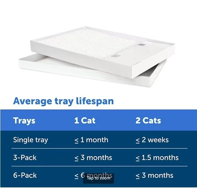 ScoopFree by PetSafe Sensitive Disposable Crystal Cat Litter Tray, Pack of 6 Keep your home clean and your cat happy with the PetSafe ScoopFree Sensitive Crystal Cat Litter Tray, designed for use with the PetSafe ScoopFree Self-Cleaning Cat Litter Box. These completely disposable trays eliminate the need to see, touch, or smell messy waste. Simply replace the tray every few weeks, and your litter box will feel like new. Each tray comes pre-filled with Sensitive Crystals cat litter, free from perfumes and dyes, offering superior odor control compared to traditional clay or clumping litters. The low-tracking, odor-reducing crystal litter helps maintain a fresh-smelling, litter-free home. Key Features Superior Odor Control: Crystals absorb moisture and dehydrate solid waste to neutralize odors. Covered trap locks away solid waste for a cleaner, hands-free experience No Perfumes or Dyes: Ideal for cats and people with sensitivities, completely fragrance- and dye-free Less Mess: Low-tracking crystals reduce litter on floors and paws; 99% dust-free formula Leak Protection: Plastic tray lining adds an extra barrier to prevent leaks Easy Disposal: No scooping required—simply remove the disposable tray and discard How It Works The crystals absorb urine and odors while dehydrating solid waste to keep the litter box fresh. Tips for Longer Tray Life Avoid high-humidity areas: Place the litter box away from bathrooms, basements, or other humid locations, as excess moisture shortens tray life. A room with moving air (like a fan) helps maintain performance. Even distribution: If your cat favors one spot, gently stir the crystals occasionally to distribute saturated crystals. Diet considerations: Cats on high-fiber or high-ash diets may produce more solid waste, filling the tray faster. Switching to a diet without byproducts or fillers can help extend tray life.