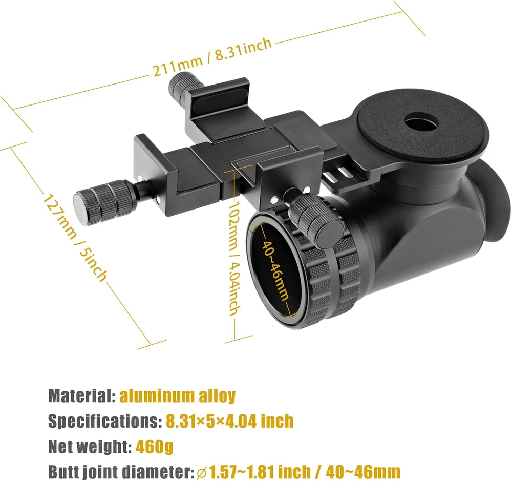 Store New Arrivals Add to Favorite View Feedback Contact Scope Side Camera Adapter Bracket - to Be Used with Phone - for Outdoor Scenes Description Mounting Type Tabletop Mount Color Black Compatible Devices Cameras Item Weight 2.33 pounds Special features Lightweight Package Dimensions 10.2 x 8.19 x 3.27 inches Compatible Phone Models GoPro 【Versatile Compatibility】- Compatible with most cellphones (maximum distance between bottom position of phone and topmost camera is 5.91 inches), and fits eyepieces with an outer diameter of 40-46mm. 【Perfect Clarity】- Enjoy perfectly clear and visible images with the side camera that matches 50% to the camera (reflective) and 50% to your eyes (transmissive). Comes with a 0-coil eye rubber cap for low light or poor vision. 【Improved Image Quality】- The built-in beamsplitter design enhances overall image quality for optimal viewing. 【Complete Package】- Includes 1 Universal CellPhone Telescope Mount and 6 different scope adapters (41-46mm), as well as a beamsplitter lens and eye rubber cap for comprehensive use. 【Durable Build】- Made with high-temperature resistant aluminum, this mount is built to withstand everyday wear and tear while keeping your phone securely in place. Introducing the SKYJFFJ Universal CellPhone Telescope Adapter Mount - the perfect solution for capturing stunning long-range shots right from your smartphone! With a durable and lightweight aluminum construction, this adapter works with almost any cell phone and supports scope eyepiece diameters ranging from 40 to 46mm. The kit includes six different scope adapters (ranging from 41mm to 46mm), as well as a beamsplitter lens and 0-coil eye rubber cap to enhance your viewing experience. The versatility of this adapter mount makes it great for outdoor enthusiasts, bird watchers, and photographers alike. The SKYJFFJ Universal CellPhone Telescope Adapter Mount is small enough to take on the go, yet powerful enough to transform your smartphone into a high-quality camera. Set up is quick and easy - simply attach the adapter to your phone and your scope and you're ready to capture stunning long-range shots,Don't miss out on capturing life's most beautiful moments. ABOUT US We offer the best prices around on high quality products. Our E-store includes media such as books, movies, music and games while offering electronics, toys, sporting apparel, clothing, tools, general home, garden items and more. SHIPPING We are always working hard to ensure your package arrives as soon as possible. Please understand that some factors like weather, high postal traffic, and the performance of shipping companies are outside of our control. We offer free shipping to the lower 48 states and ship within 2 business days of payment, usually sooner. We do not accept P.O. Boxes. Please provide a physical address. For shipping outside of the continental USA, we only use eBay's Global Shipping Program.The item is shipped to KY and then sent to the rest of the world. International customers are responsible for all duties and taxes. Continue to check out in order to calculate costs for shipping the item to your country. Messages regarding eBay's Global Shipping Program MUST be directed at eBay EXCLUSIVELY. RETURNS We offer a 30-Day Return Policy on items which you are not completely satisfied with. You have the option for a full-refund or an exchange of the item. No returns are available on items shipped outside of the USA. PAYMENT We accept PayPal. CONTACT US This page content is yet to come Please ad us to your favorite seller and visit again later Thank You CUSTOMER SATISFACTION We try our very best to make sure every customer is completely satisfied. If there's a problem, message us! We're happy to help. WE ACCEPT Copyright © 2021 AutoDS. | All Rights Reserved