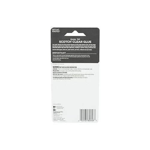Scotch Clear Glue in 2 way Applicator precisely dispenses just the right amount of glue. Use the dauber end when you need to cover a large area, and use the precision tip for accuracy and expert results. Permanent adhesive dries clear. Photo safe and non toxic. Great for most papers, foam core, poster boards, card stock, cardboard, and most woods. Excellent for paper and craft projects and more. Two-way dispensing - better control than ordinary white glue Goes on clear, dries clear Sets in 5 minutes when applied in a thin, uniform coat Photo safe and non-toxic Great for paper and craft projects and more