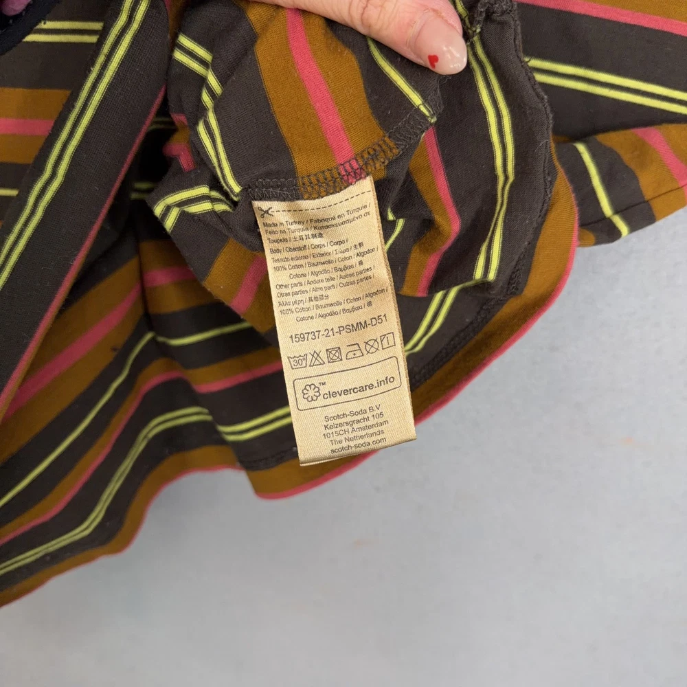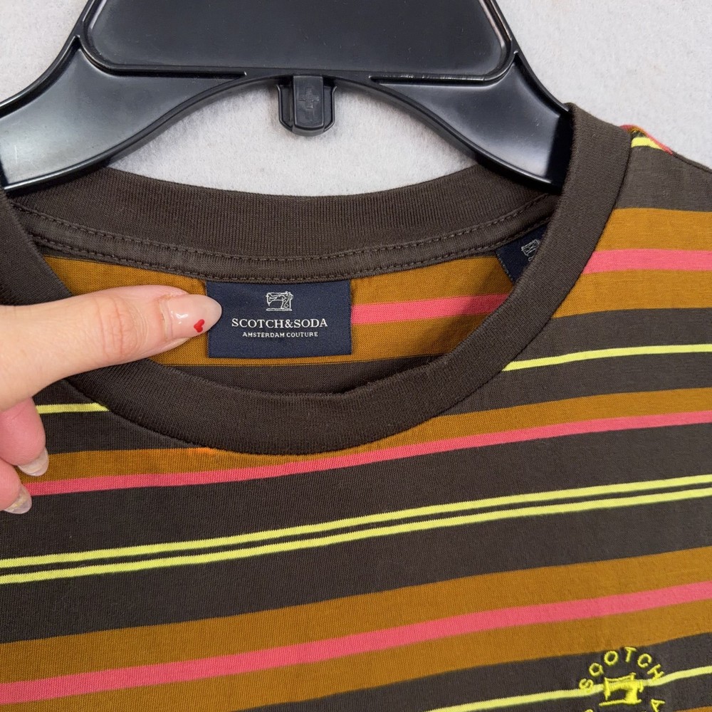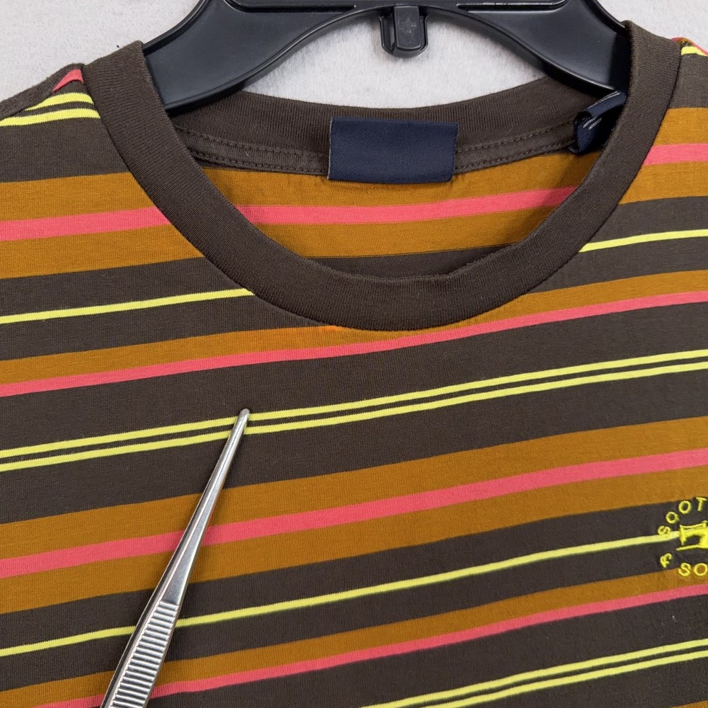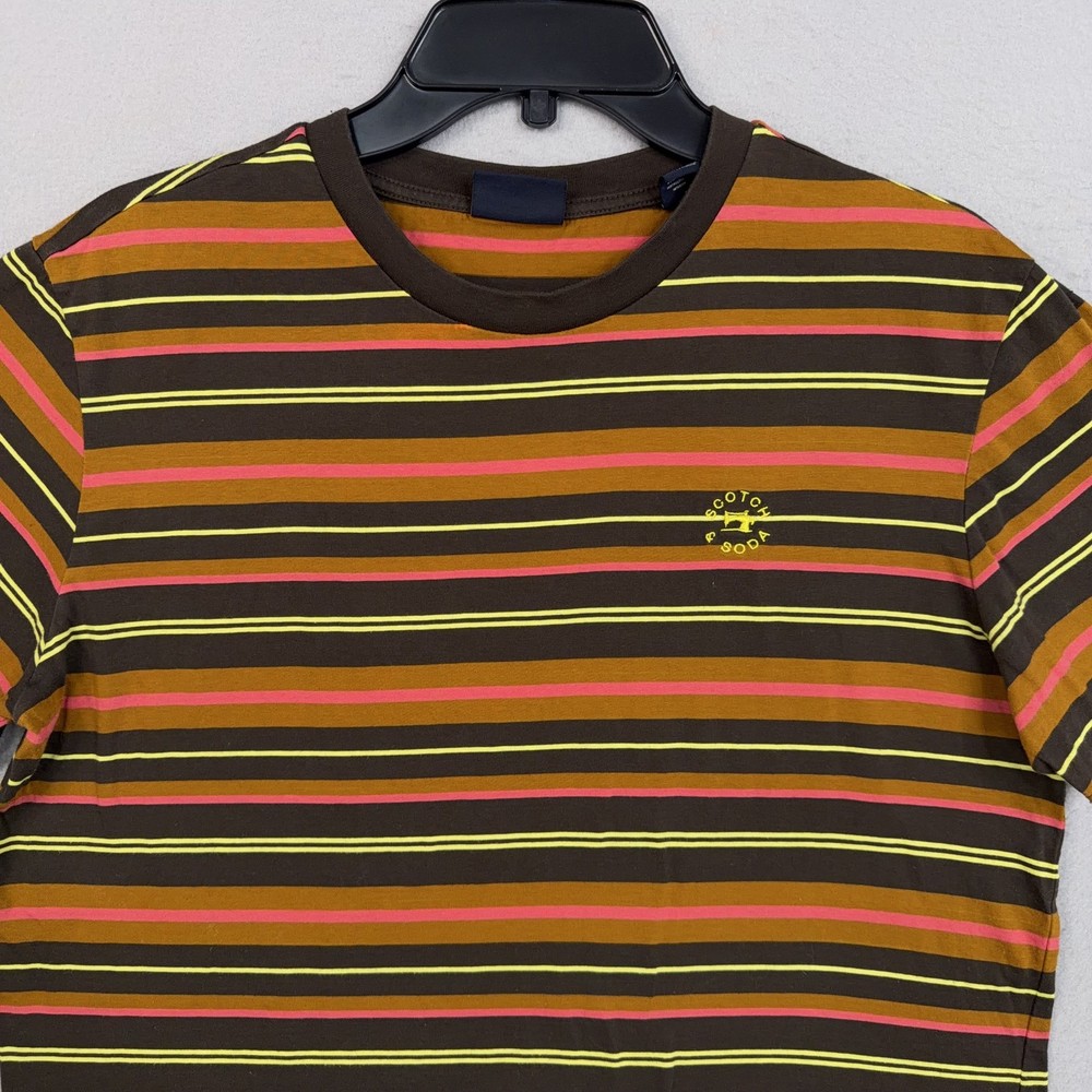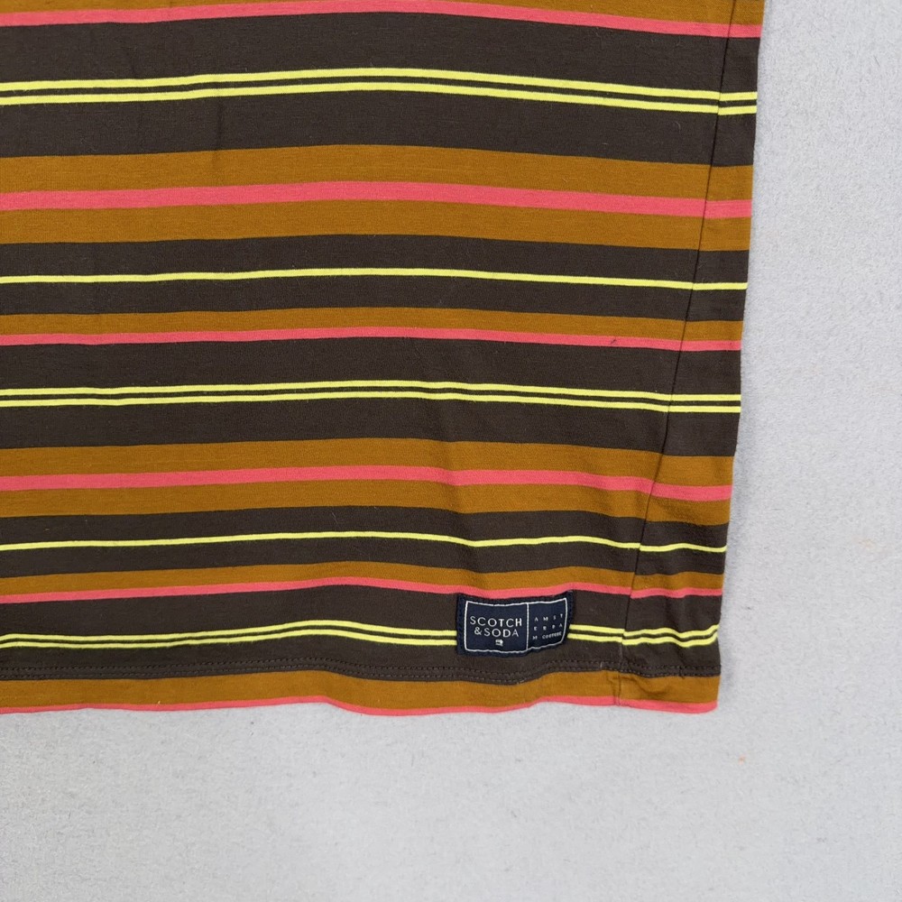 Scotch & Soda Shirt Mens Medium Multicolor Stripe Logo Crewneck Cotton Tee Pre-owned Scotch & Soda striped cotton shirt with light overall wear from prior use. Fabric is soft and structurally intact with crew neckline, sleeves, and hem retaining shape. Very small pinhole is present on the upper front chest near the neckline as highlighted in photos; no other marks or damage visible. Interior size and care tags are present; no original retail tags or packaging included. Brand: Scotch & Soda. Style: Mens short sleeve crewneck striped t-shirt. Color: Multicolor stripe pattern with brown base and yellow, pink, and orange stripes. Size: Mens Medium per interior neck size tag. Material: 100% cotton per interior content tag. Fabric type: Soft lightweight jersey knit suitable for all-season wear. Details: Short sleeves, ribbed crew neckline, straight hem, and regular fit silhouette. Features: Horizontal multicolor stripe pattern, small circular Scotch & Soda logo print at left chest, and woven logo patch at front hem. Branding and logos: Woven Scotch & Soda Amsterdam Couture neck label, printed chest logo, and woven hem label. Country of origin: Made in Turkey as indicated on the interior care tag. Tag information: Interior care label lists 100% cotton fabrication, care symbols, and style code 159737-21-PSMM-D51. Intended use: Ideal for casual everyday wear, warm-weather outfits, or layering under jackets and overshirts. Special notes: Modern Scotch & Soda striped tee with colorful retro-inspired palette and subtle branded details. 25691 Measurements: Previous washings may change sizing on the tag. Refer to photos above for all measurements. Compare our measurements to one of your favorite garments. Measurements are approximate. All items are bagged and sealed after being photographed, then stored in a smoke free environment. Washed per eBay standards. I carefully package and ship daily. Contact me with any questions. Thanks