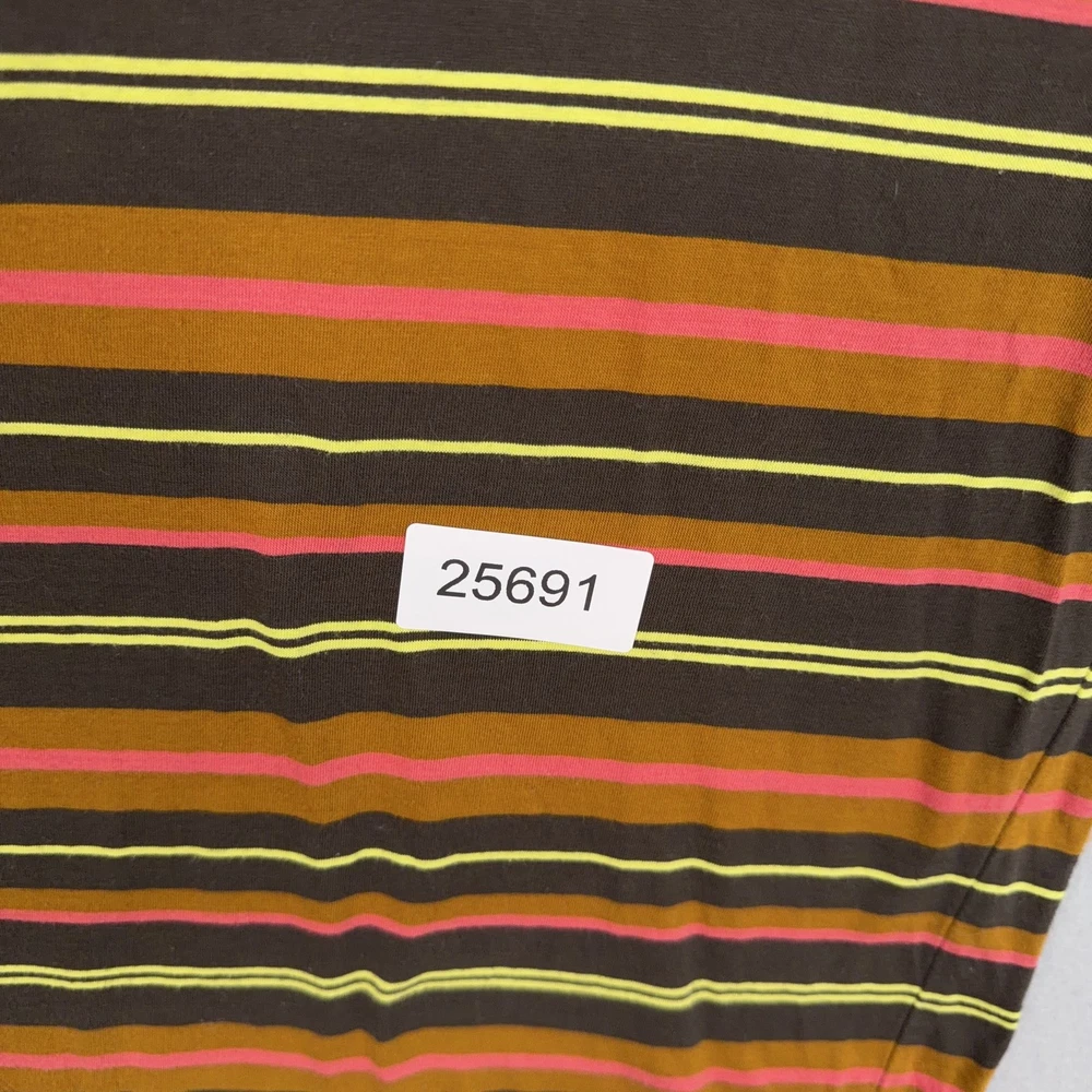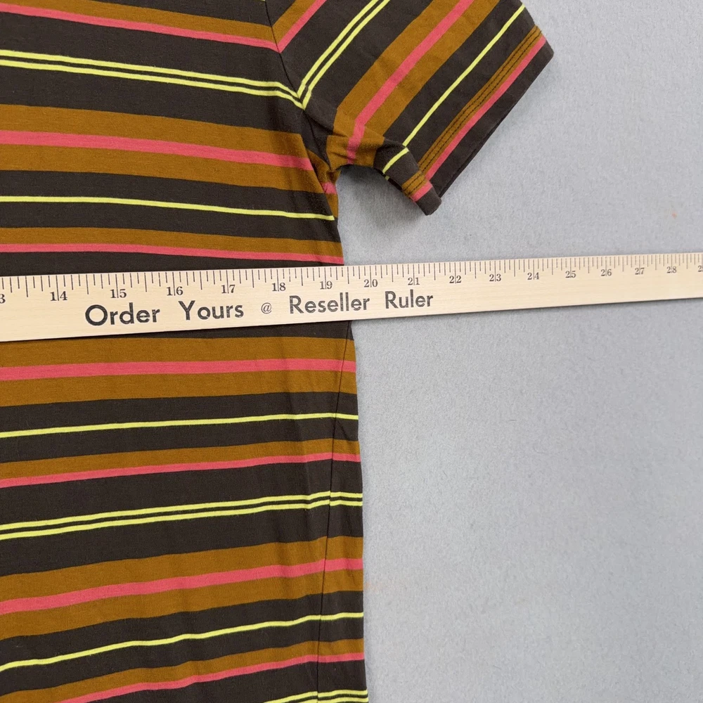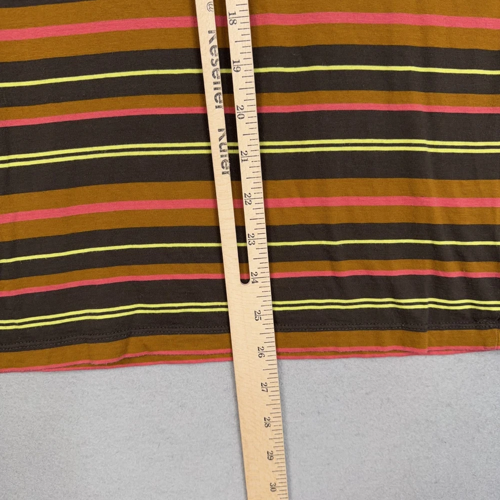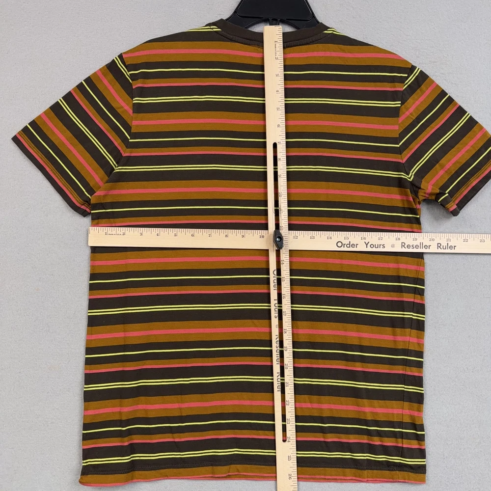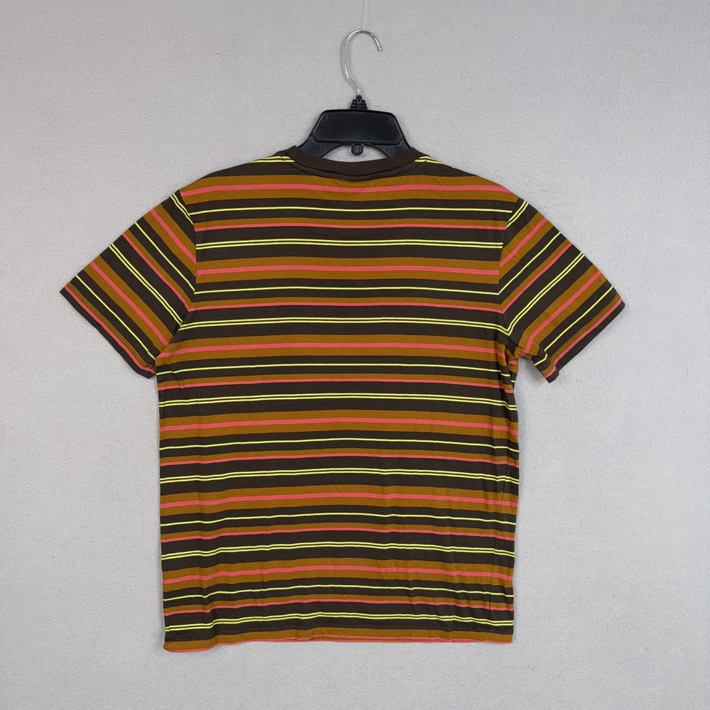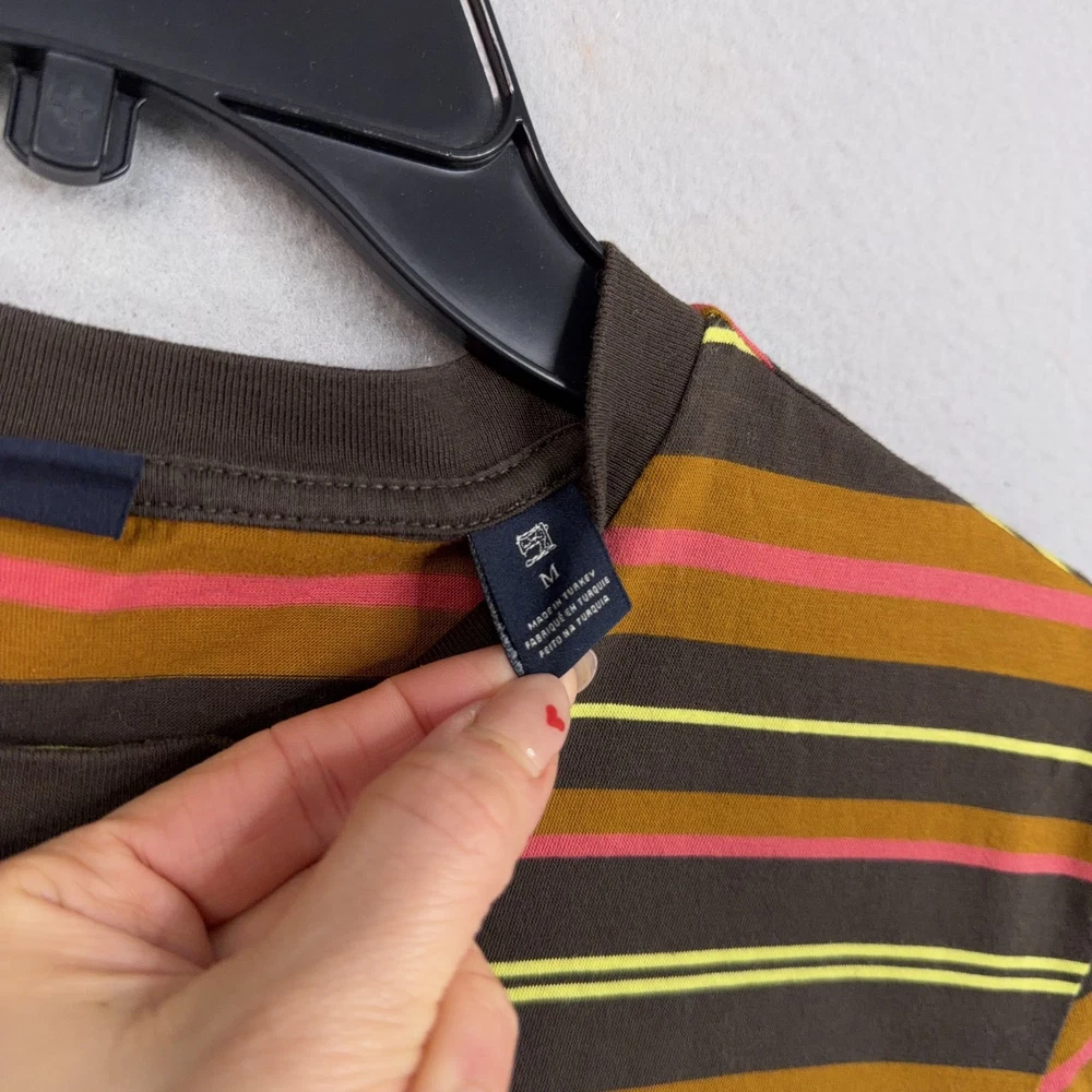 Scotch & Soda Shirt Mens Medium Multicolor Stripe Logo Crewneck Cotton Tee Pre-owned Scotch & Soda striped cotton shirt with light overall wear from prior use. Fabric is soft and structurally intact with crew neckline, sleeves, and hem retaining shape. Very small pinhole is present on the upper front chest near the neckline as highlighted in photos; no other marks or damage visible. Interior size and care tags are present; no original retail tags or packaging included. Brand: Scotch & Soda. Style: Mens short sleeve crewneck striped t-shirt. Color: Multicolor stripe pattern with brown base and yellow, pink, and orange stripes. Size: Mens Medium per interior neck size tag. Material: 100% cotton per interior content tag. Fabric type: Soft lightweight jersey knit suitable for all-season wear. Details: Short sleeves, ribbed crew neckline, straight hem, and regular fit silhouette. Features: Horizontal multicolor stripe pattern, small circular Scotch & Soda logo print at left chest, and woven logo patch at front hem. Branding and logos: Woven Scotch & Soda Amsterdam Couture neck label, printed chest logo, and woven hem label. Country of origin: Made in Turkey as indicated on the interior care tag. Tag information: Interior care label lists 100% cotton fabrication, care symbols, and style code 159737-21-PSMM-D51. Intended use: Ideal for casual everyday wear, warm-weather outfits, or layering under jackets and overshirts. Special notes: Modern Scotch & Soda striped tee with colorful retro-inspired palette and subtle branded details. 25691 Measurements: Previous washings may change sizing on the tag. Refer to photos above for all measurements. Compare our measurements to one of your favorite garments. Measurements are approximate. All items are bagged and sealed after being photographed, then stored in a smoke free environment. Washed per eBay standards. I carefully package and ship daily. Contact me with any questions. Thanks
