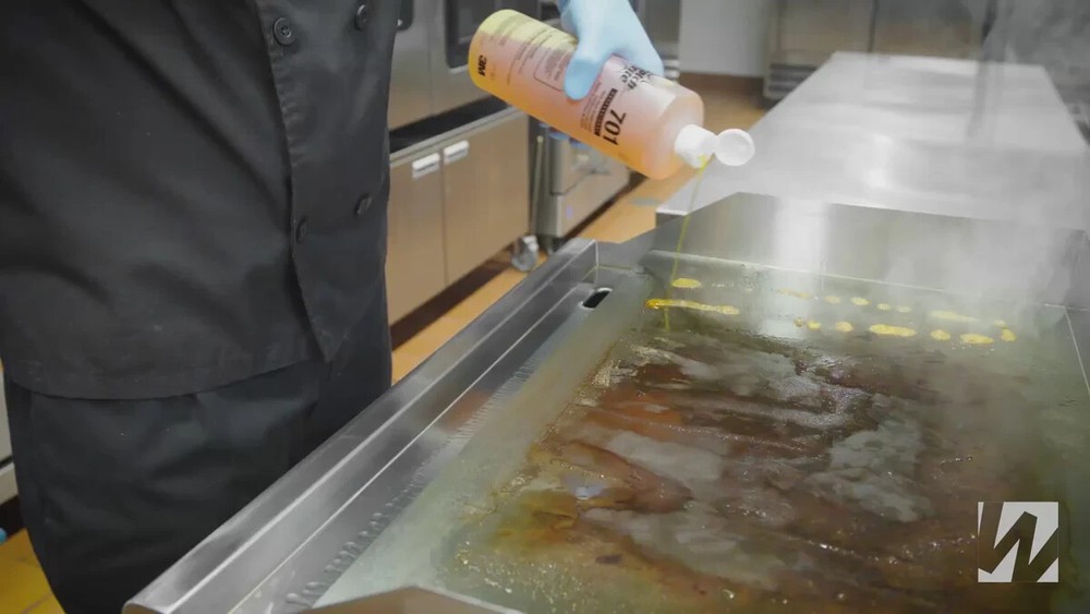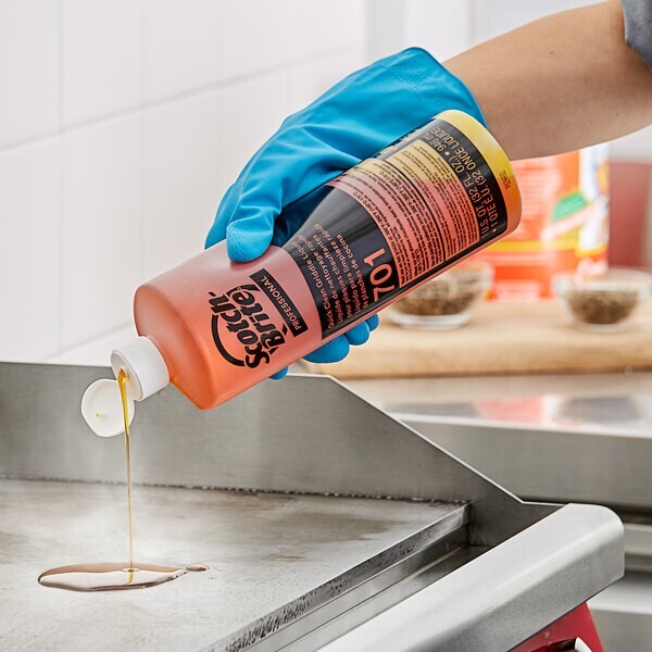 The Scotch-Brite 701 Liquid 1 Qt. Griddle Cleaner and Degreaser is a powerful cleaning solution designed specifically for griddles, ranges, and ovens. Its orange color and compact size make it easy to use and store. This degreaser from the trusted brand SCOTCH-BRITE effectively removes tough grime and grease, leaving your cooking surfaces sparkling clean. Made in the United States, this griddle cleaner features a convenient bottle design and is perfect for professional use in commercial kitchens and janitorial services.