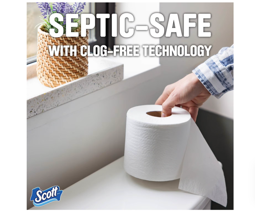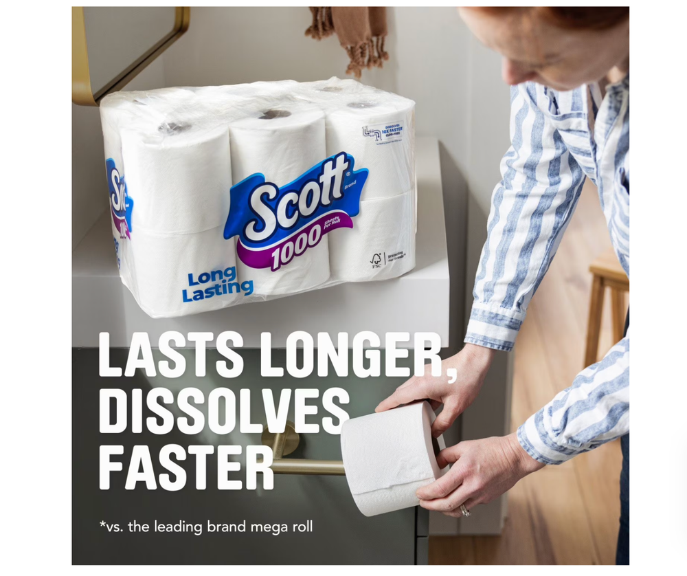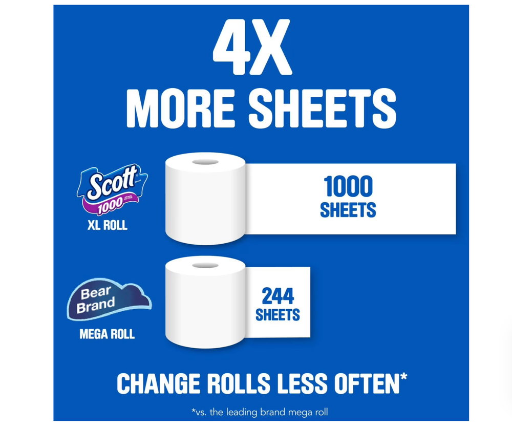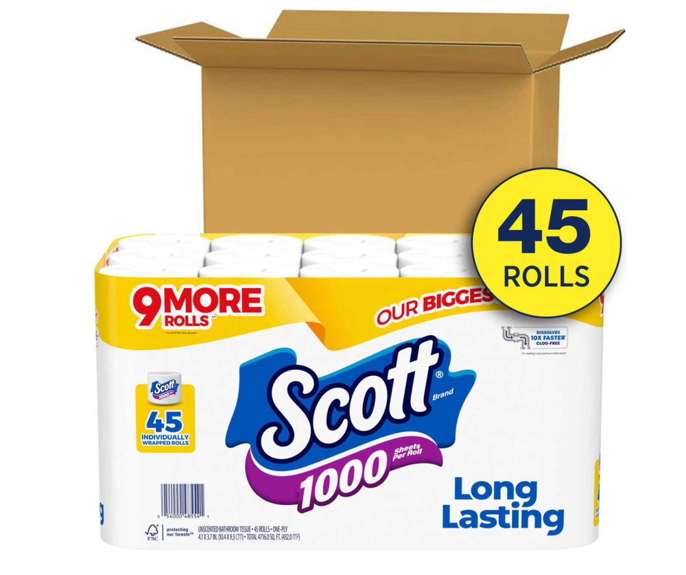 104.80 square feet per roll, 4,896 square feet total Sustainably sourced from responsibly managed forests Recyclable packaging Dissolves 10x faster vs national brand soft & strong mega roll Lasts 2x longer vs national brand soft & strong mega roll Product details Long-Lasting Rolls for Everyday Use Scott 1000 toilet tissue offers exceptional performance and value, making it a reliable choice for your household needs. With 45 rolls per pack and 1000 sheets per roll, you can enjoy fewer roll changes compared to other national brands. Designed for long-lasting use, Scott 1000 ensures you spend more time on what matters most. Flush with Confidence Featuring clog-free technology, Scott 1000 toilet paper dissolves 10 times faster than the national brand soft and strong mega roll. This 1-ply toilet tissue is 100% septic-safe and ideal for low-flow toilets, providing peace of mind with every flush. Whether at home, on a boat, or in an RV, Scott 1000 is a dependable choice for your plumbing system. Convenient Bulk Packaging Scott 1000 toilet tissue is available in bulk, making it easy to stock up for your household. With delivery options to your door or in-store pickup, you can enjoy the convenience of having this essential product readily available. Please note that packaging and product appearance may vary.